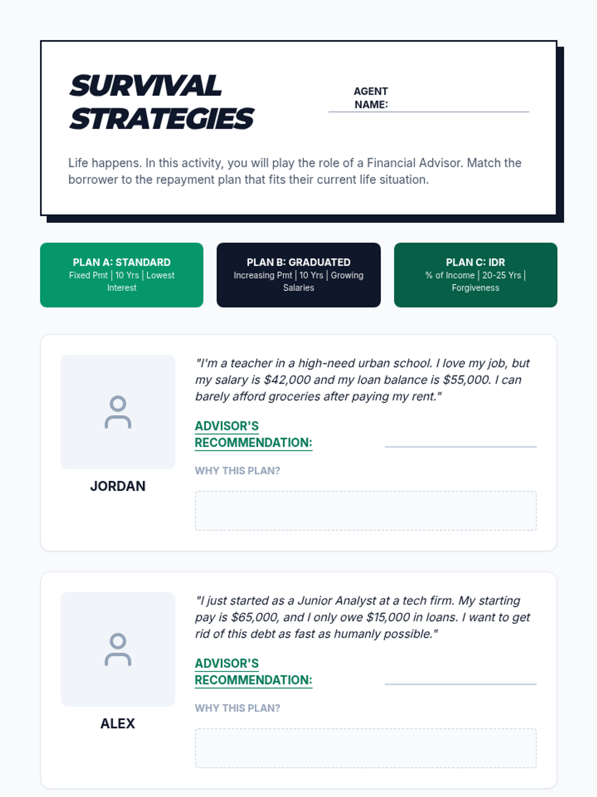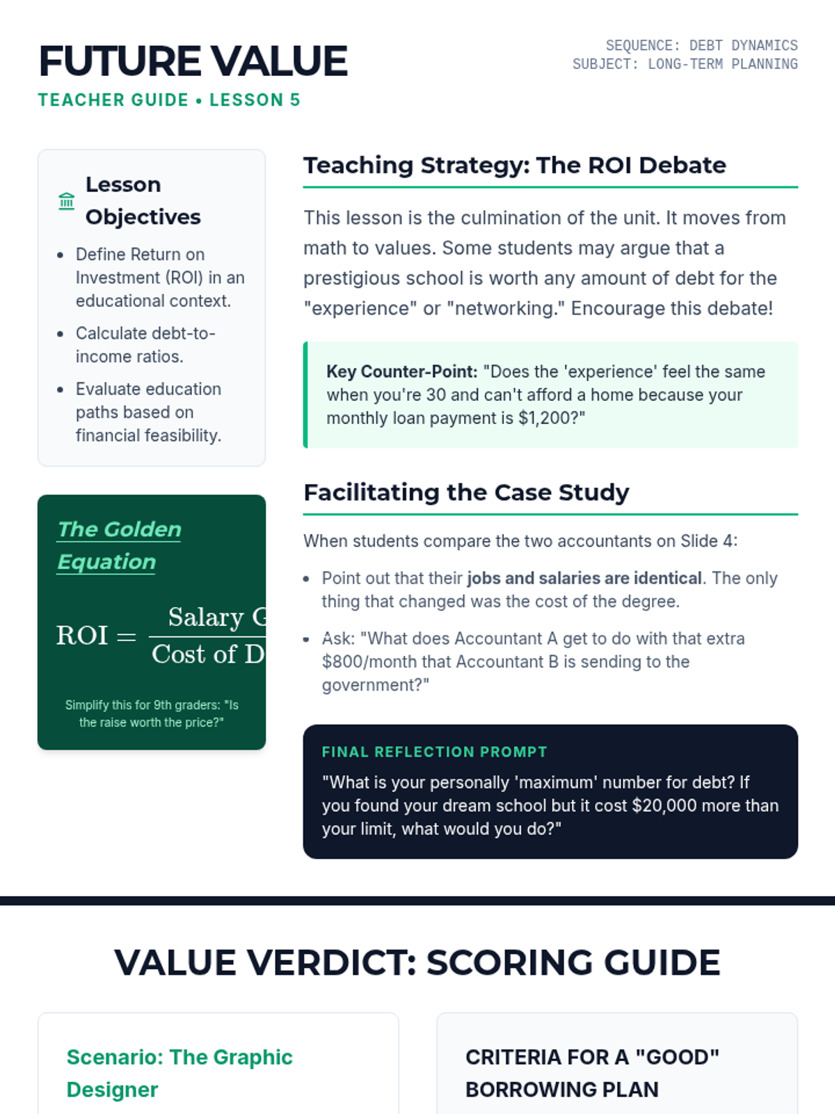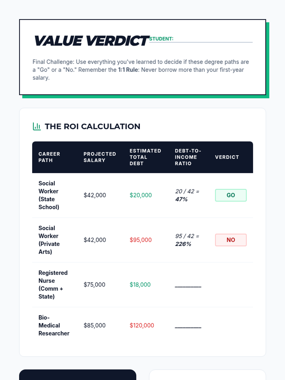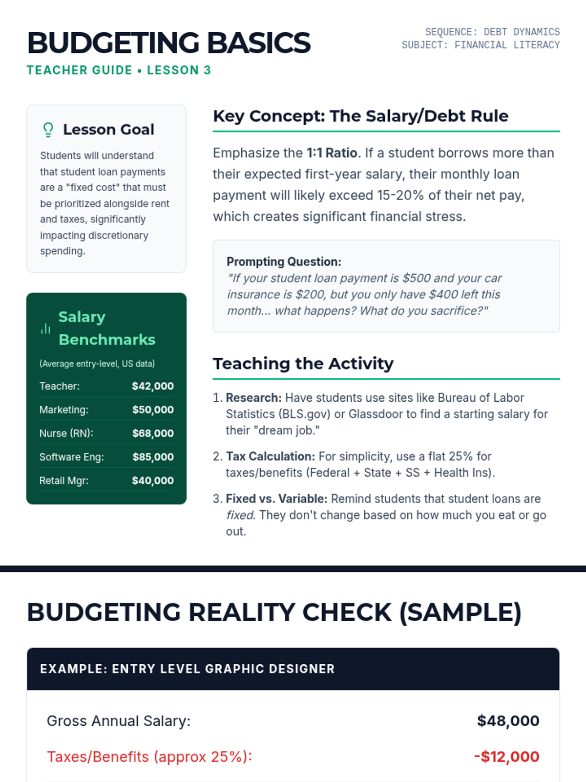 This sequence explores the long-term financial implications of student loans, focusing on repayment plans, budgeting, and return on investment (ROI). Students transition from understanding borrowing mechanics to simulating the real-world impact of debt on lifestyle and career choices.