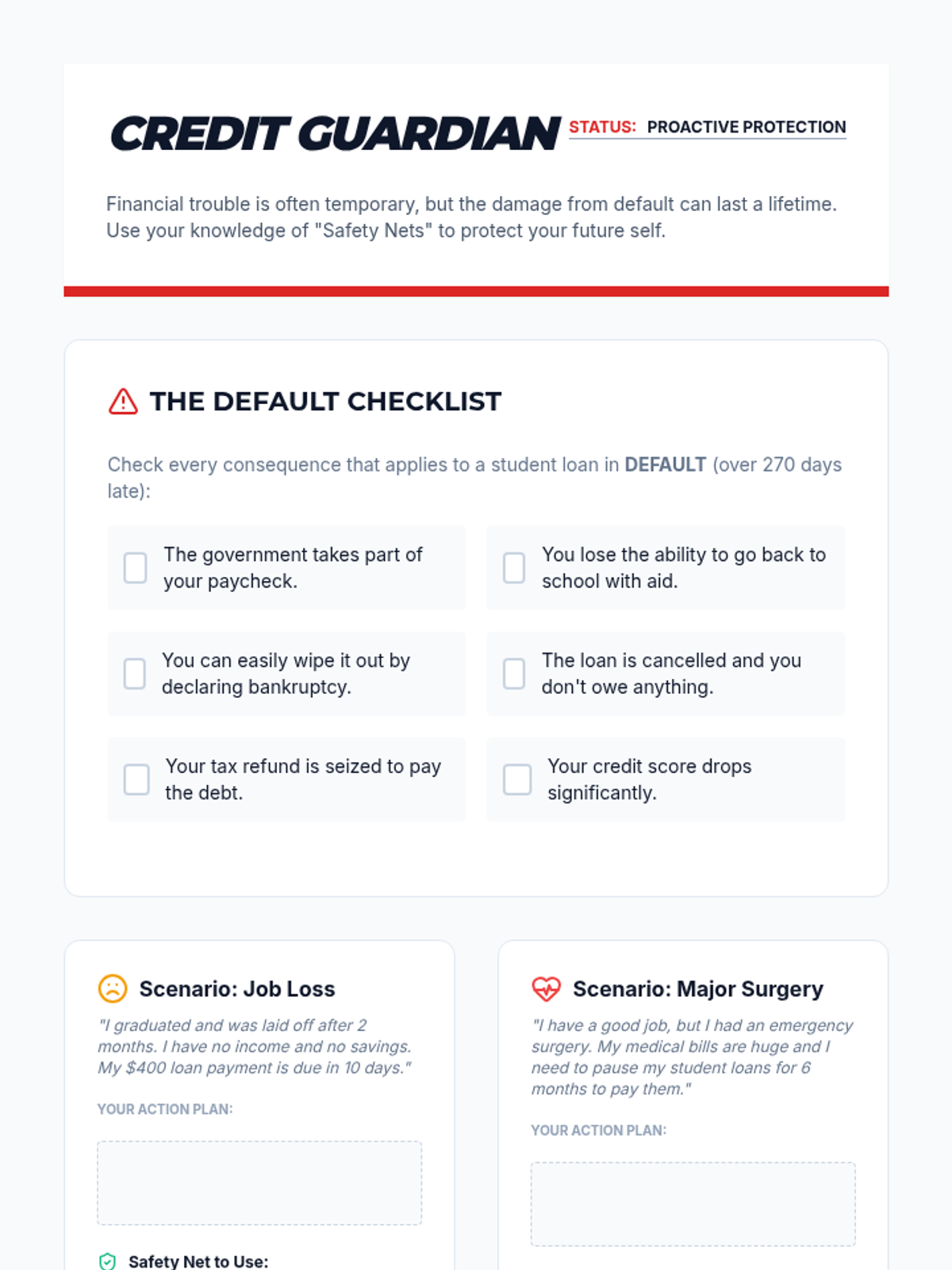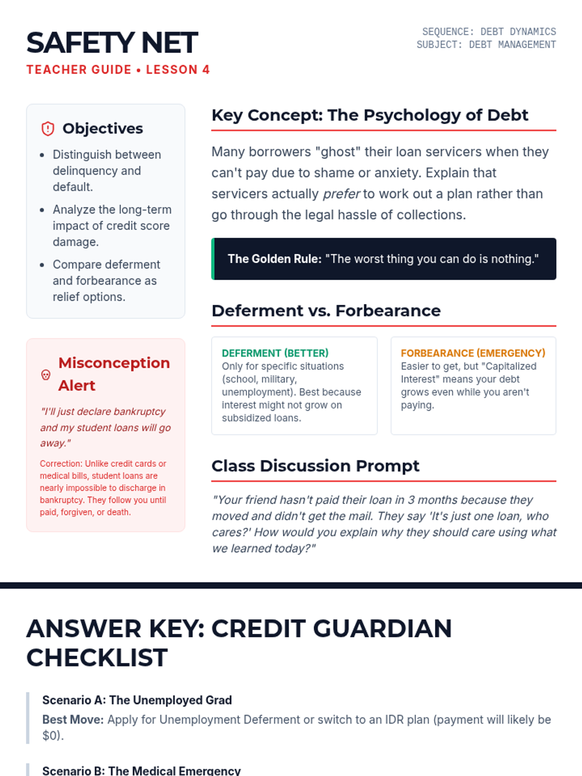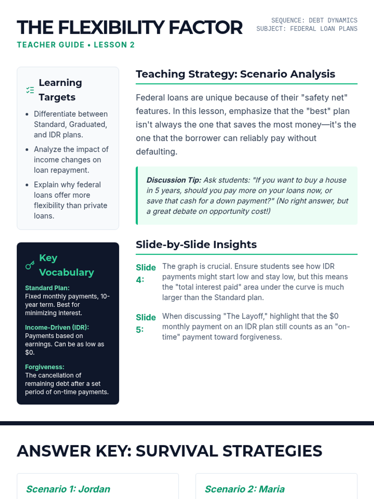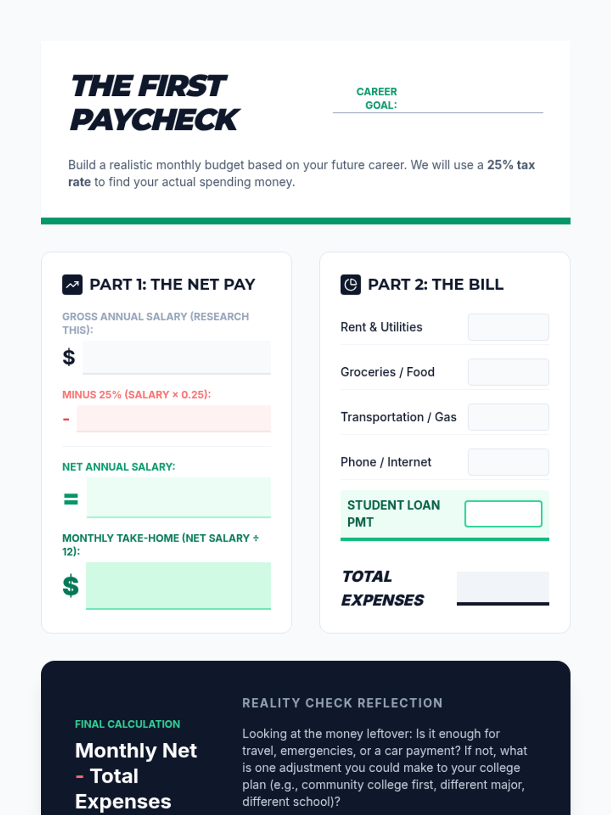 This sequence explores the long-term financial implications of student loans, focusing on repayment plans, budgeting, and return on investment (ROI). Students transition from understanding borrowing mechanics to simulating the real-world impact of debt on lifestyle and career choices.