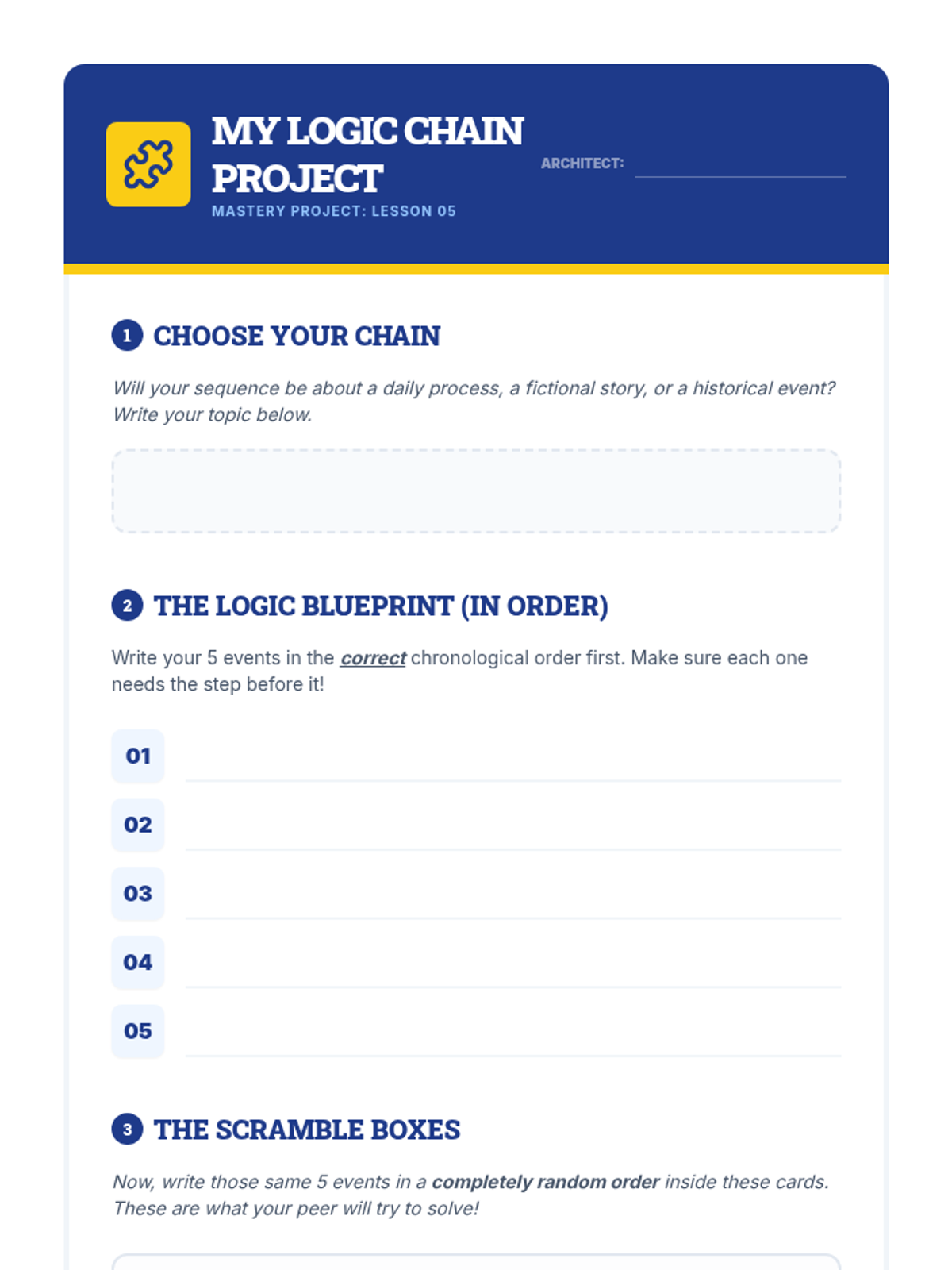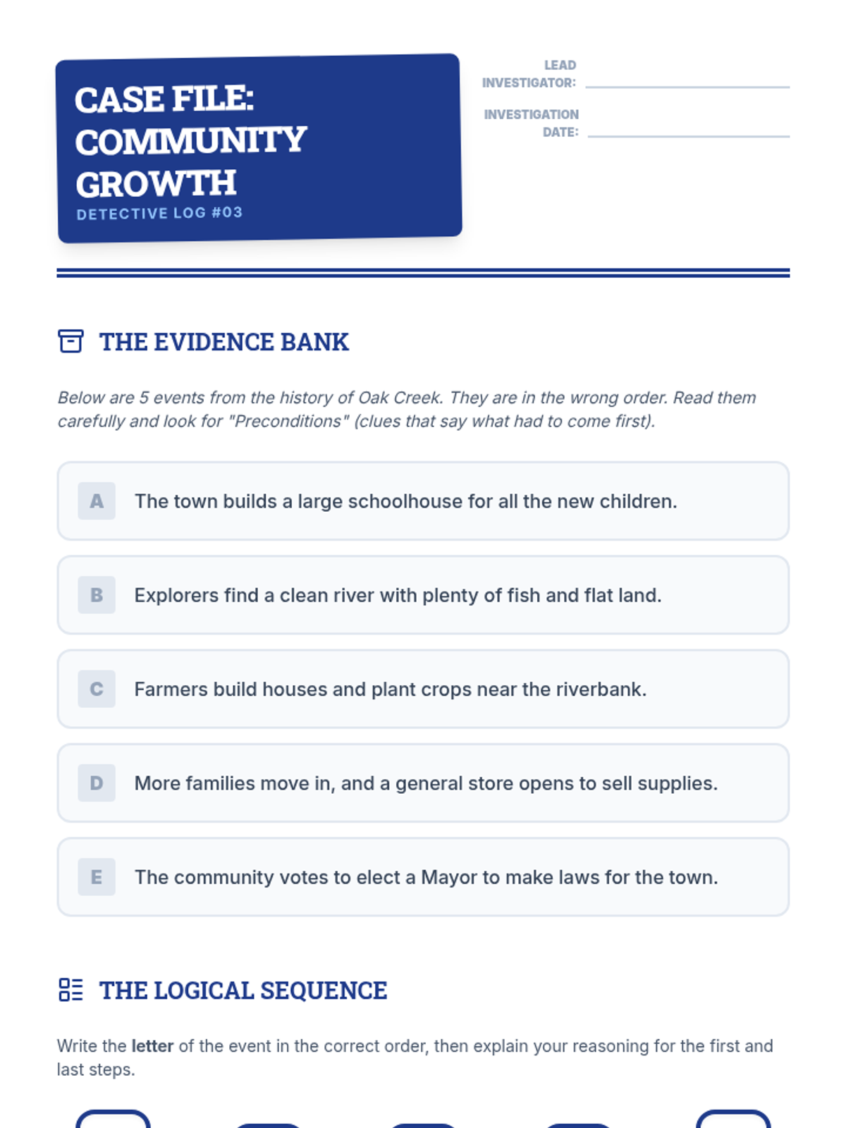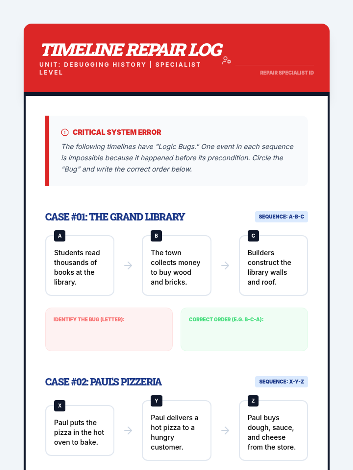 This sequence explores chronological ordering through the lens of logical reasoning and process thinking. Students move from analyzing daily algorithms and cause-and-effect pairs to sequencing historical events and 'debugging' flawed timelines, ultimately creating their own logic chains.