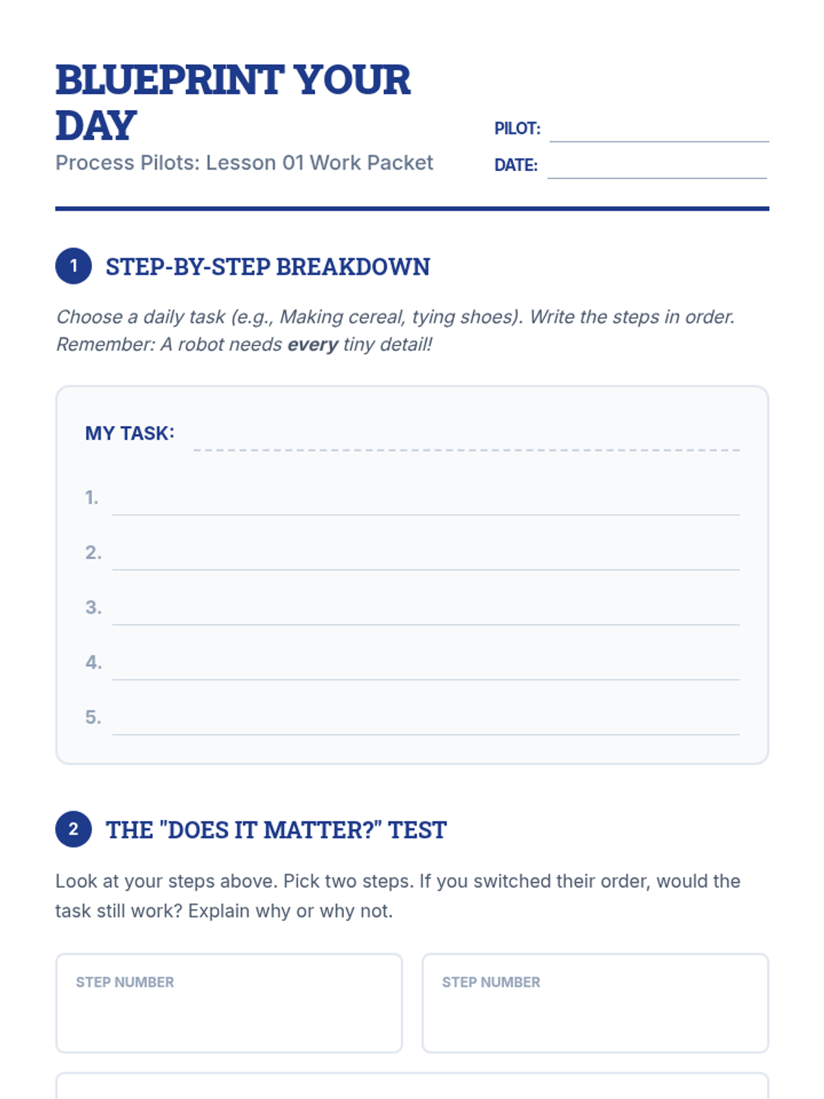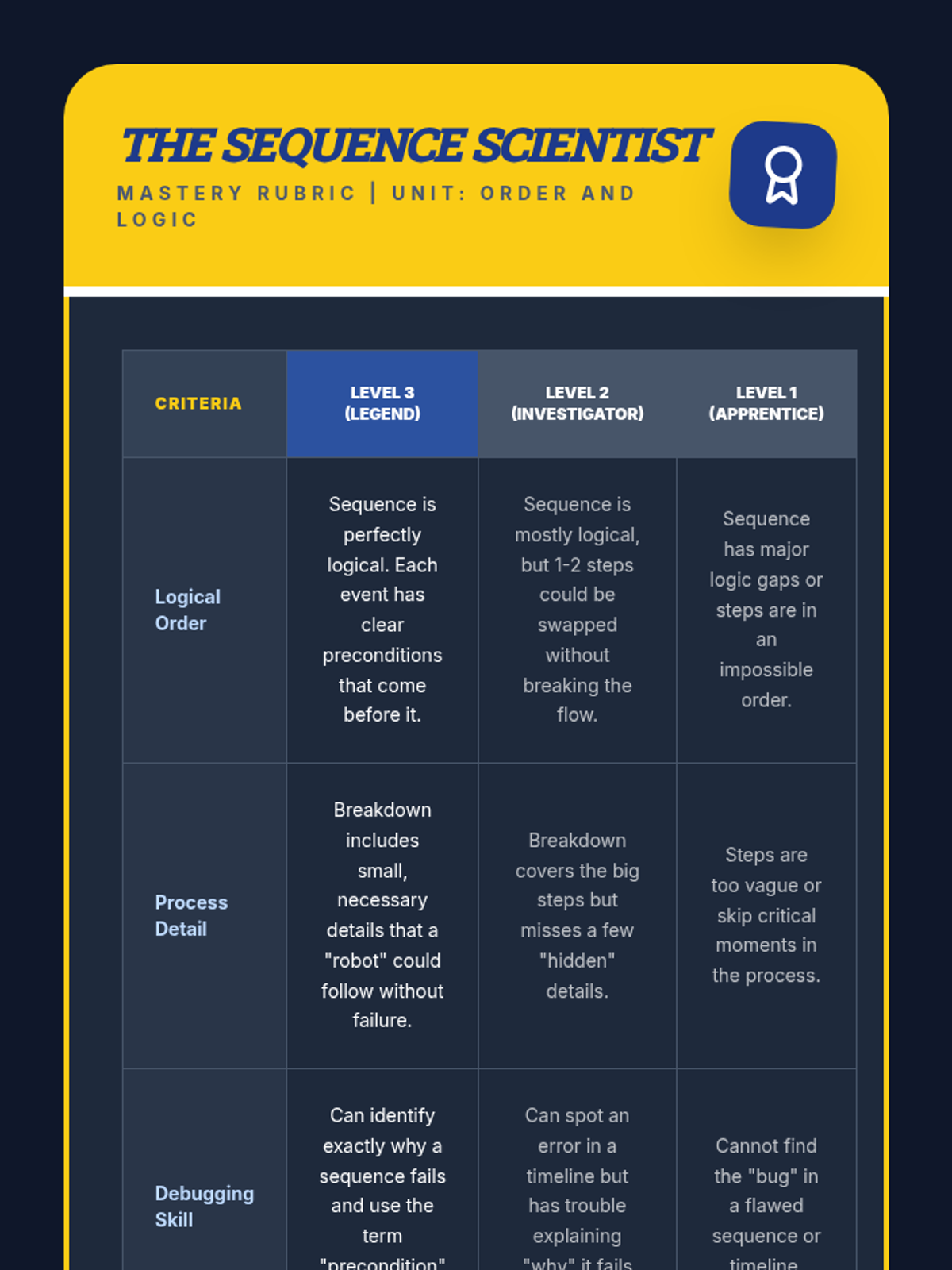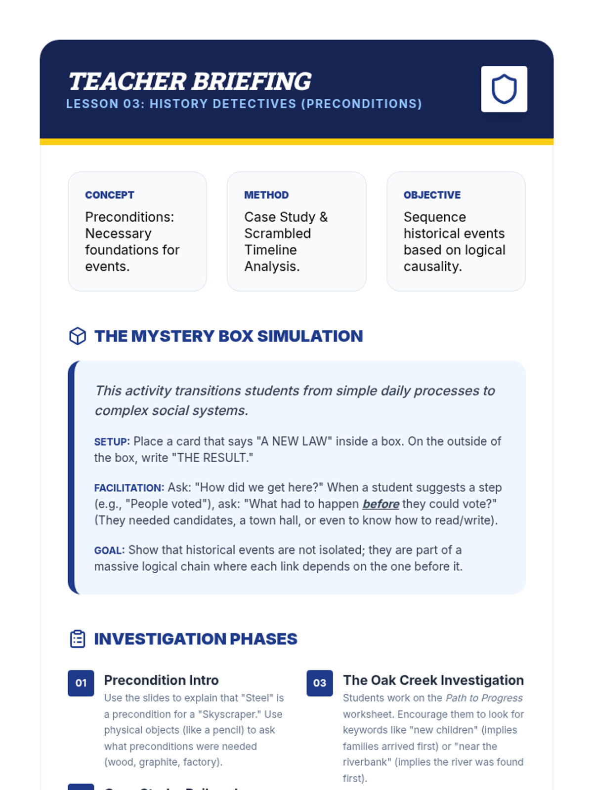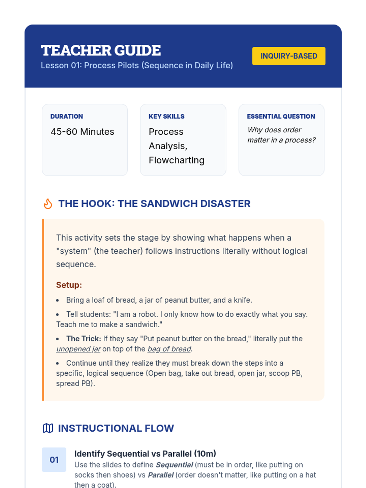 This sequence explores chronological ordering through the lens of logical reasoning and process thinking. Students move from analyzing daily algorithms and cause-and-effect pairs to sequencing historical events and 'debugging' flawed timelines, ultimately creating their own logic chains.