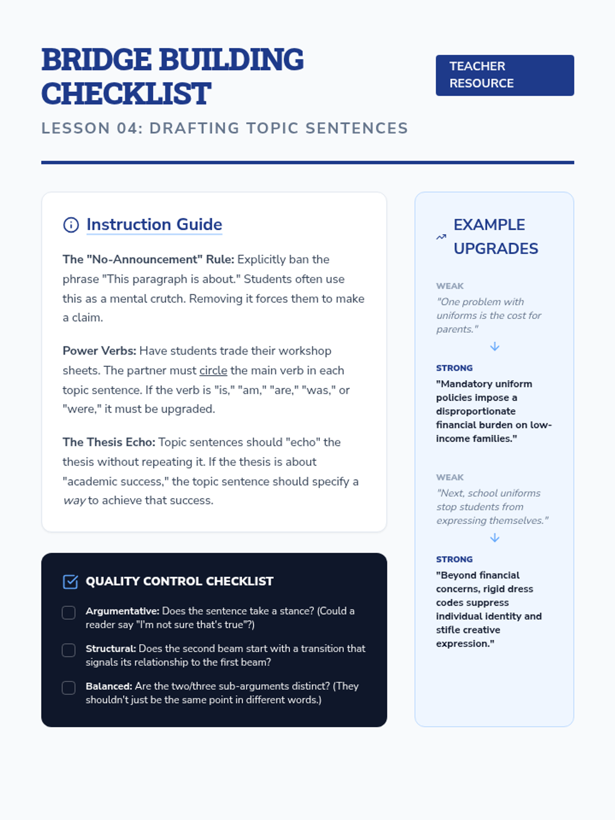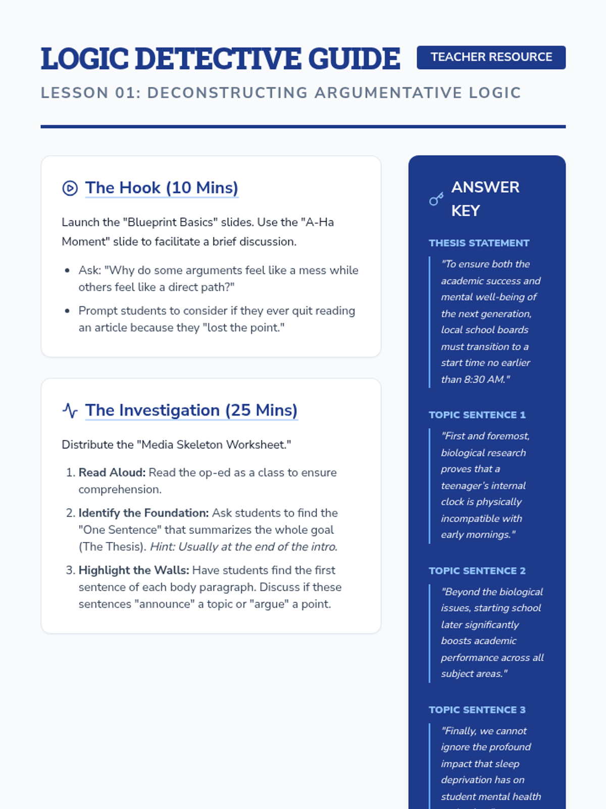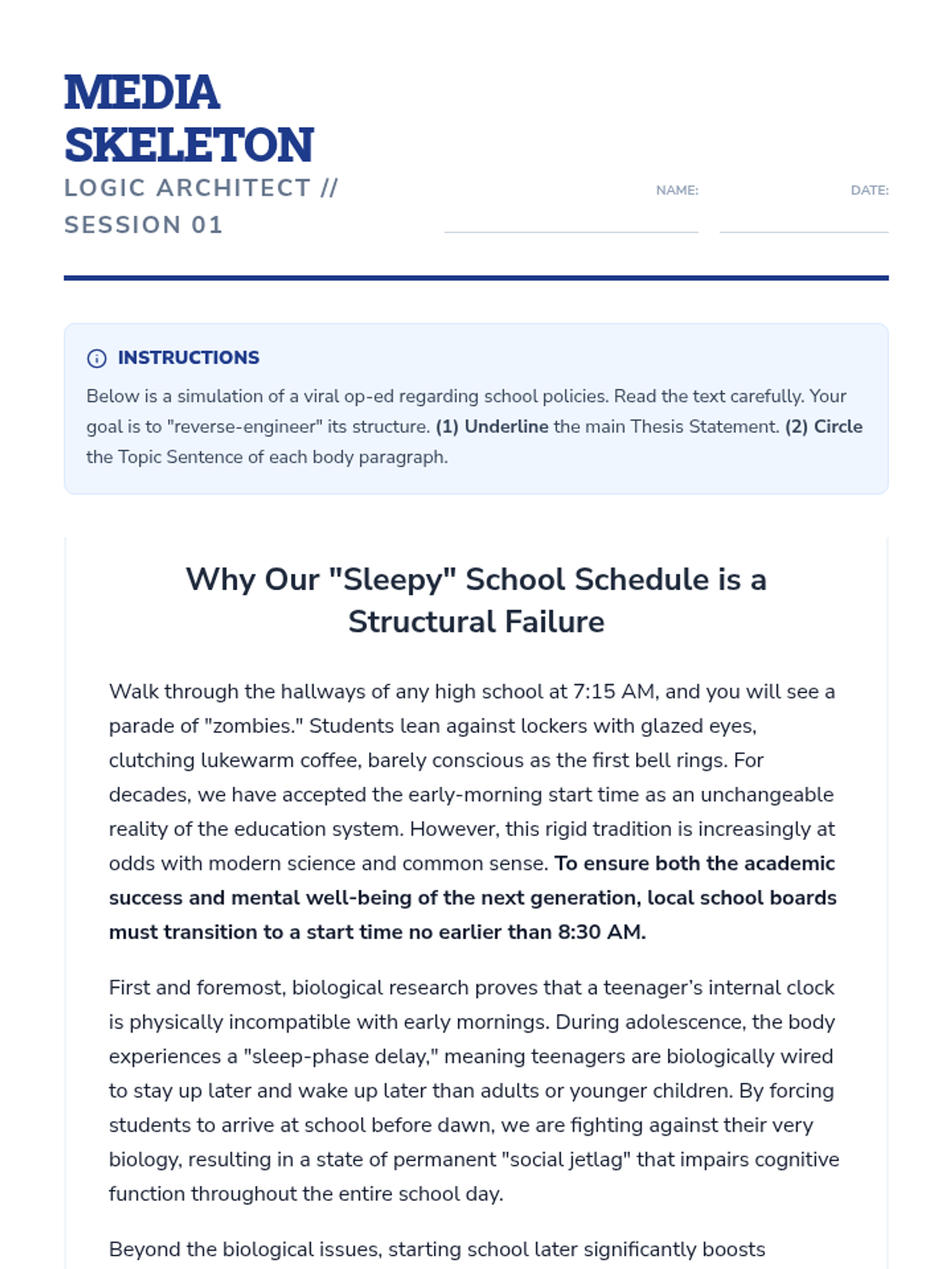This inquiry-based writing sequence teaches 9th-grade students to master thesis statements and topic sentences by treating them as the structural engineering of an argument. Students reverse-engineer professional writing, analyze logical flow, and construct their own 'skeletons' for persuasive essays on community issues.