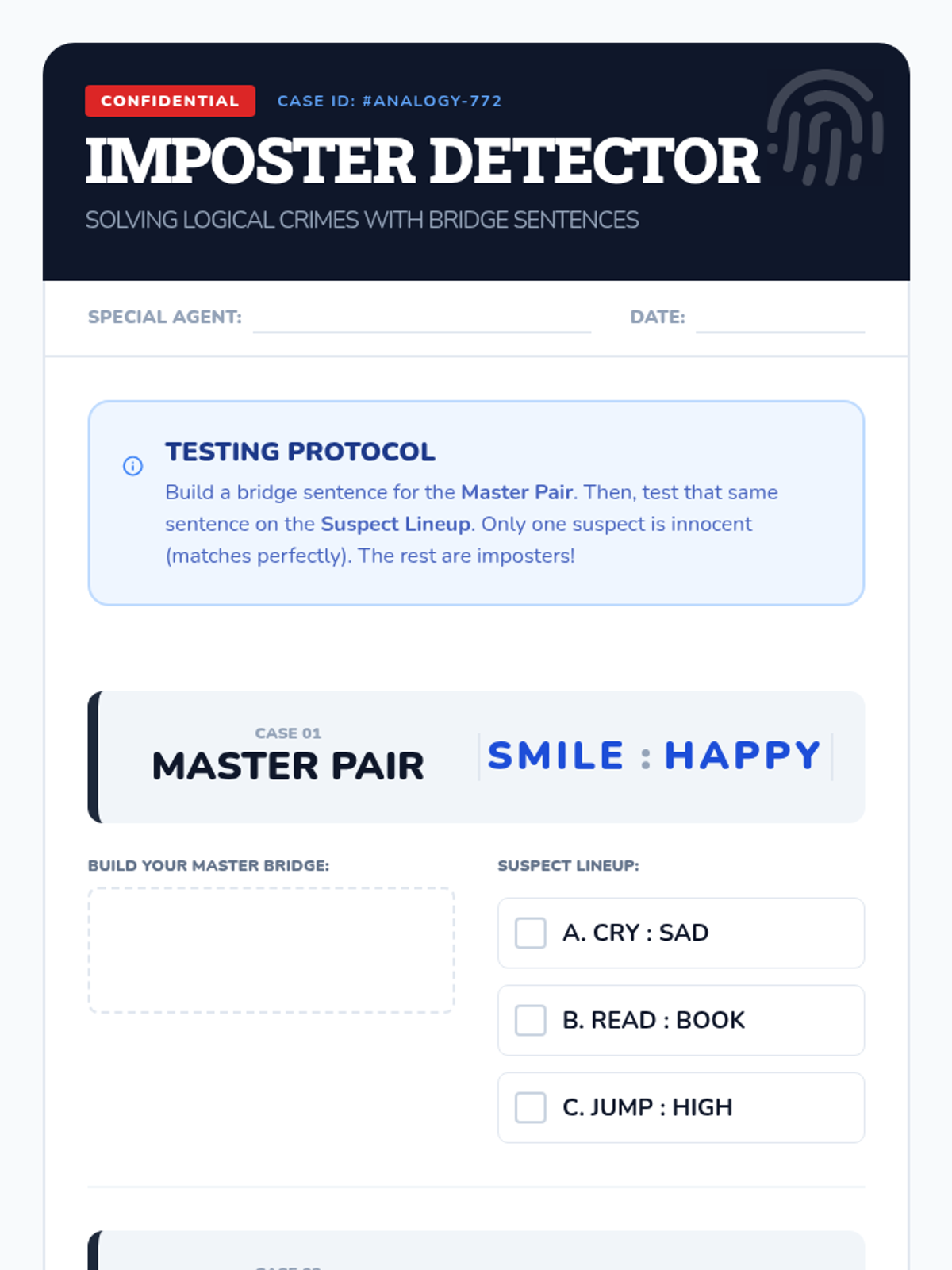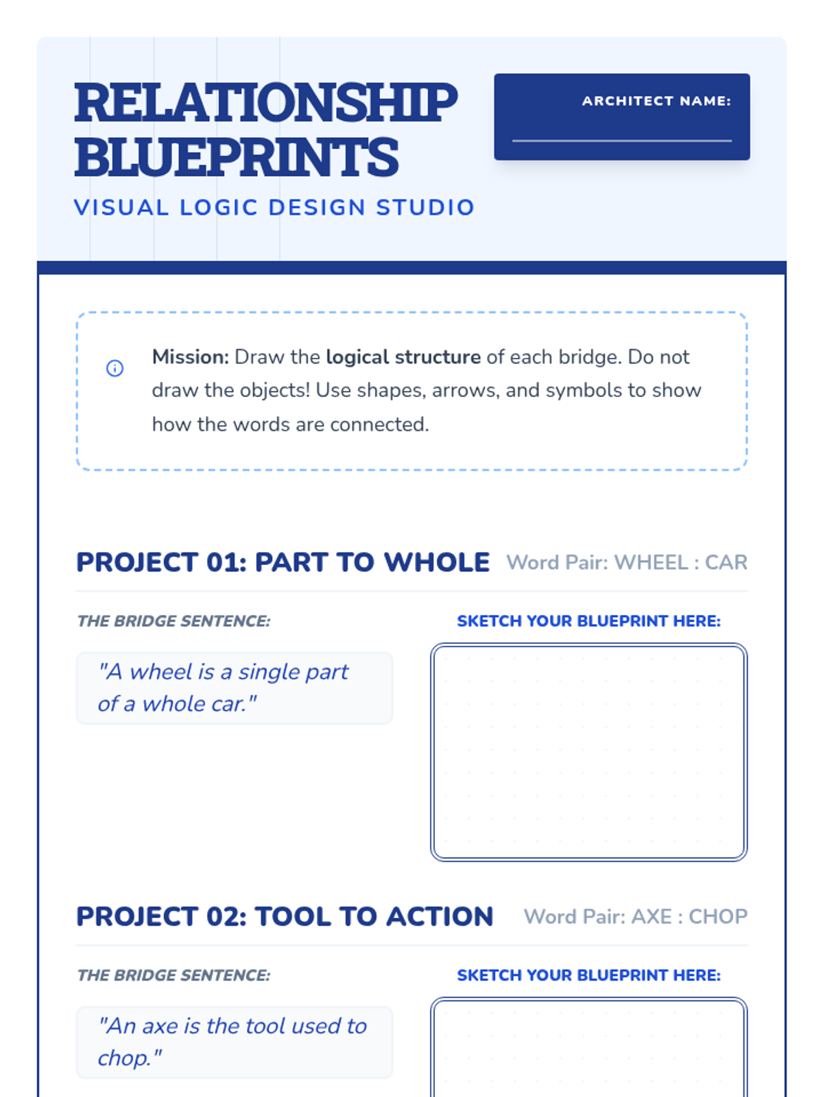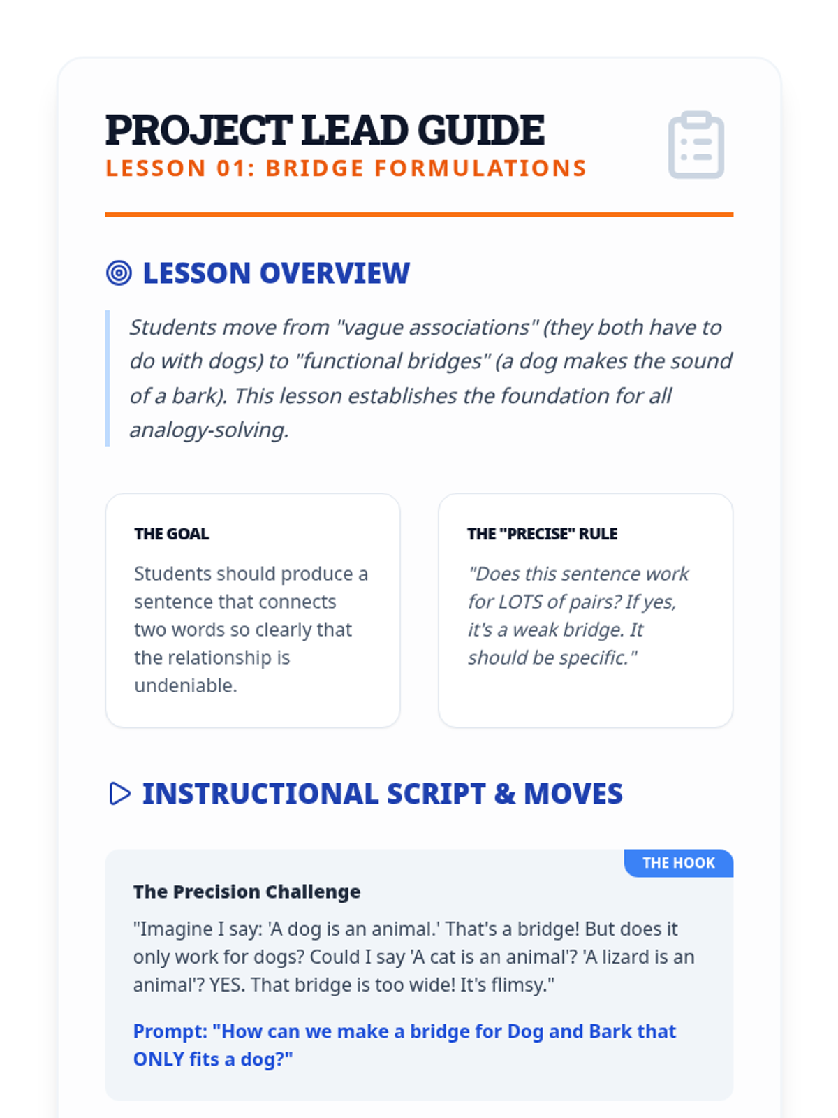 This sequence introduces 3rd-grade students to analogies through the 'Bridge Sentence' strategy. Students learn to construct precise sentences that define relationships, apply these sentences to solve puzzles, debug logical errors, visualize relationships, and build fluency in verbal reasoning.