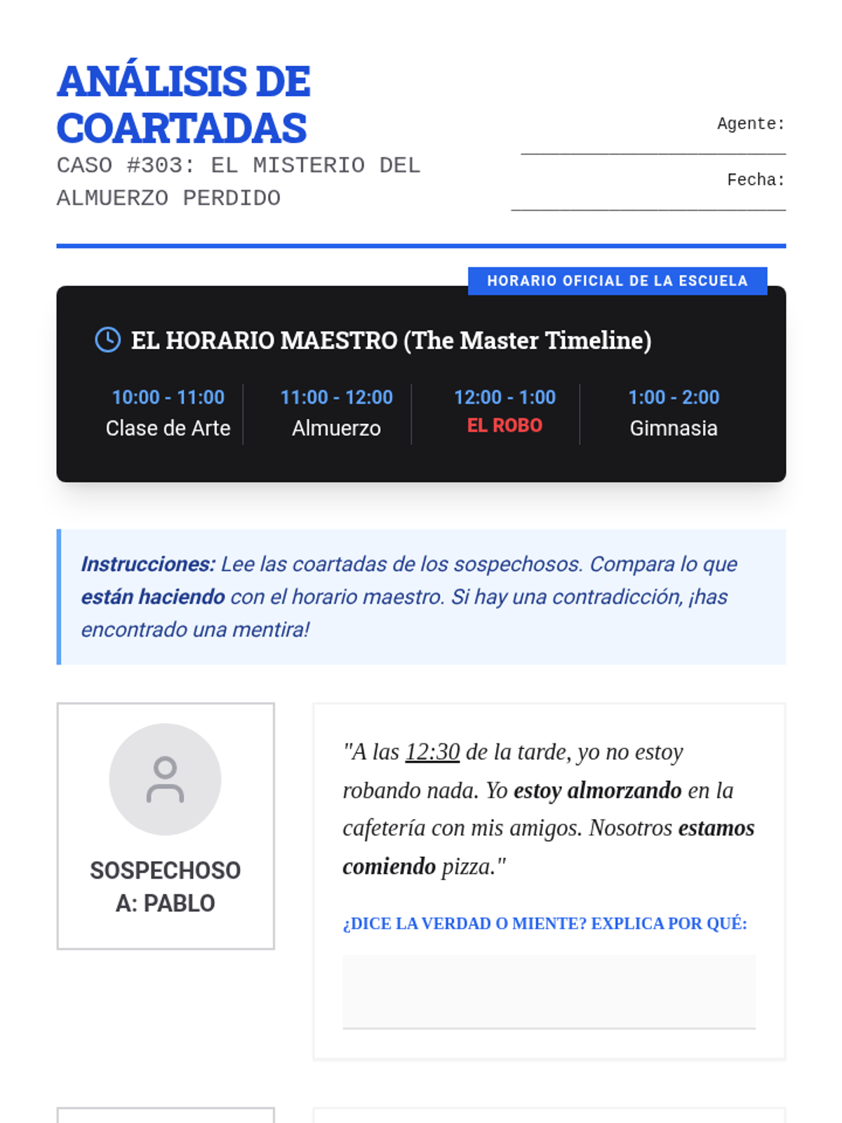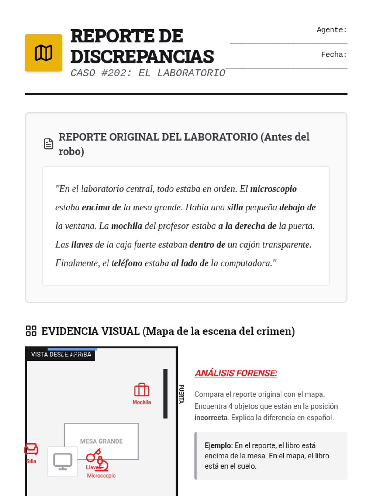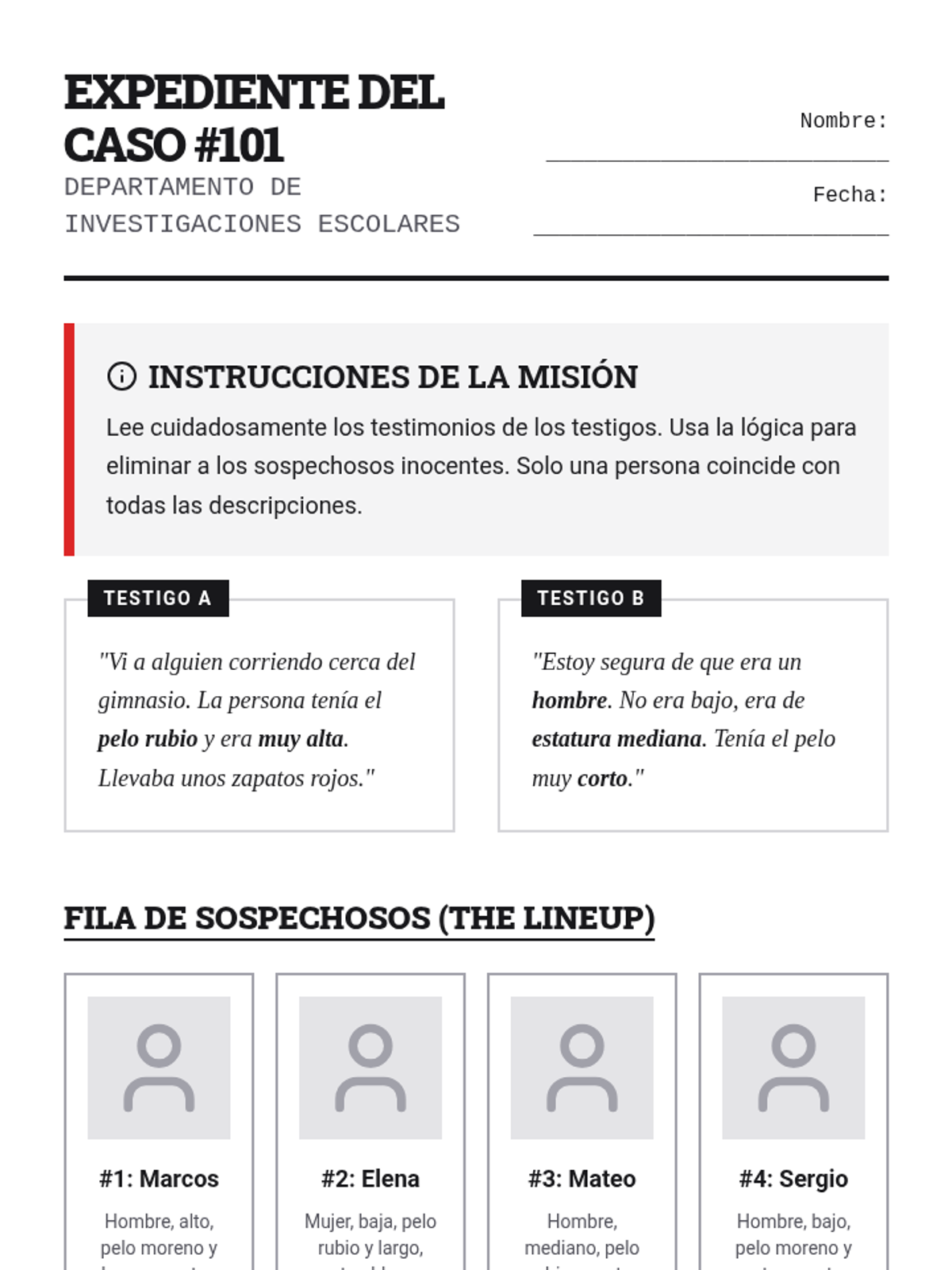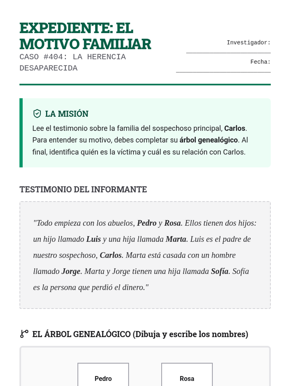 A gamified detective-themed Spanish reading sequence where 7th-grade students apply textual analysis and logic to solve mysteries. Students master physical descriptions, prepositions, present progressive, and family relationships through immersive logic puzzles.