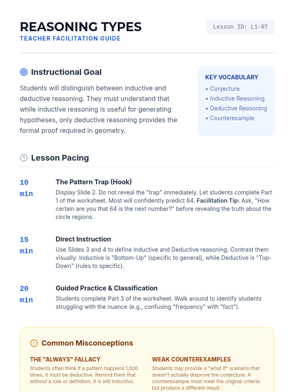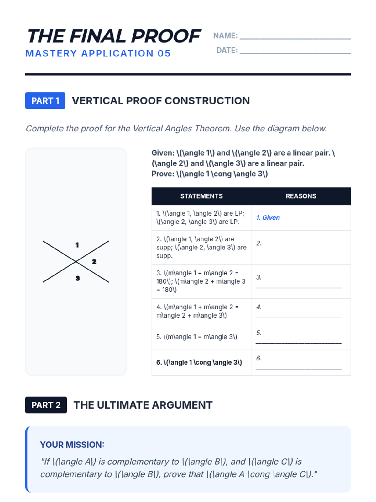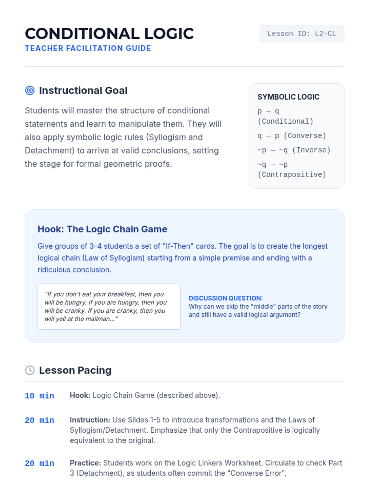 This introductory sequence bridges the gap between informal logic and formal geometric proof. Students explore inductive and deductive reasoning, conditional statements, and algebraic justifications before mastering segment and angle postulates to construct formal geometric theorems.