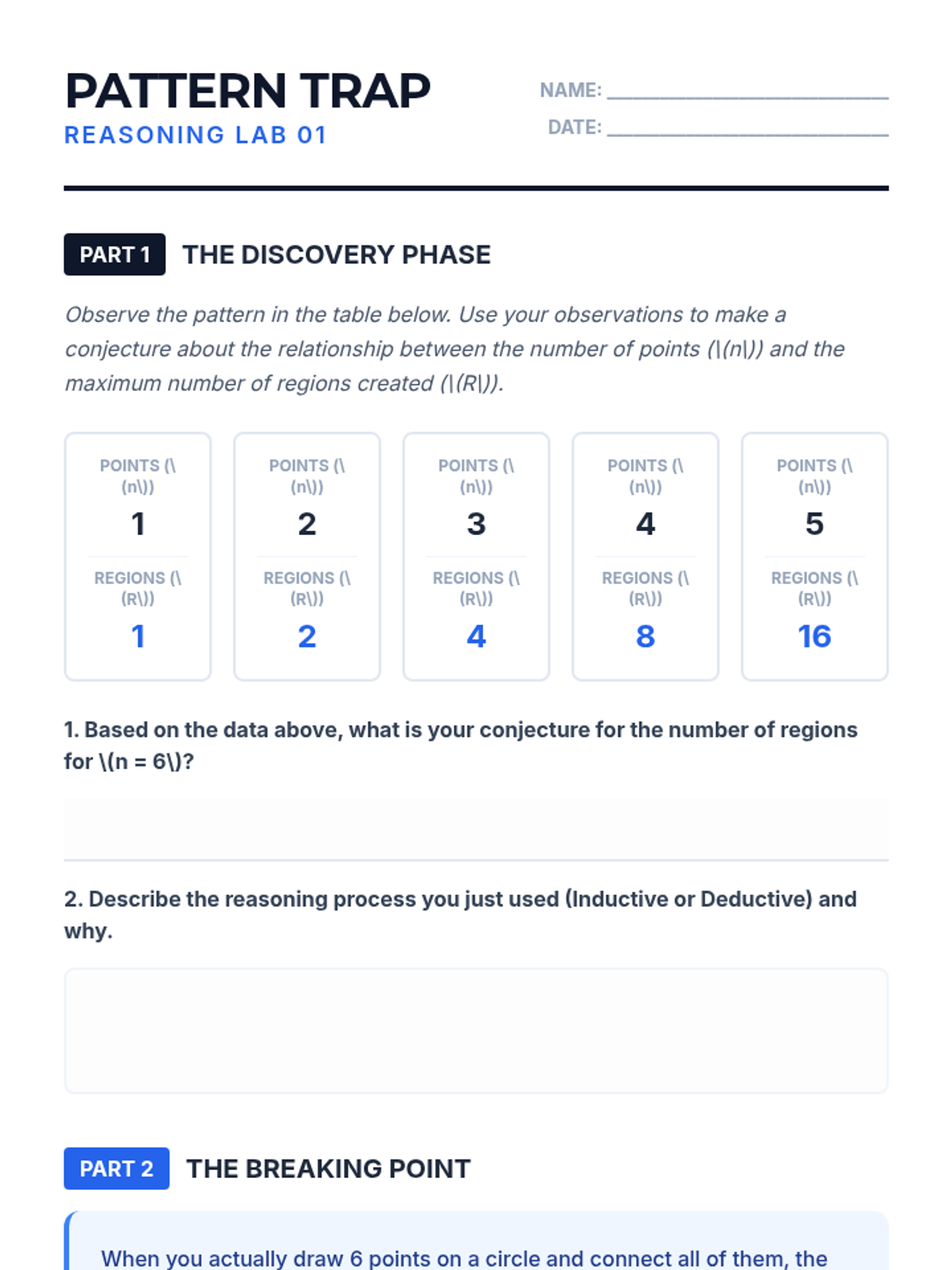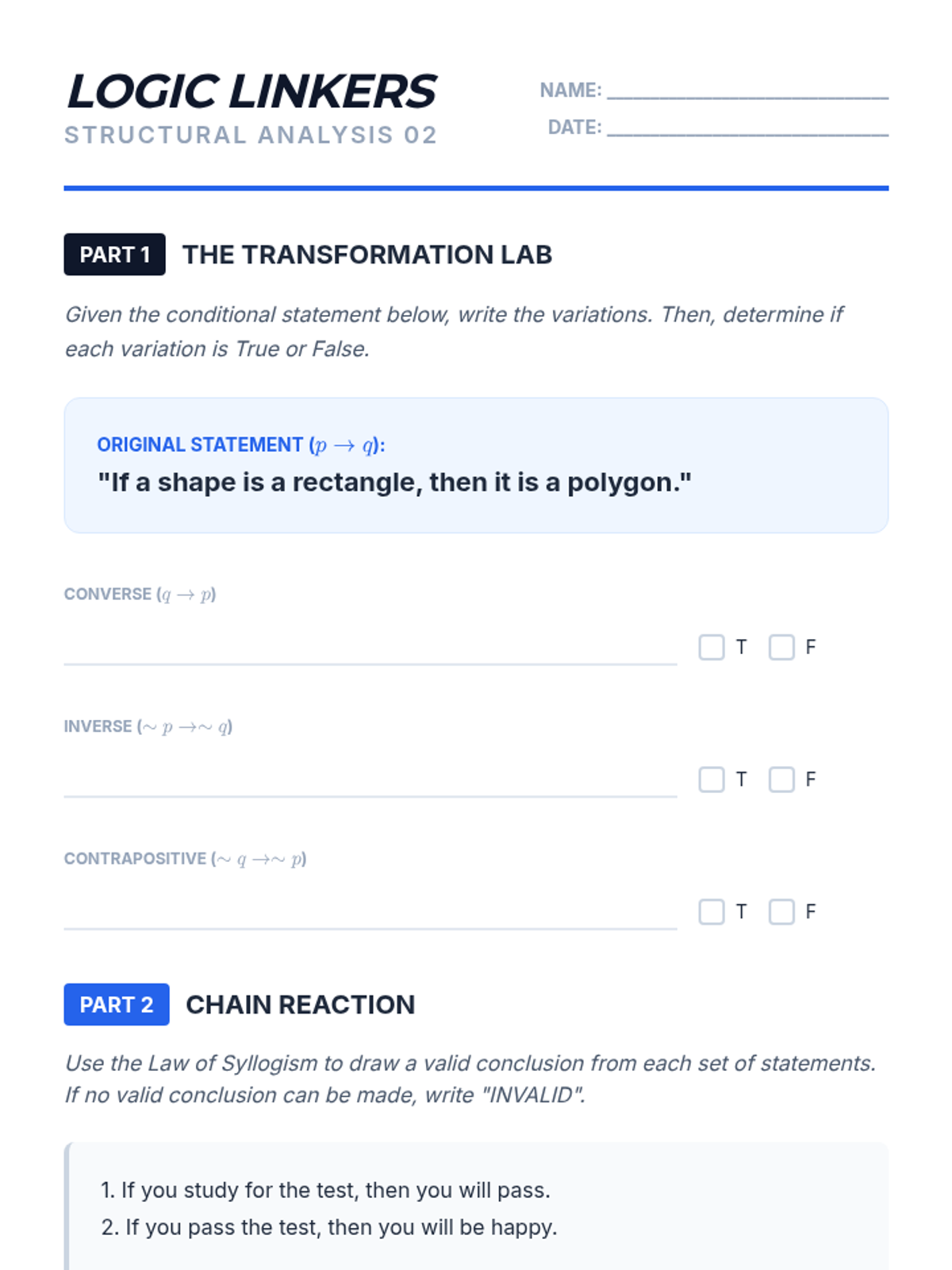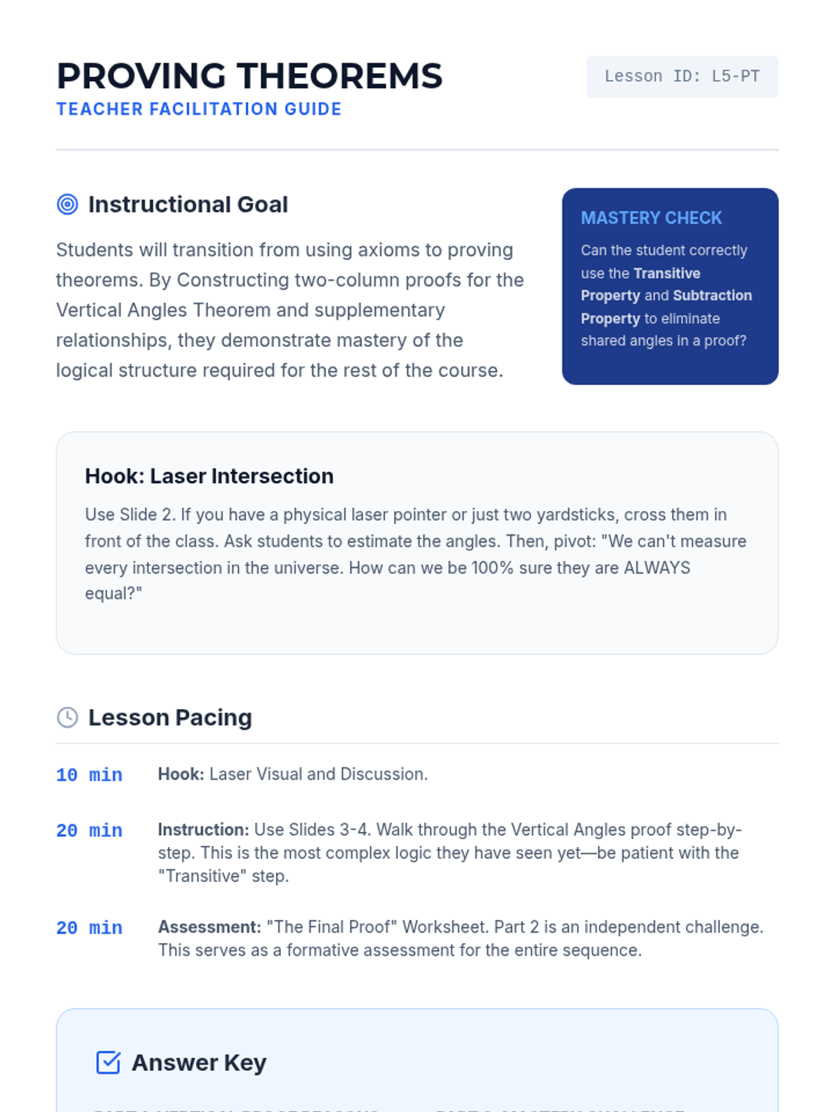 This introductory sequence bridges the gap between informal logic and formal geometric proof. Students explore inductive and deductive reasoning, conditional statements, and algebraic justifications before mastering segment and angle postulates to construct formal geometric theorems.