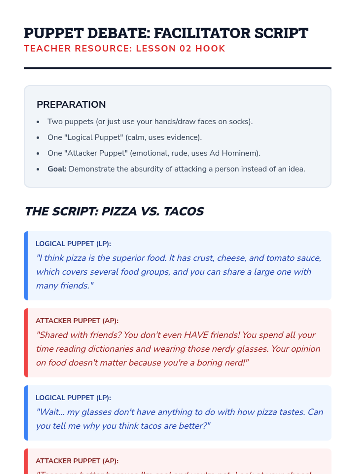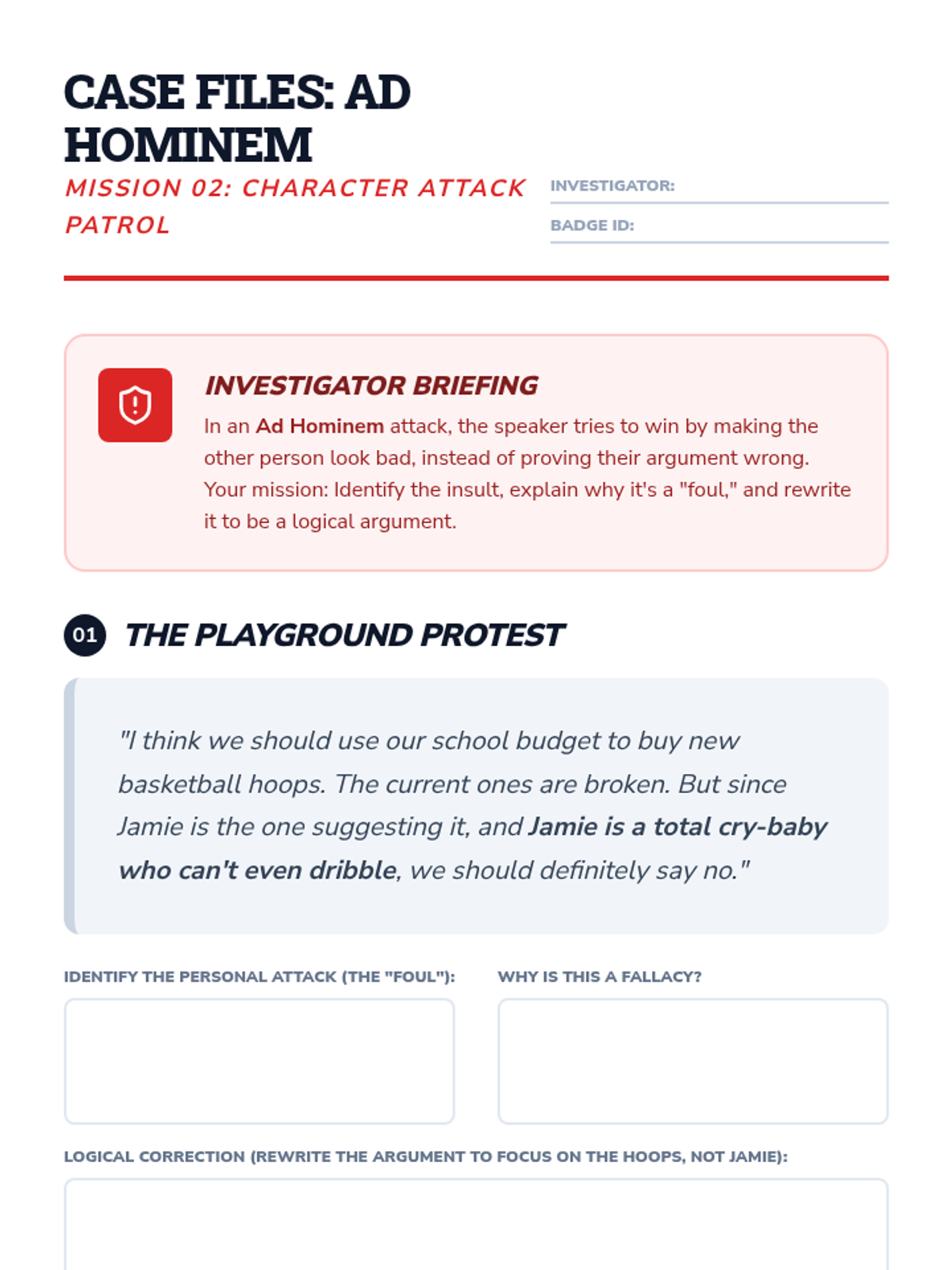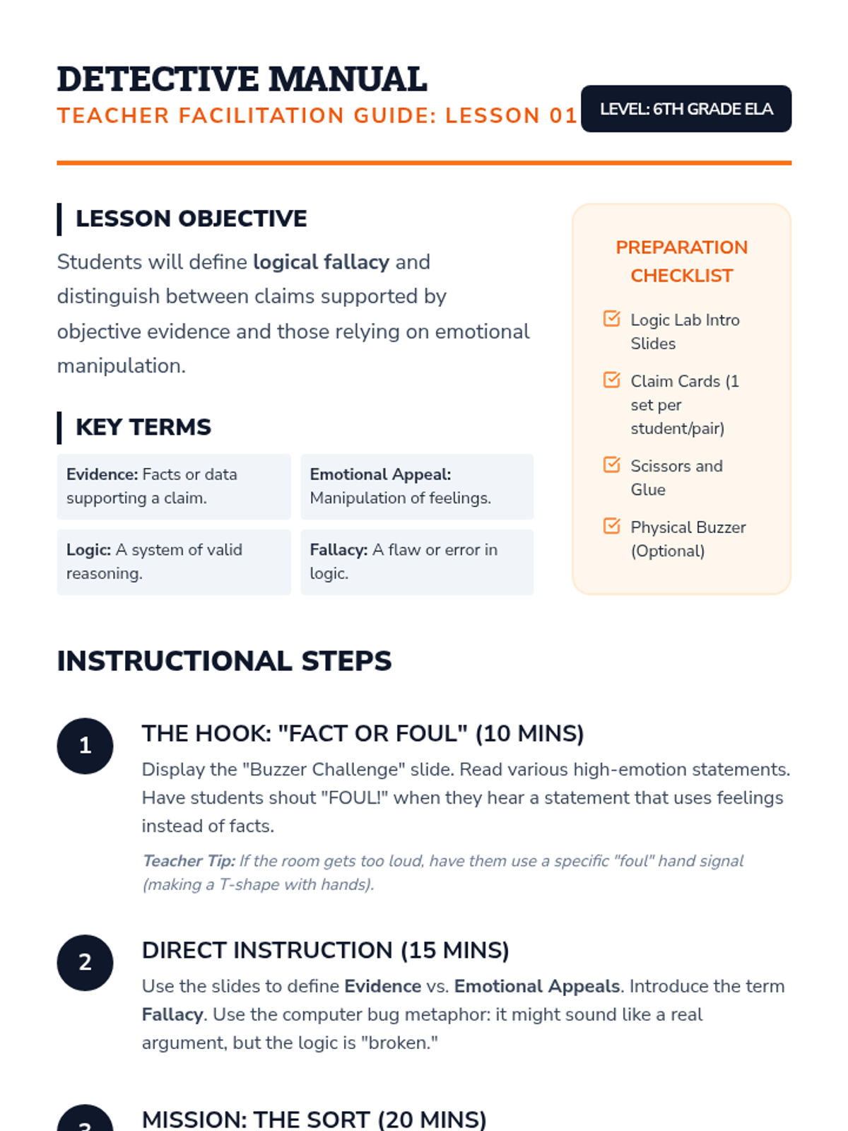 A high-engagement sequence for 6th graders to identify and categorize logical fallacies including Ad Hominem, Bandwagon, and Slippery Slope. Using a "Logic Lab" detective theme, students move from distinguishing evidence from emotion to rapid-fire categorization in a competitive tournament.