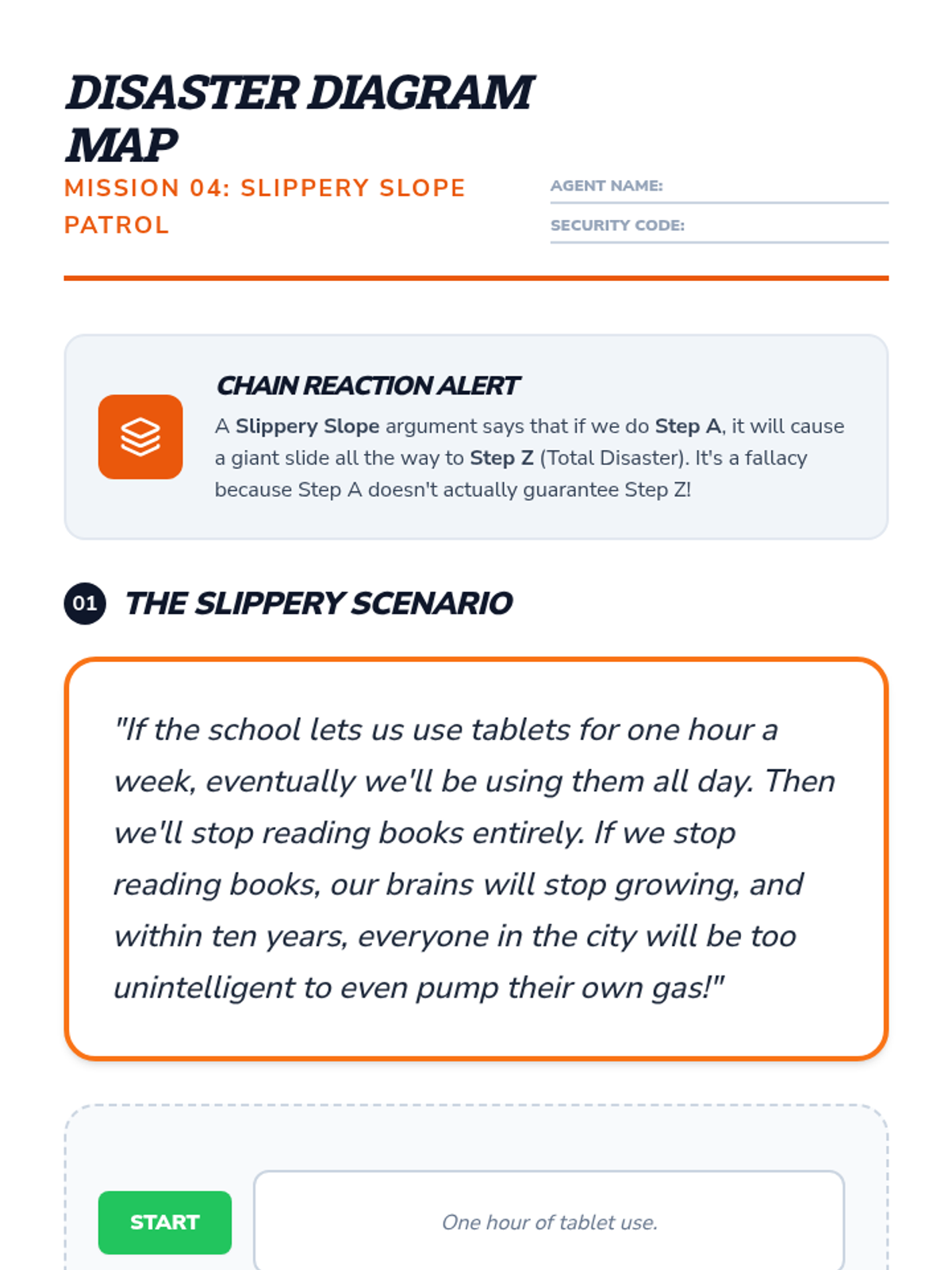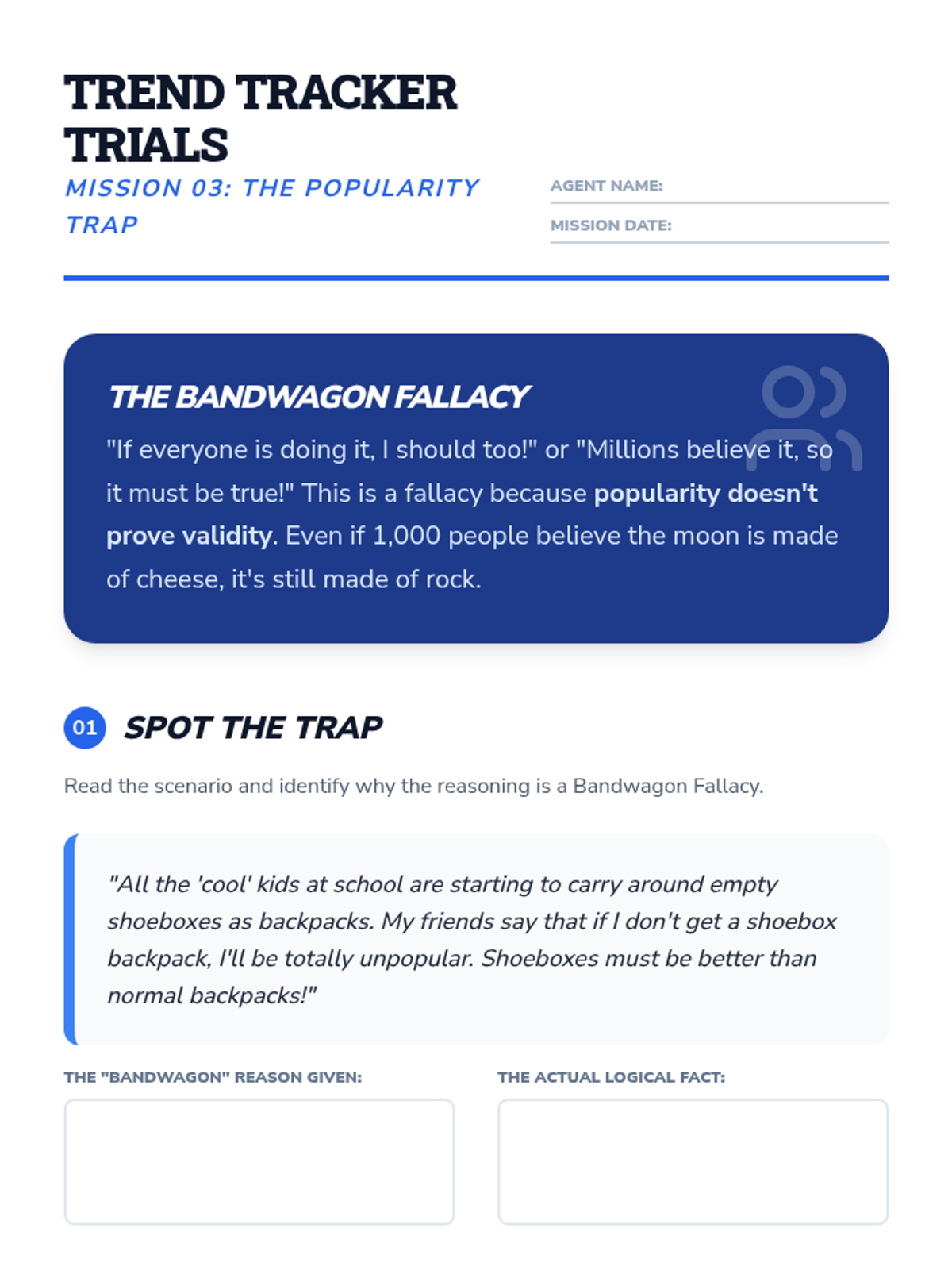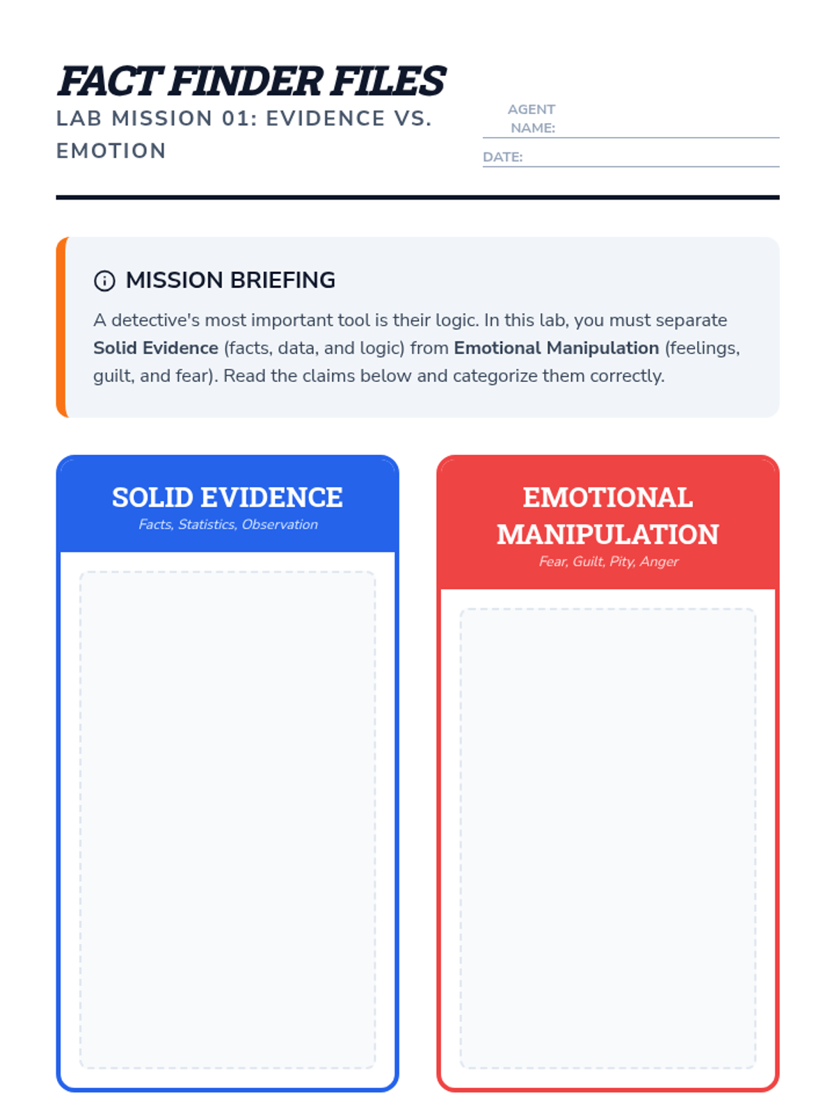 A high-engagement sequence for 6th graders to identify and categorize logical fallacies including Ad Hominem, Bandwagon, and Slippery Slope. Using a "Logic Lab" detective theme, students move from distinguishing evidence from emotion to rapid-fire categorization in a competitive tournament.
