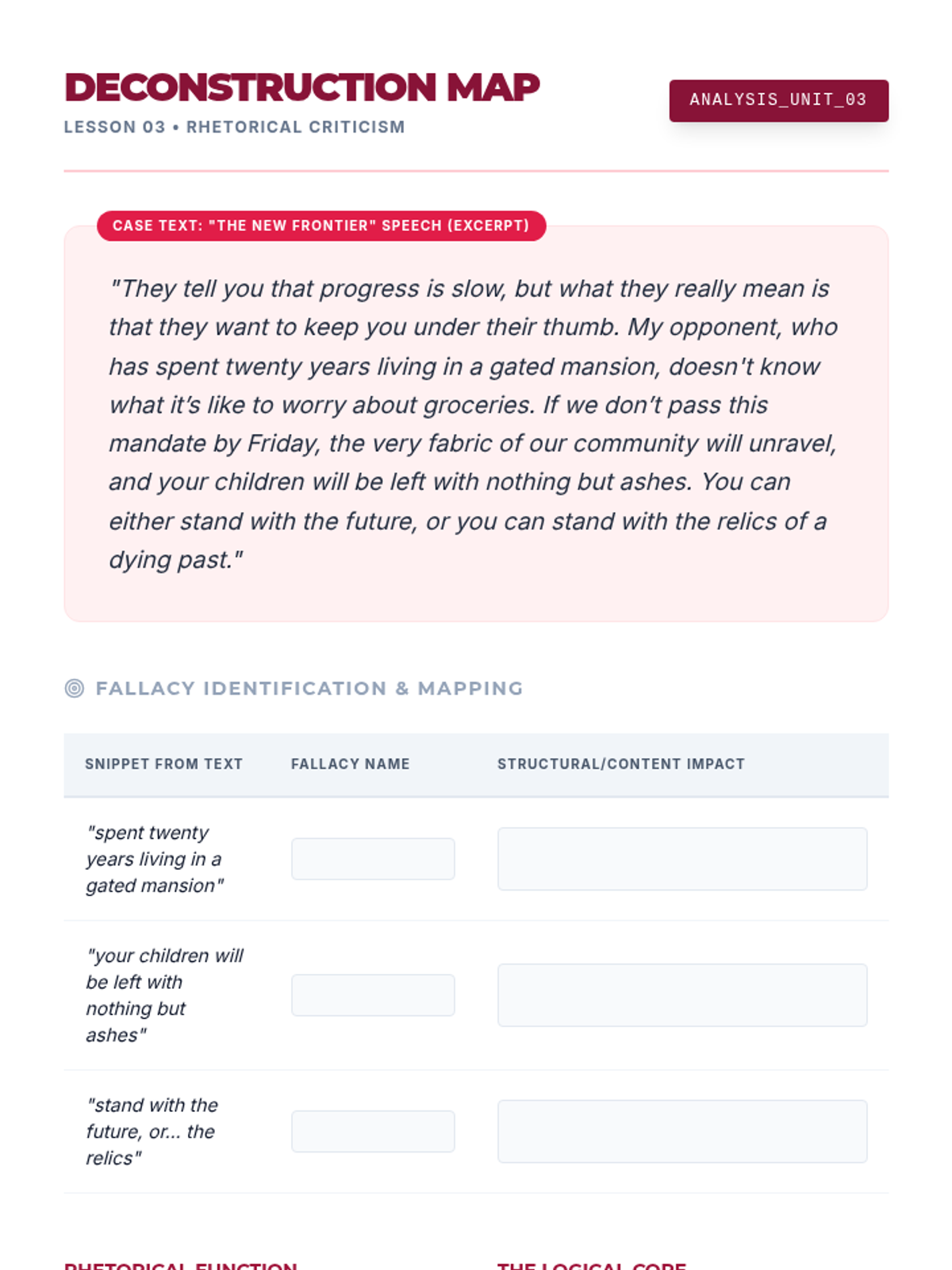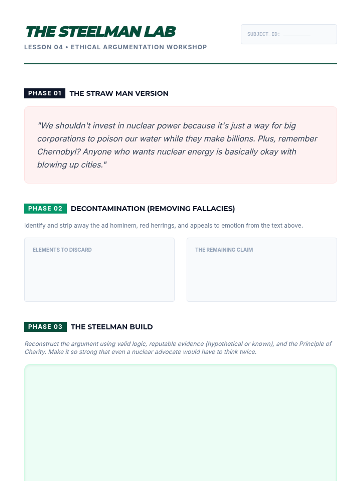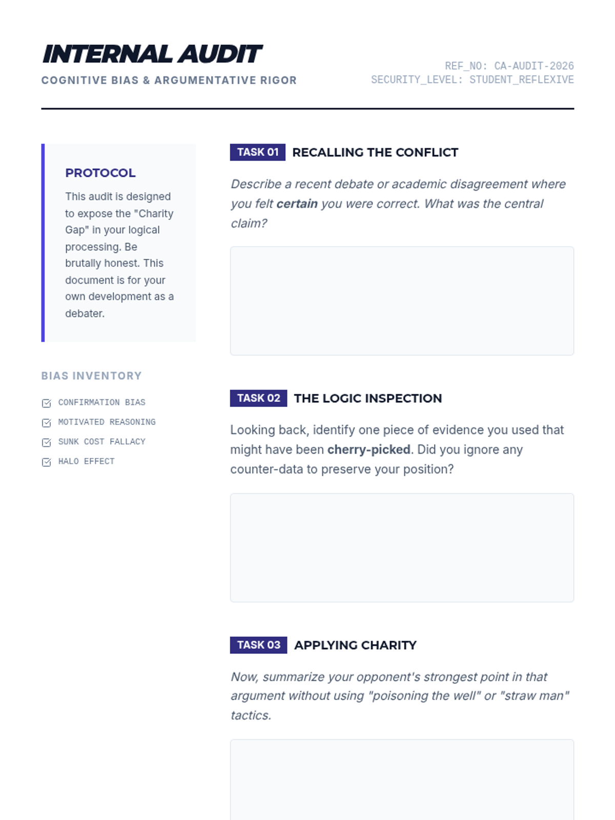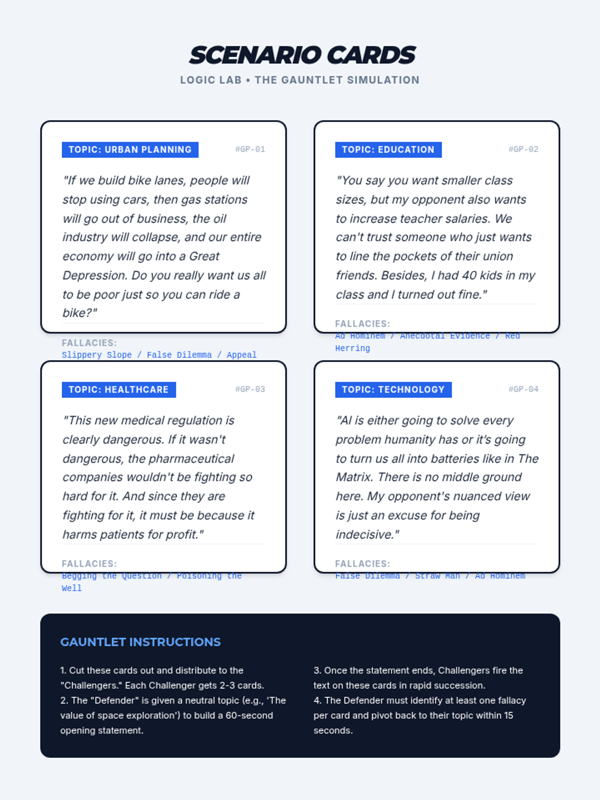 A graduate-level exploration of logical fallacies and cognitive biases, focusing on structural analysis, rhetorical criticism, and ethical argumentation through steelmanning and real-time defense.