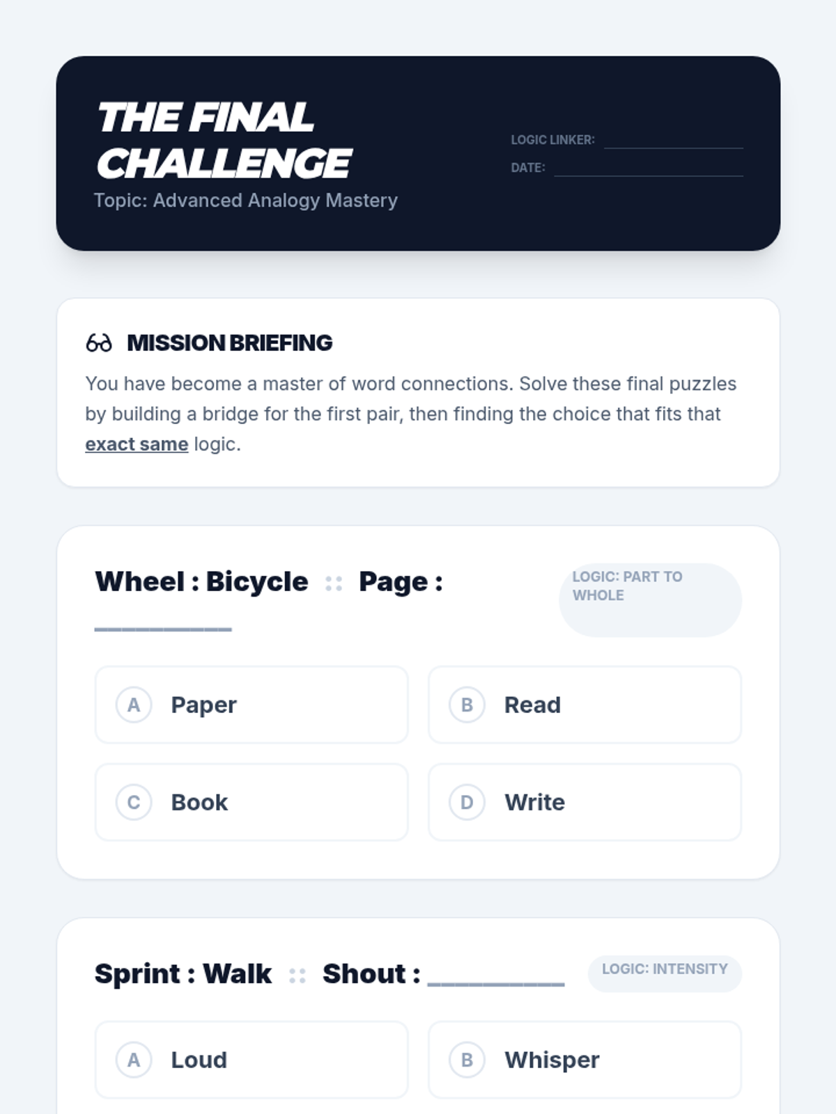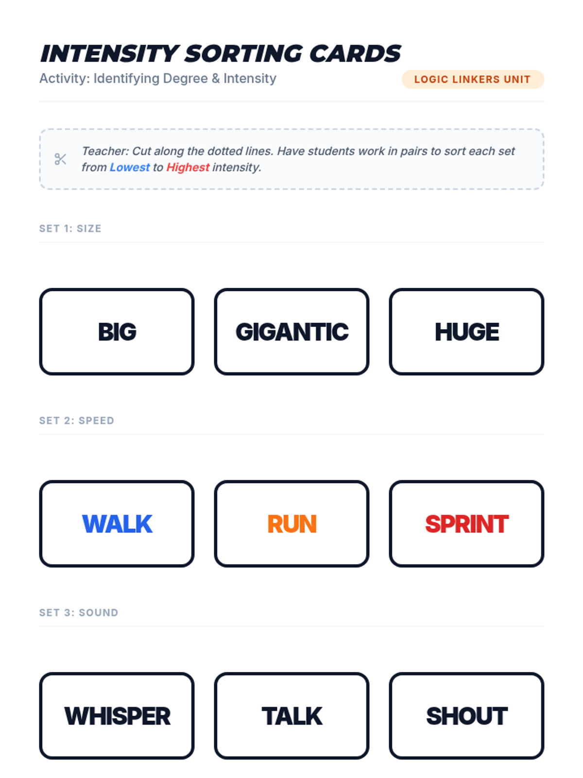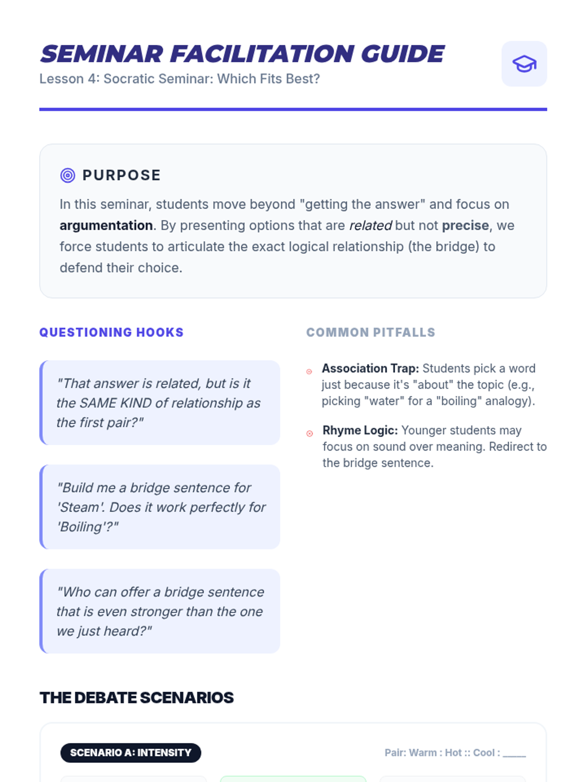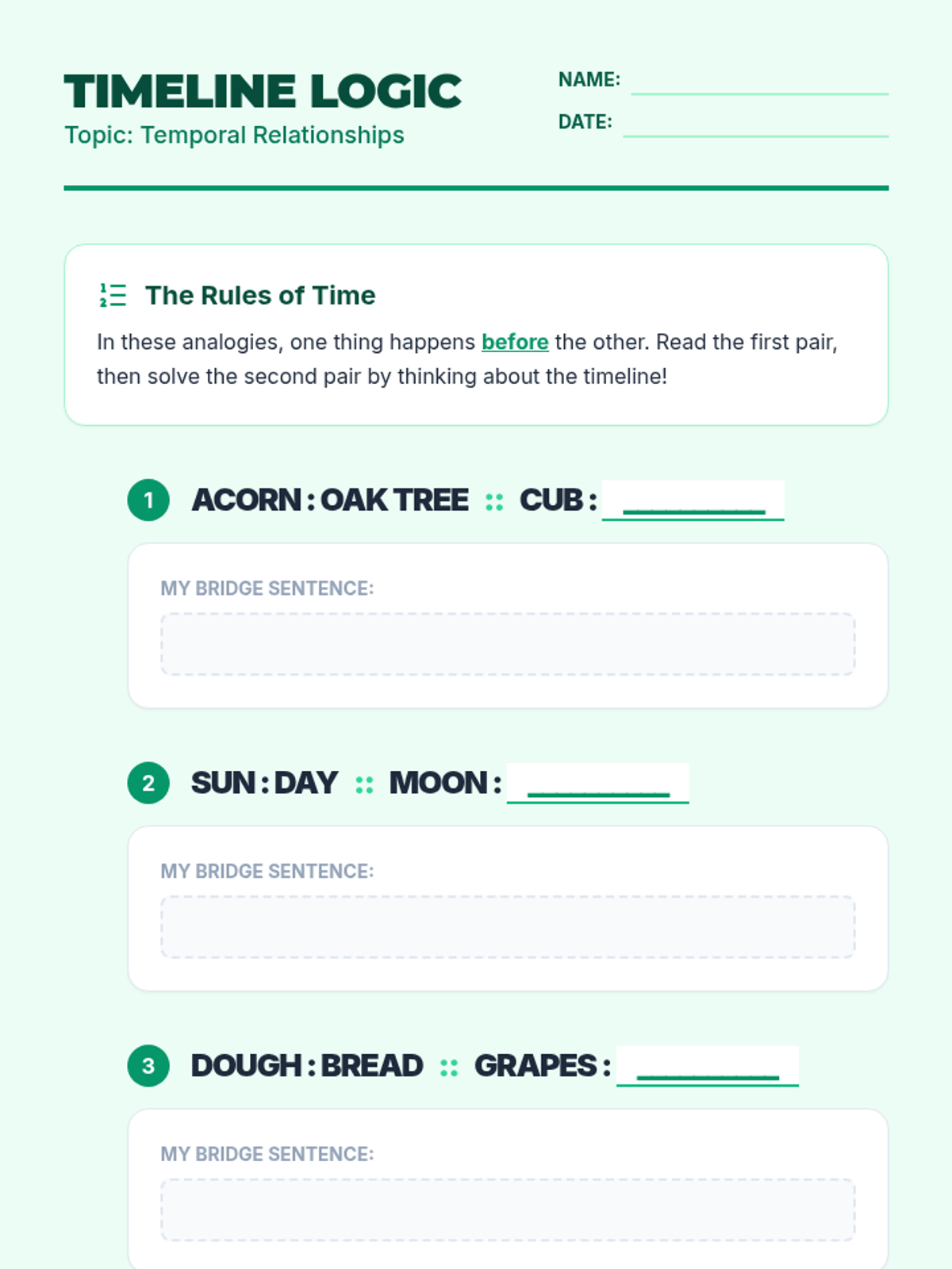 A challenge-level vocabulary unit for 2nd graders focusing on logical relationships, degree of intensity, and temporal sequences through analogy-based thinking.