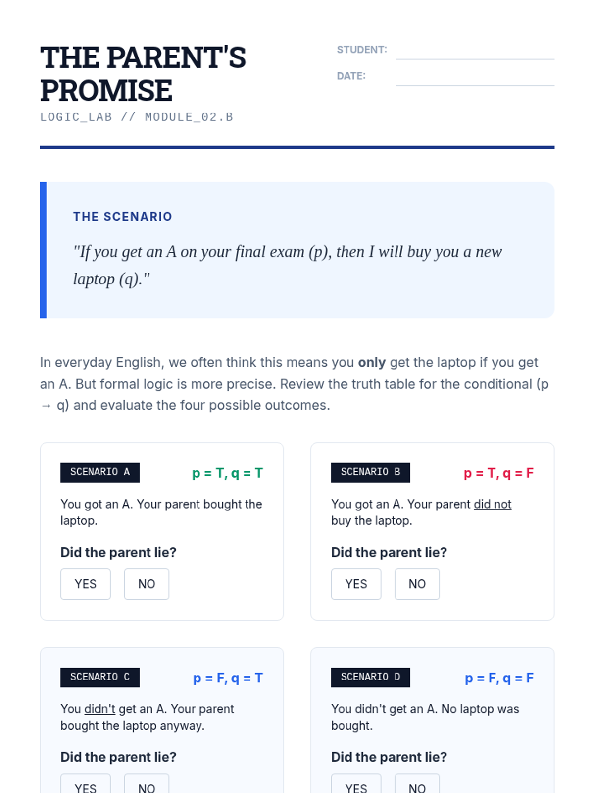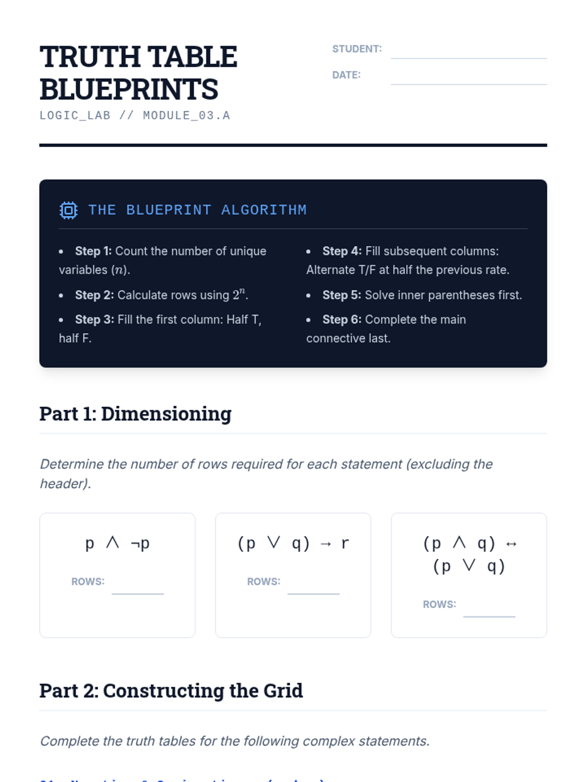 A high school ELA sequence on formal logic, teaching students to translate natural language into symbolic notation and evaluate logical consistency through truth tables. Students progress from basic connectives to analyzing complex rhetorical arguments for tautologies and contradictions.
