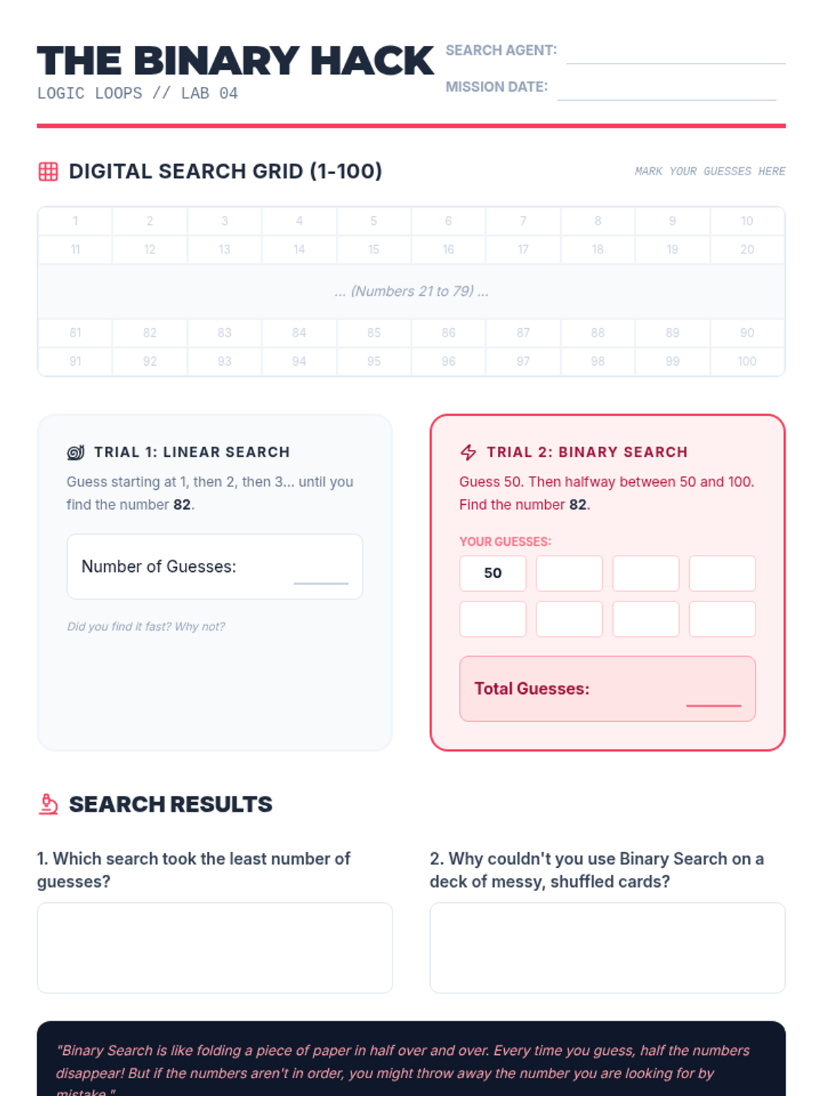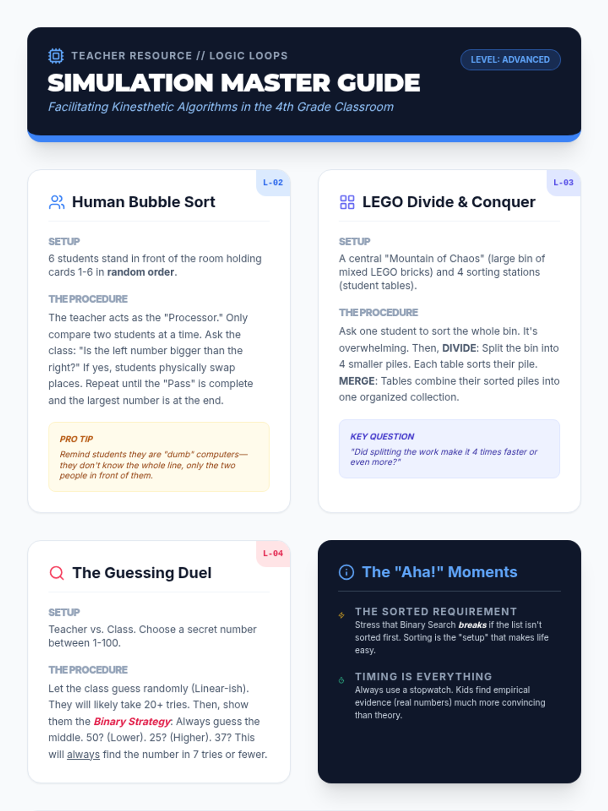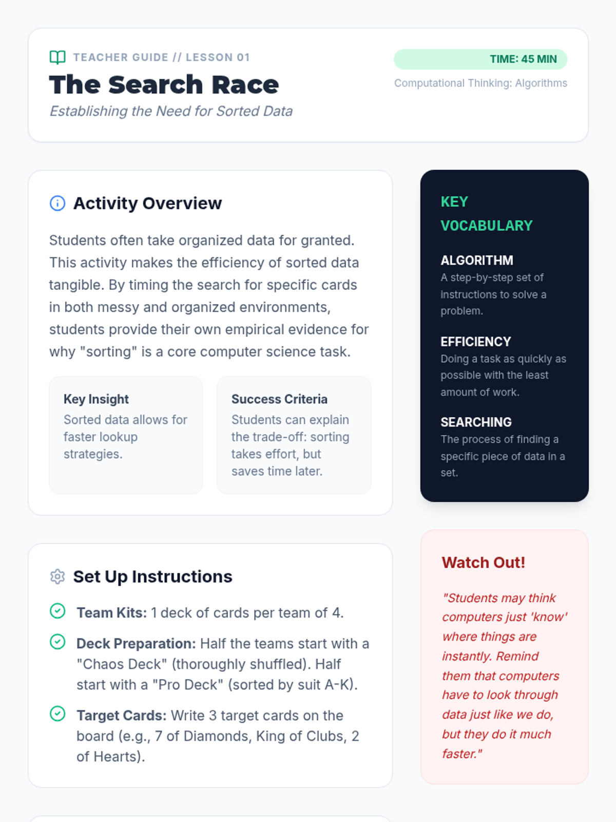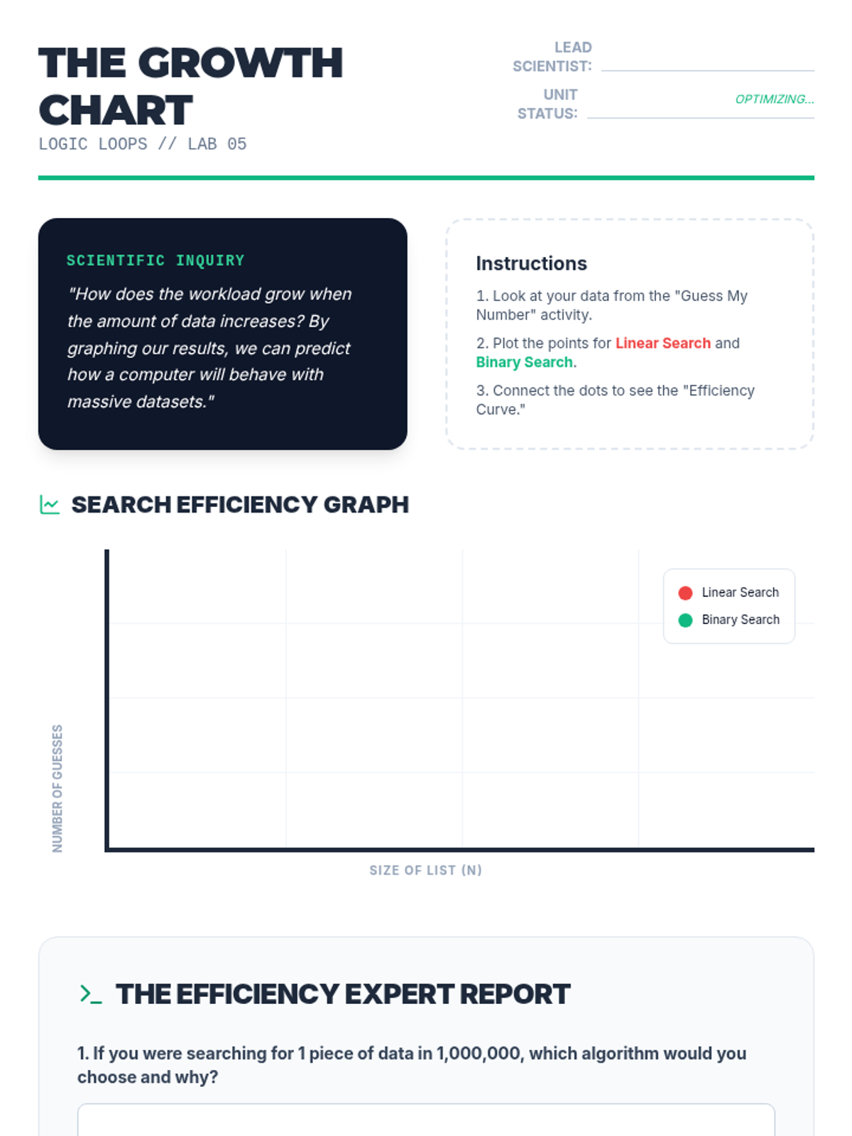 A 5-lesson unit for 4th graders exploring algorithmic efficiency, sorting algorithms (Bubble, Merge), and searching strategies (Linear, Binary) through kinesthetic simulations and data analysis.