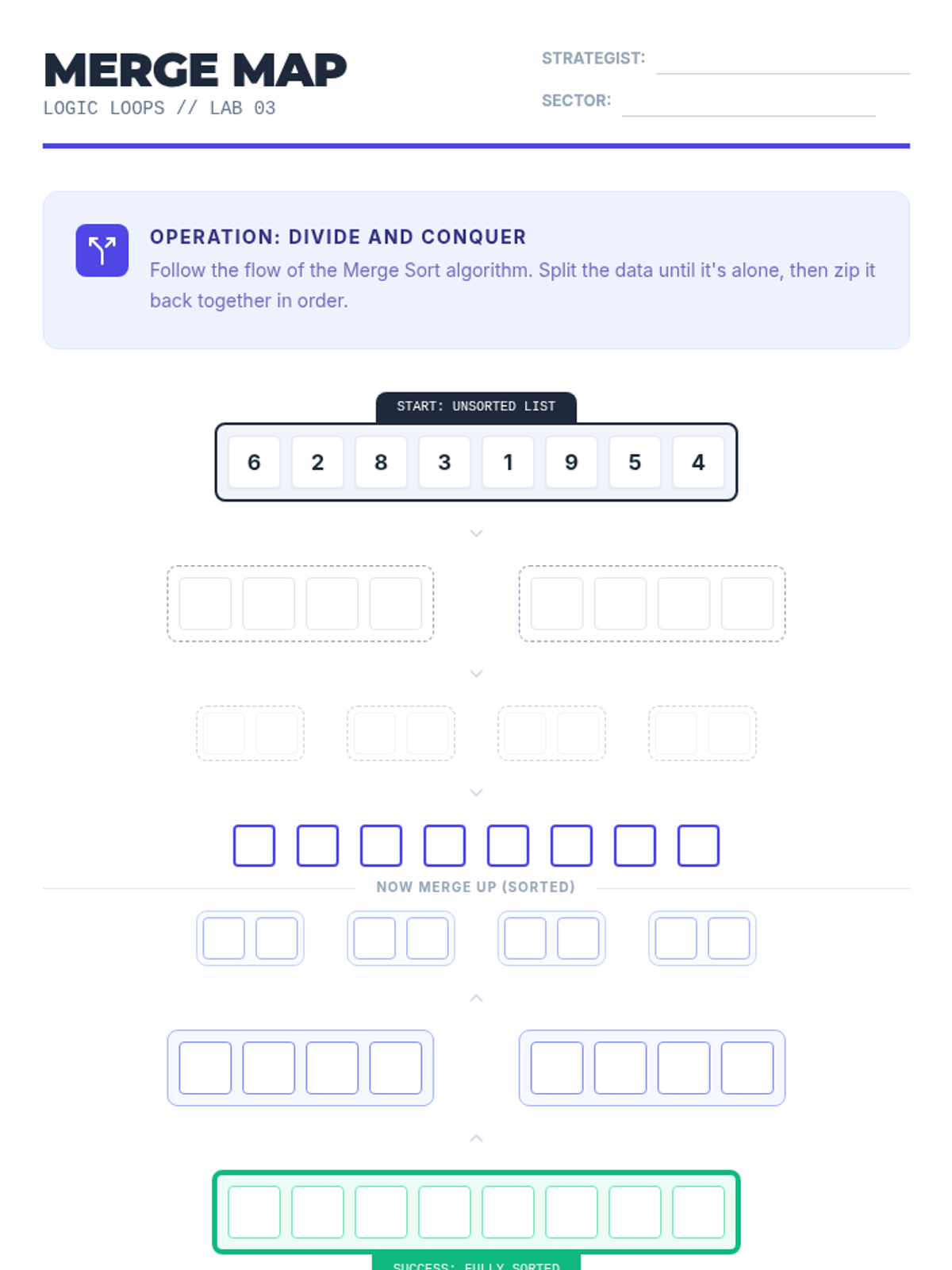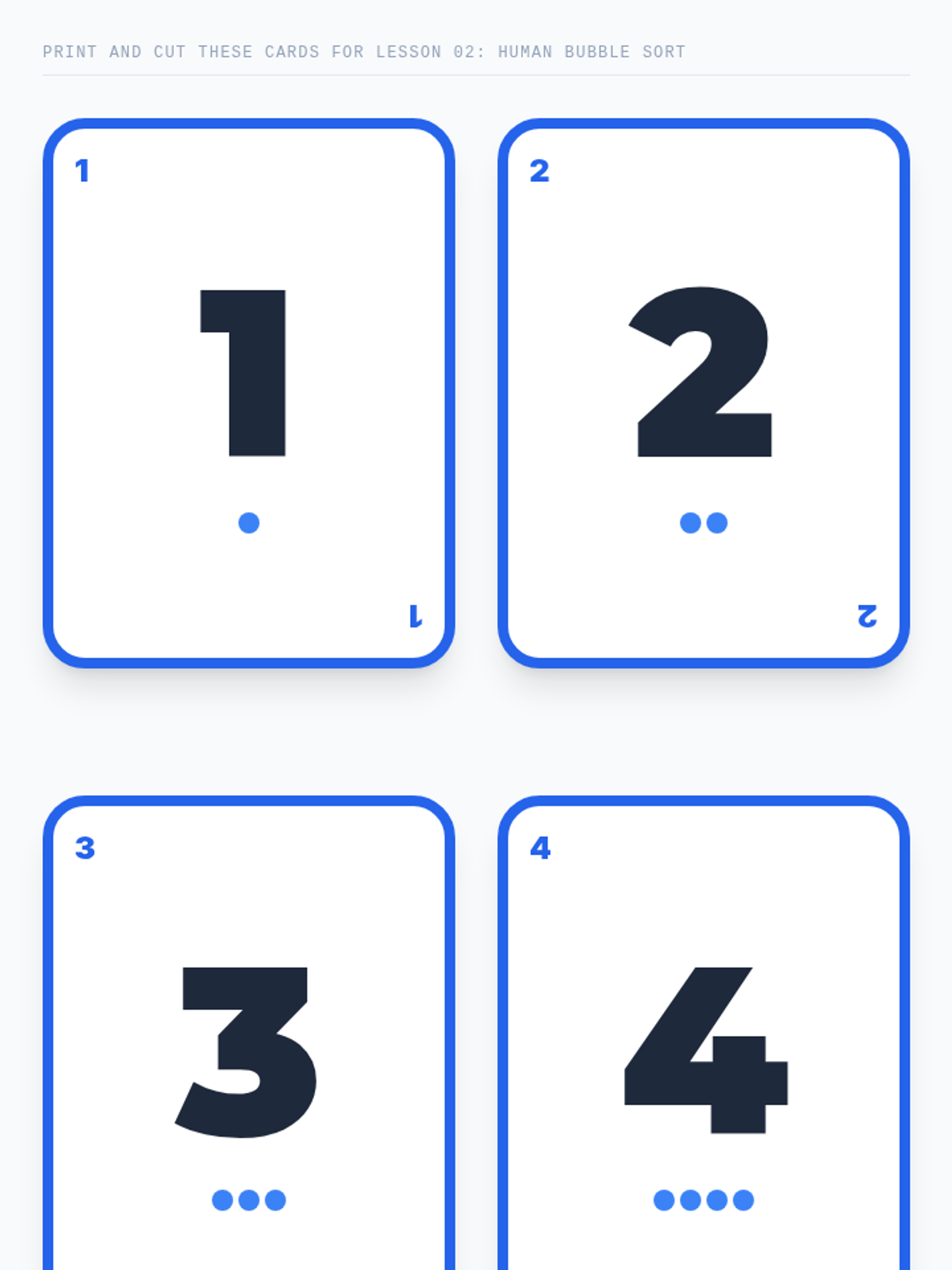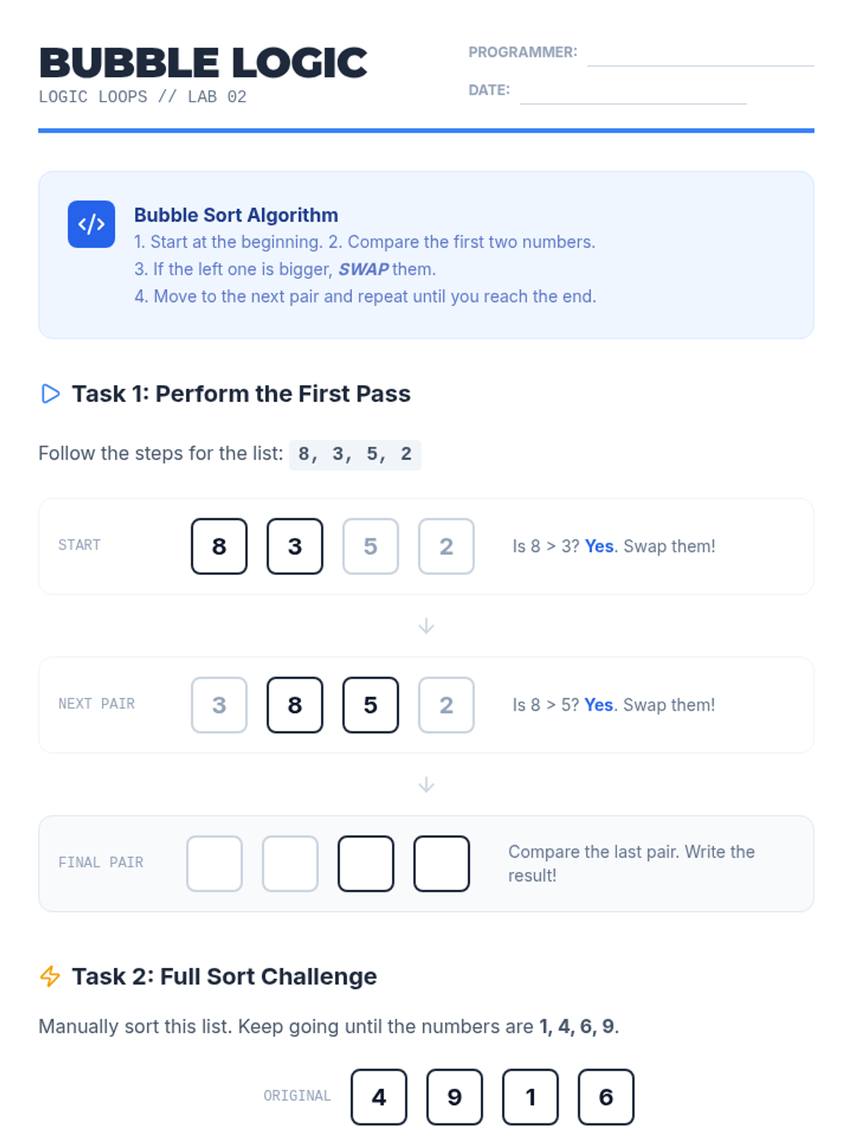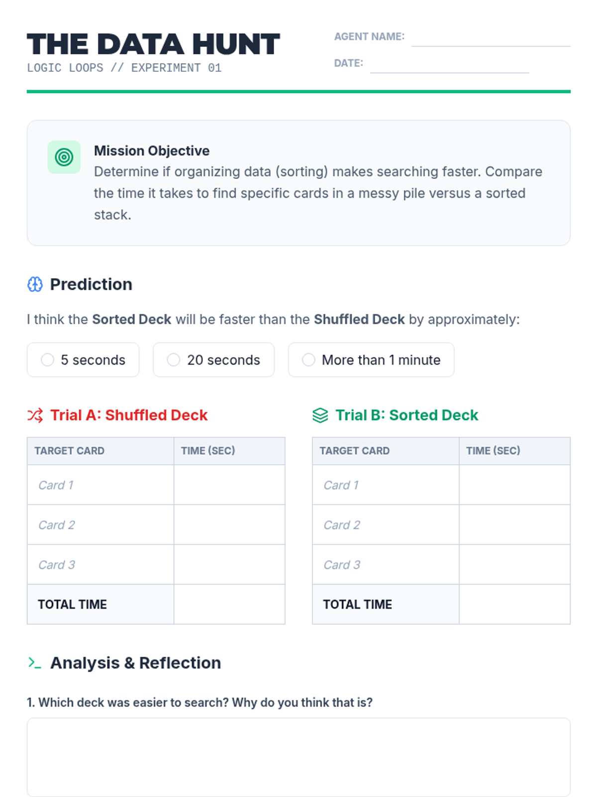 A 5-lesson unit for 4th graders exploring algorithmic efficiency, sorting algorithms (Bubble, Merge), and searching strategies (Linear, Binary) through kinesthetic simulations and data analysis.