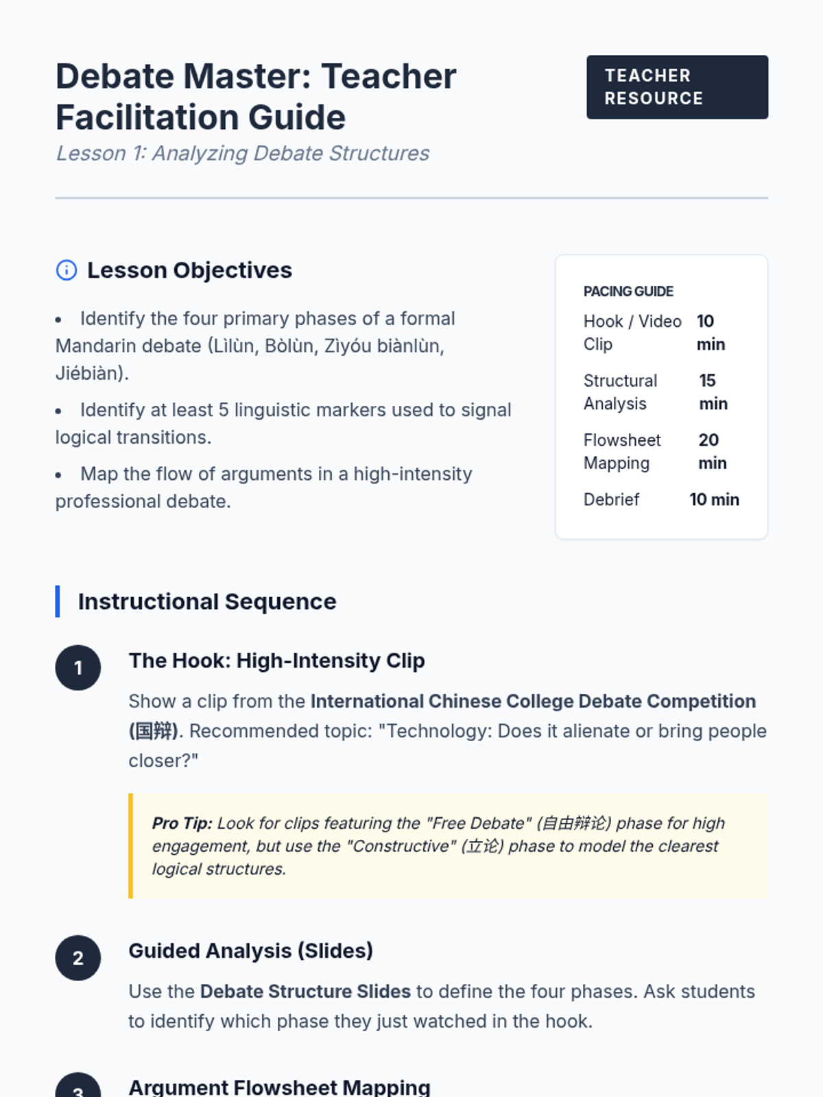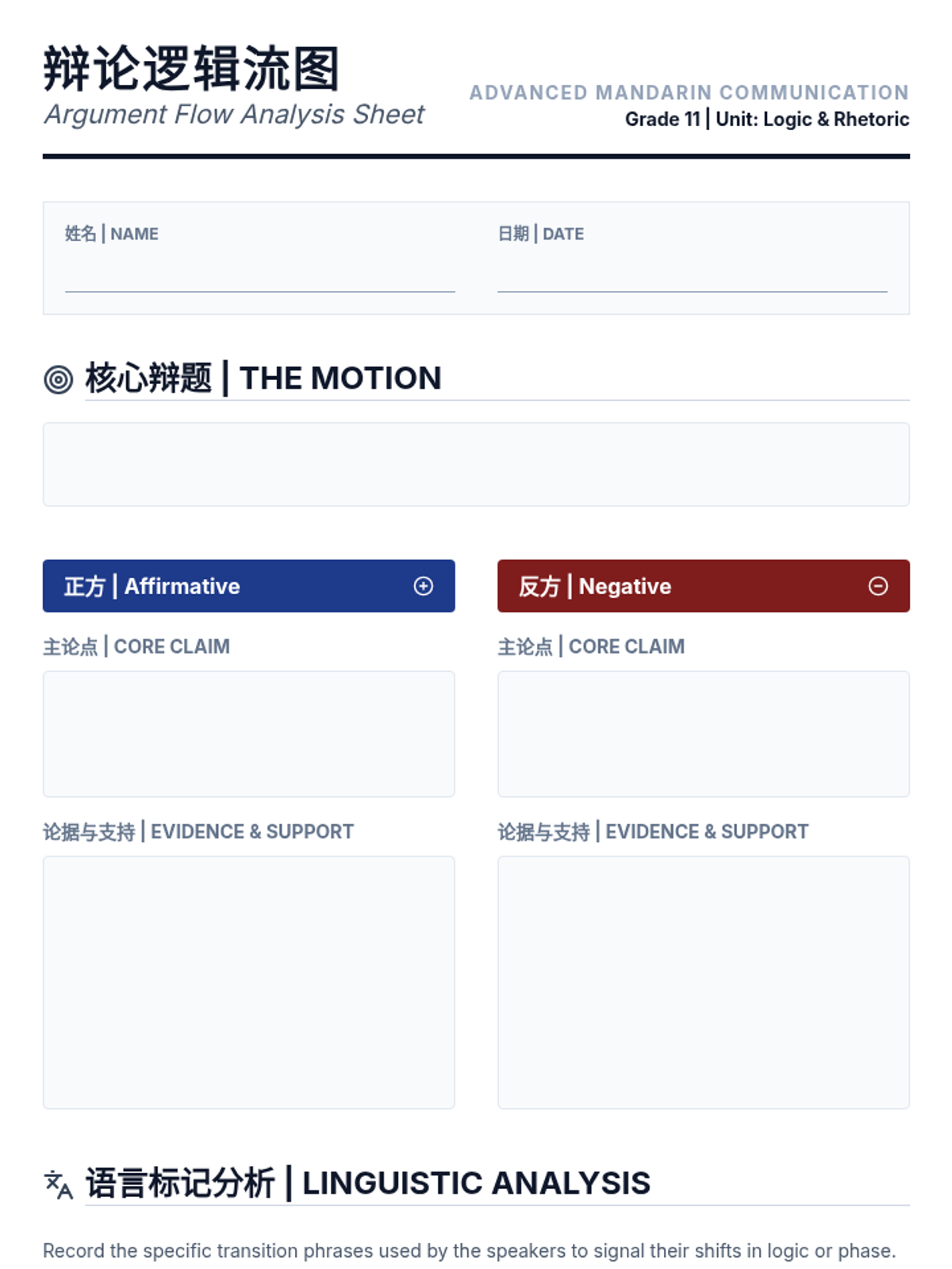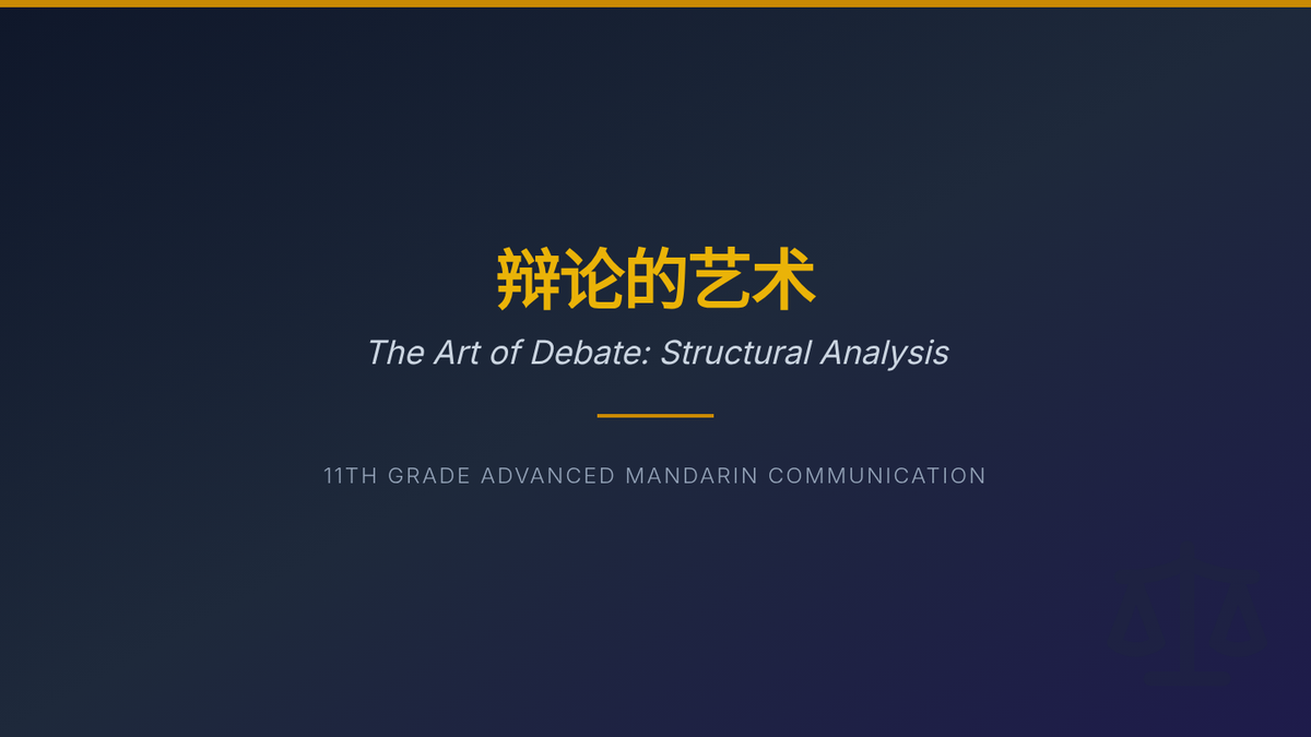 A high-level Mandarin Chinese sequence for 11th-grade students focused on formal argumentation, rhetorical structures, and debate. Students progress from analyzing professional debates to mastering complex logical connectors and participating in a formal classroom debate on social issues.