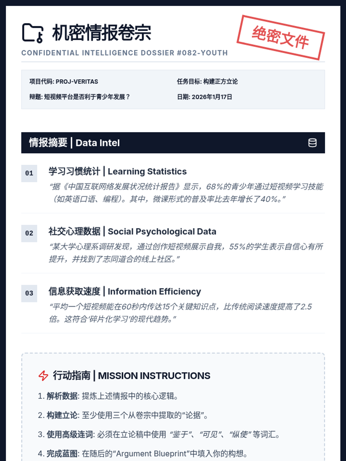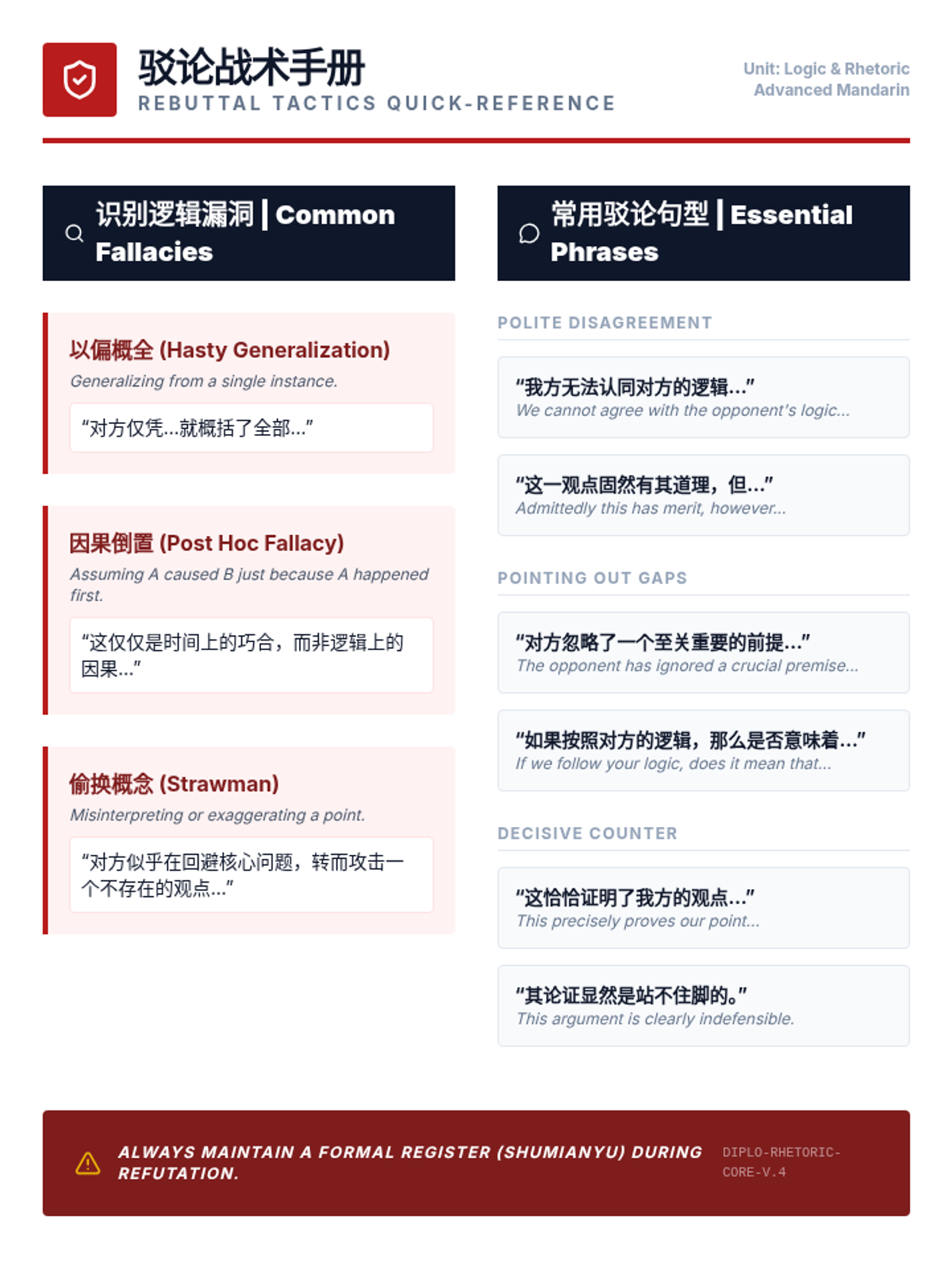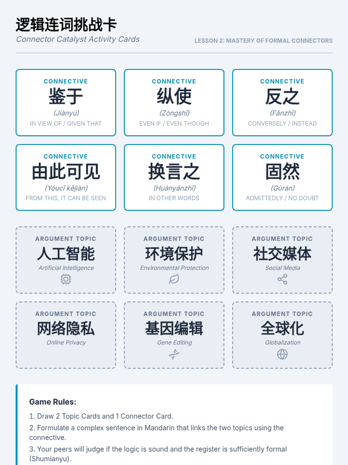 A high-level Mandarin Chinese sequence for 11th-grade students focused on formal argumentation, rhetorical structures, and debate. Students progress from analyzing professional debates to mastering complex logical connectors and participating in a formal classroom debate on social issues.