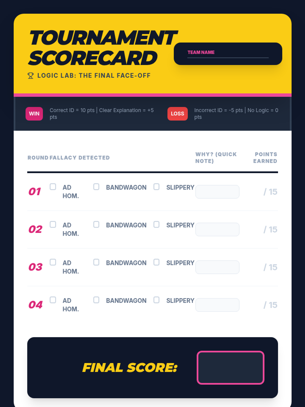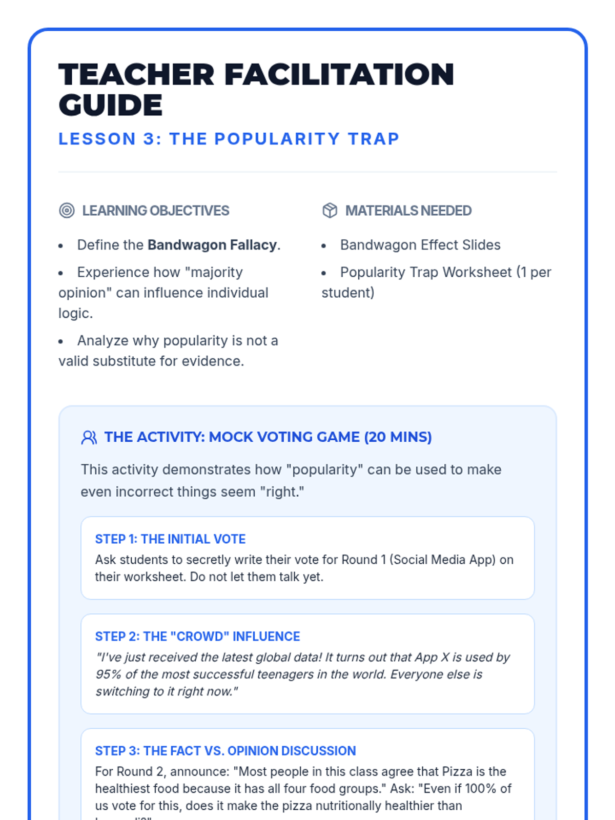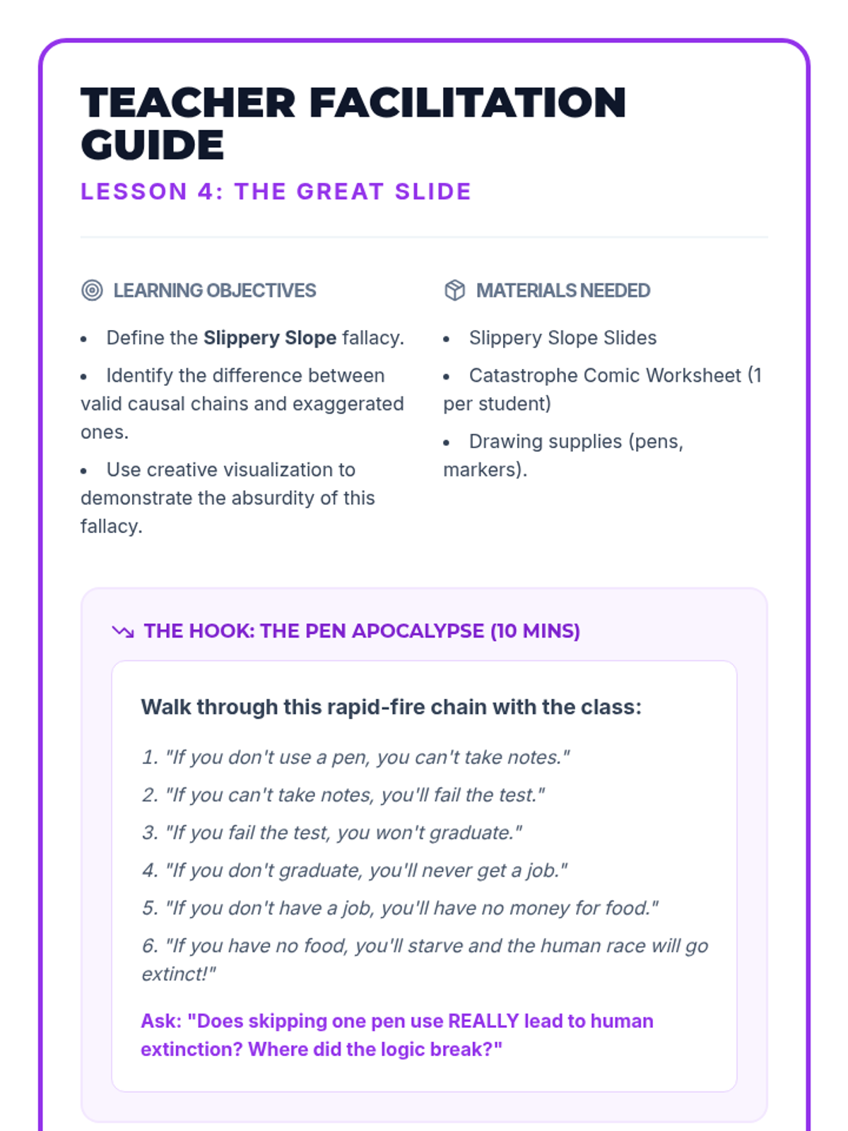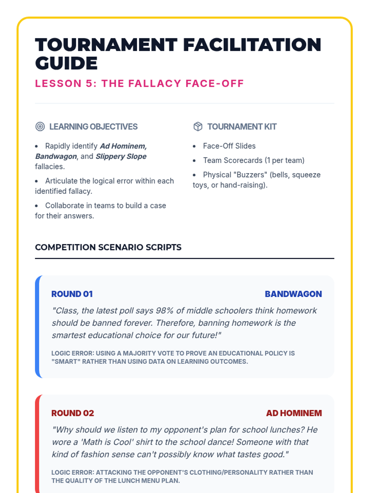 A high-energy, gamified introduction to logical fallacies for 7th graders. Students learn to identify Ad Hominem, Bandwagon, and Slippery Slope fallacies through interactive simulations, comic creation, and a culminating team competition.