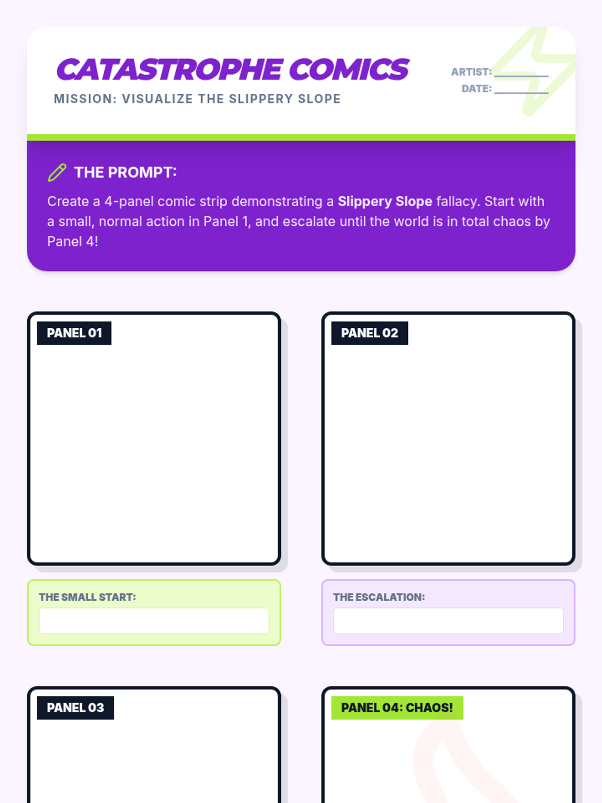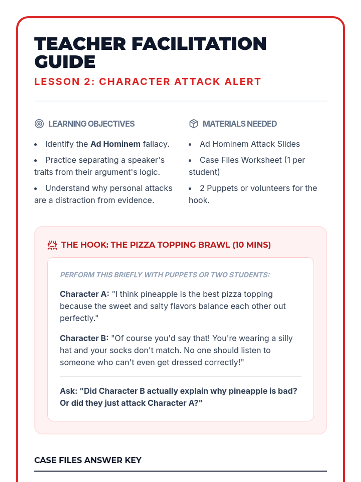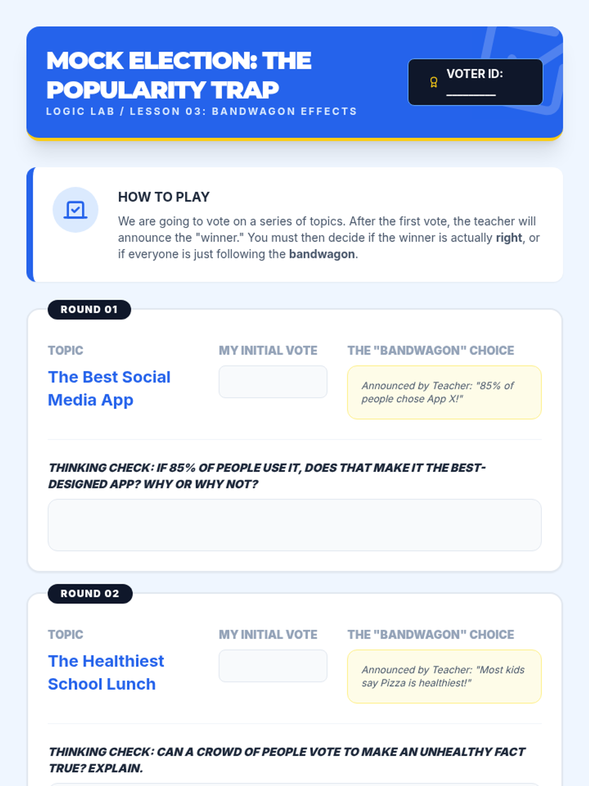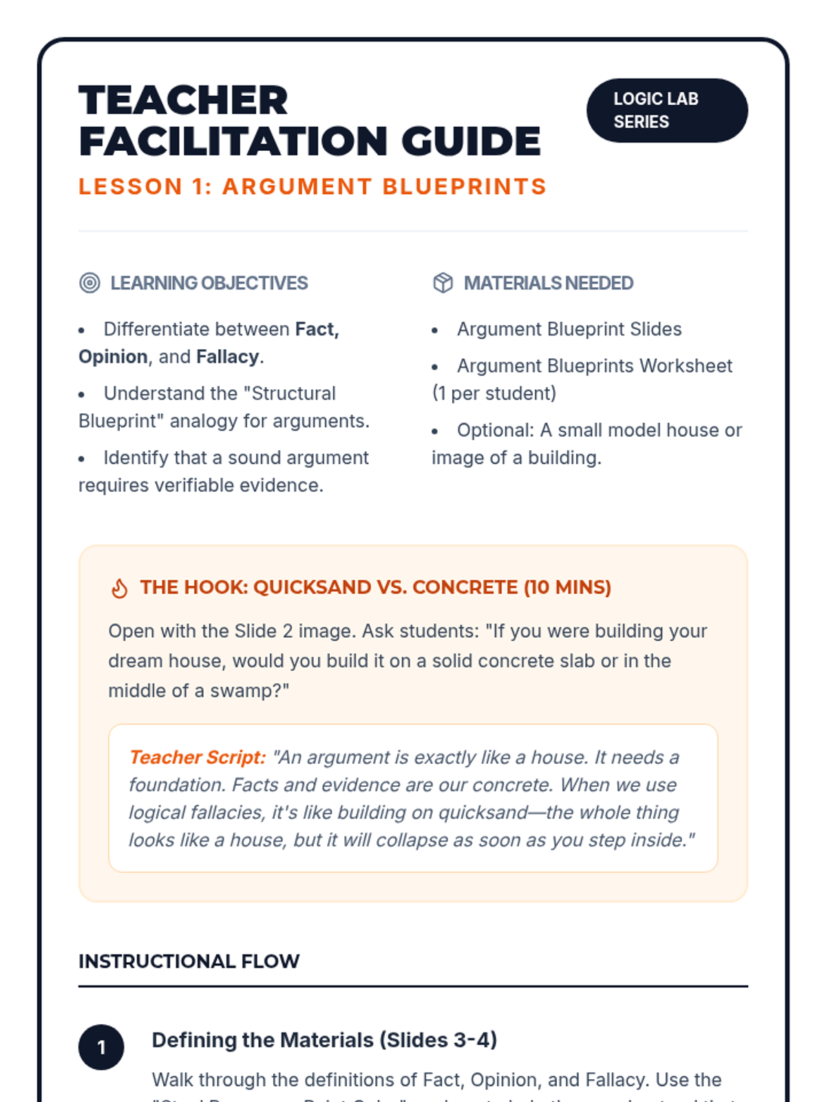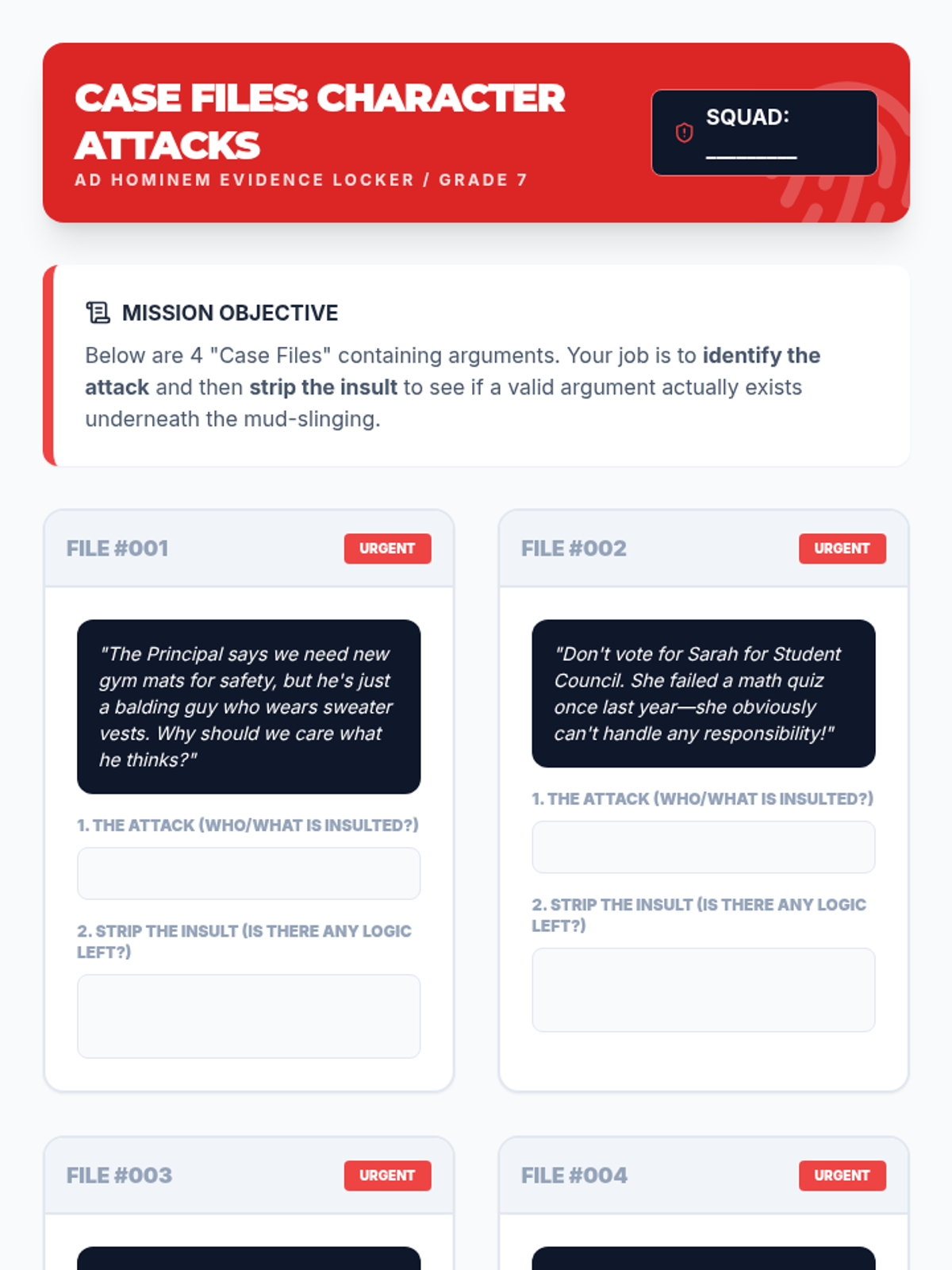 A high-energy, gamified introduction to logical fallacies for 7th graders. Students learn to identify Ad Hominem, Bandwagon, and Slippery Slope fallacies through interactive simulations, comic creation, and a culminating team competition.