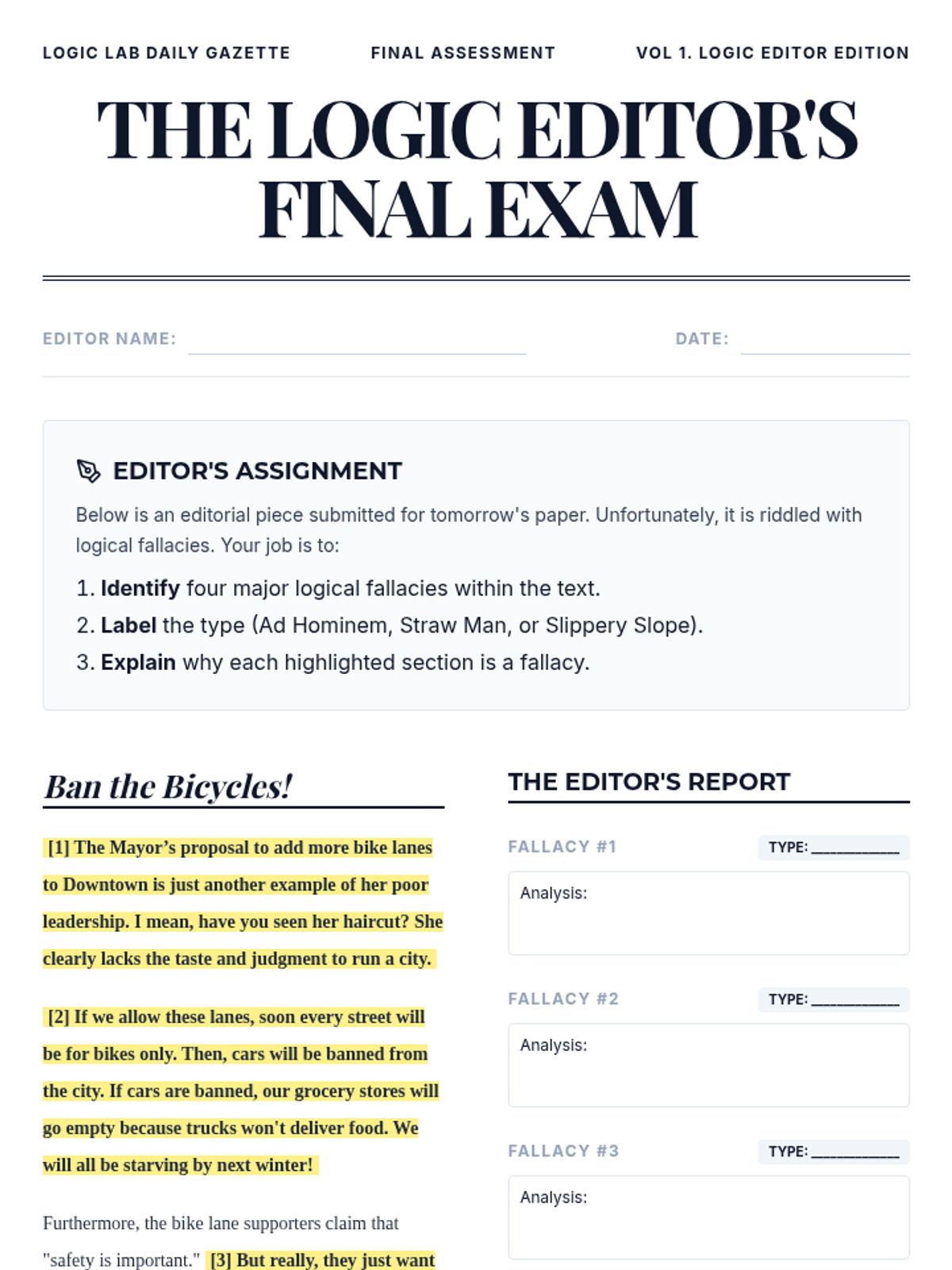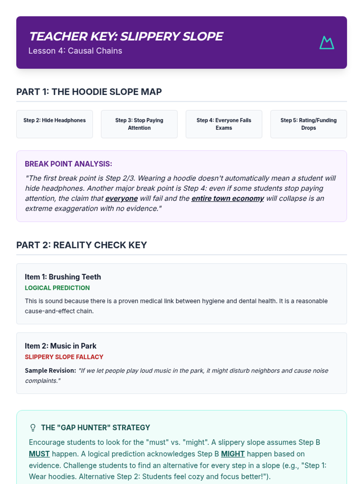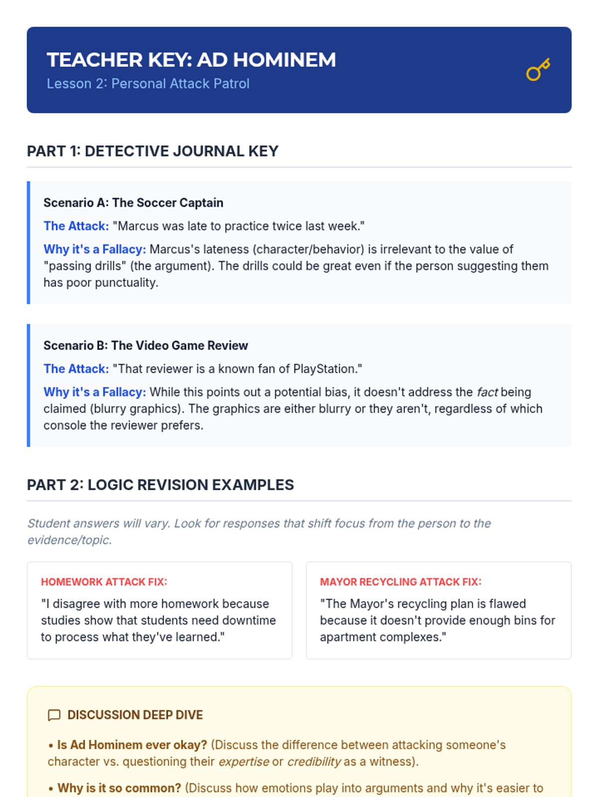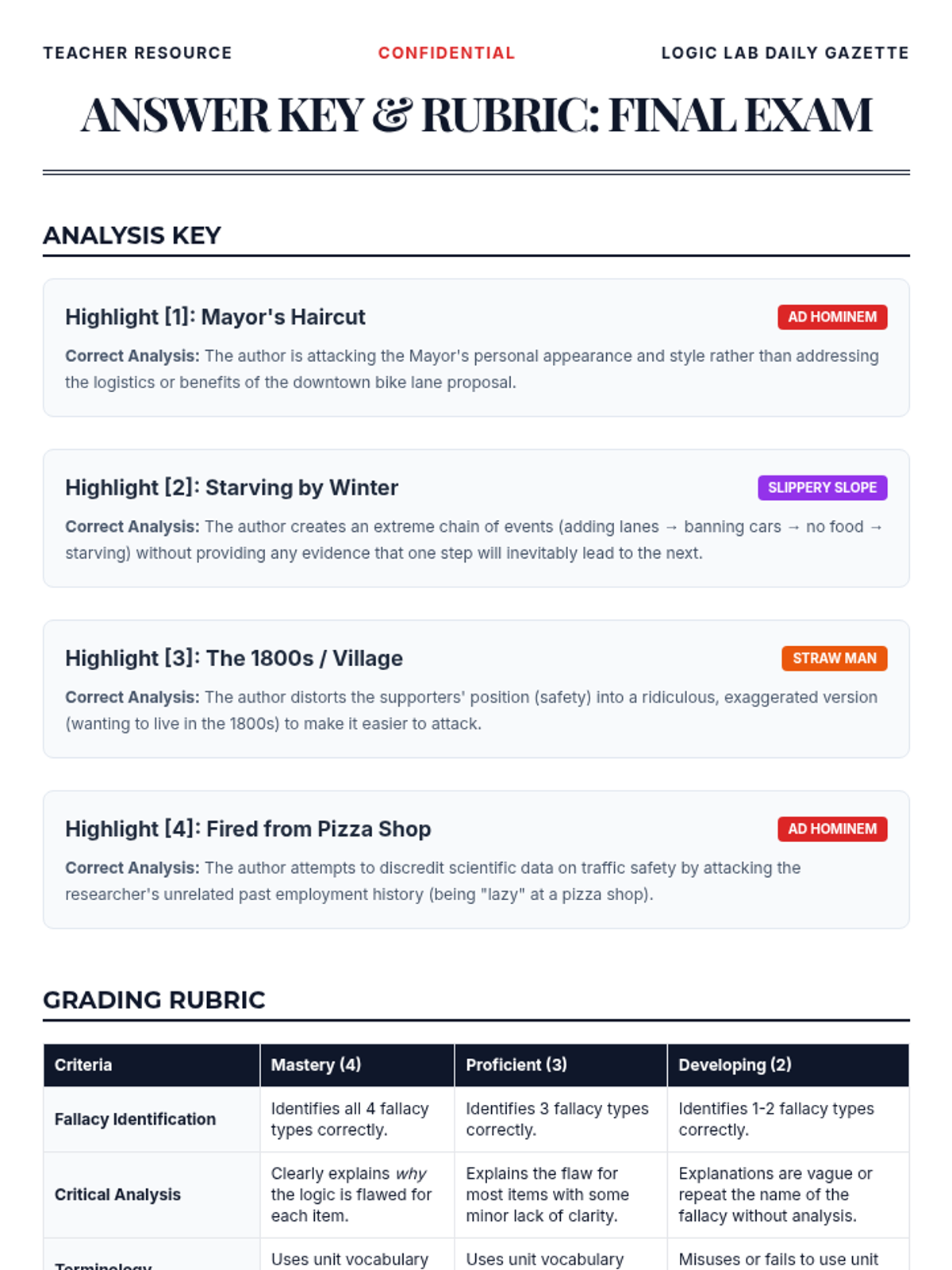 A comprehensive unit for 8th-grade students on identifying and analyzing common logical fallacies. Students progress from basic logical structures to specific fallacies like ad hominem, straw man, and slippery slope, culminating in a full-text analysis assessment.