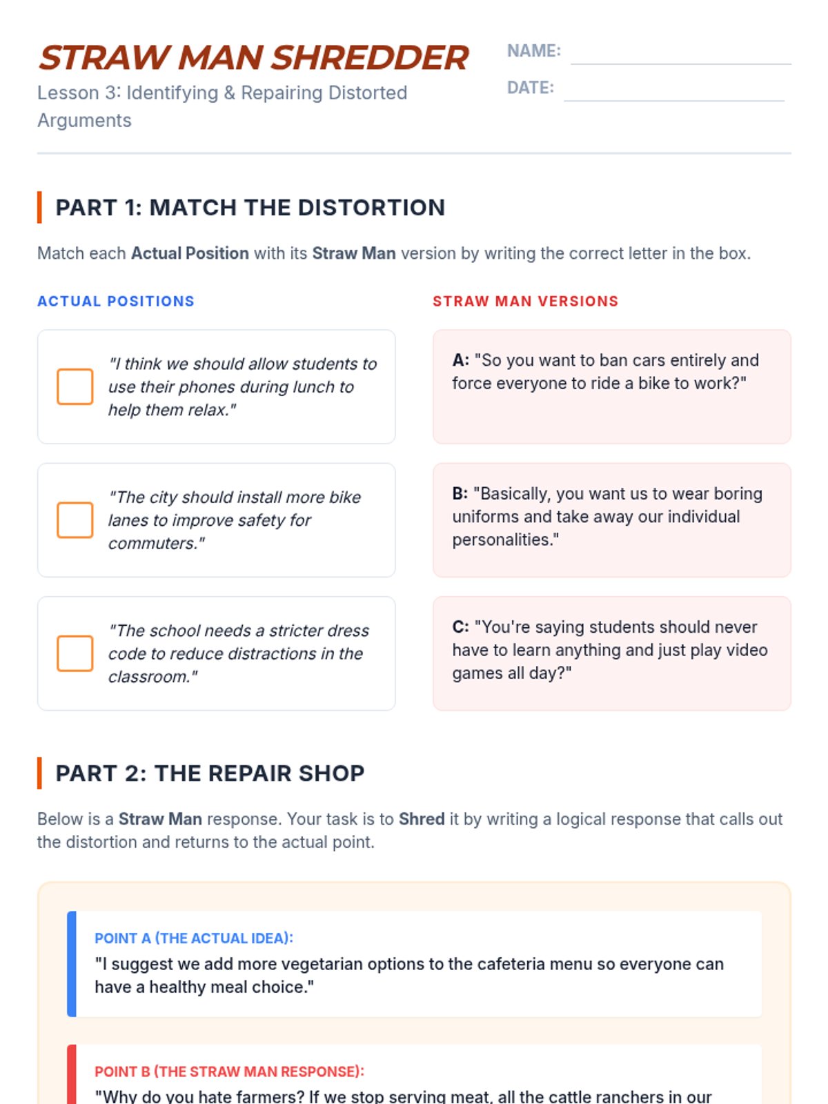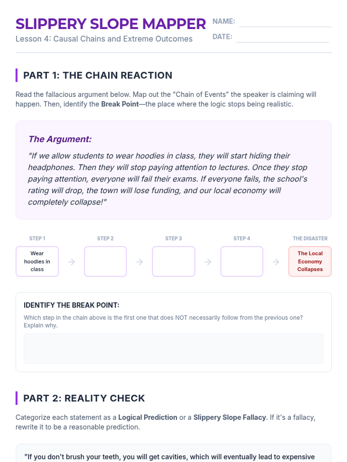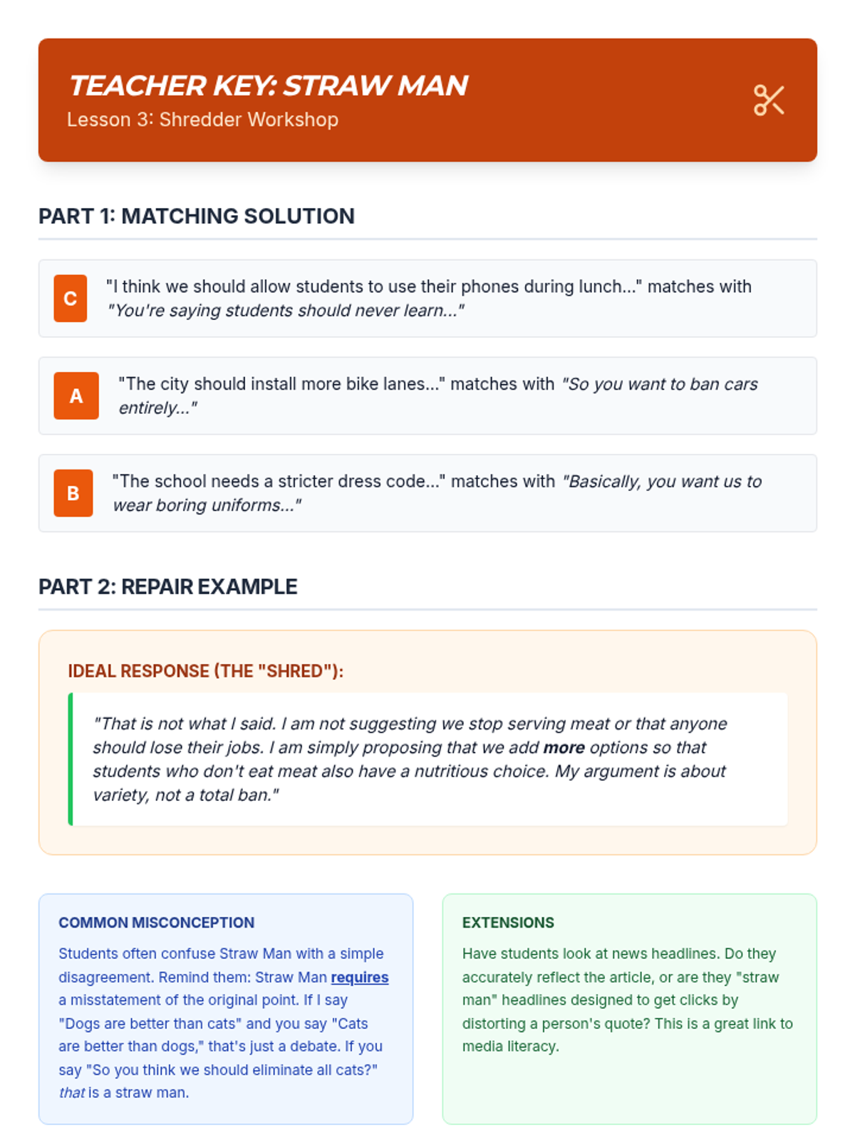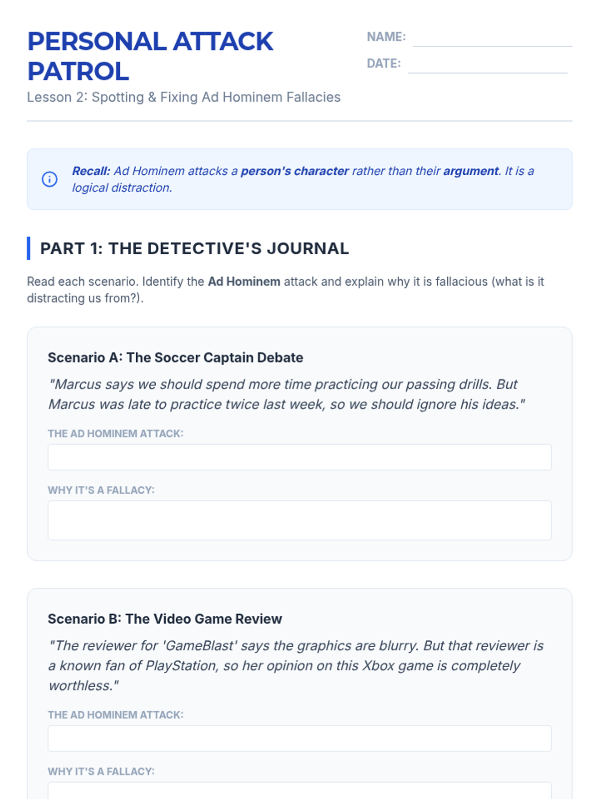 A comprehensive unit for 8th-grade students on identifying and analyzing common logical fallacies. Students progress from basic logical structures to specific fallacies like ad hominem, straw man, and slippery slope, culminating in a full-text analysis assessment.