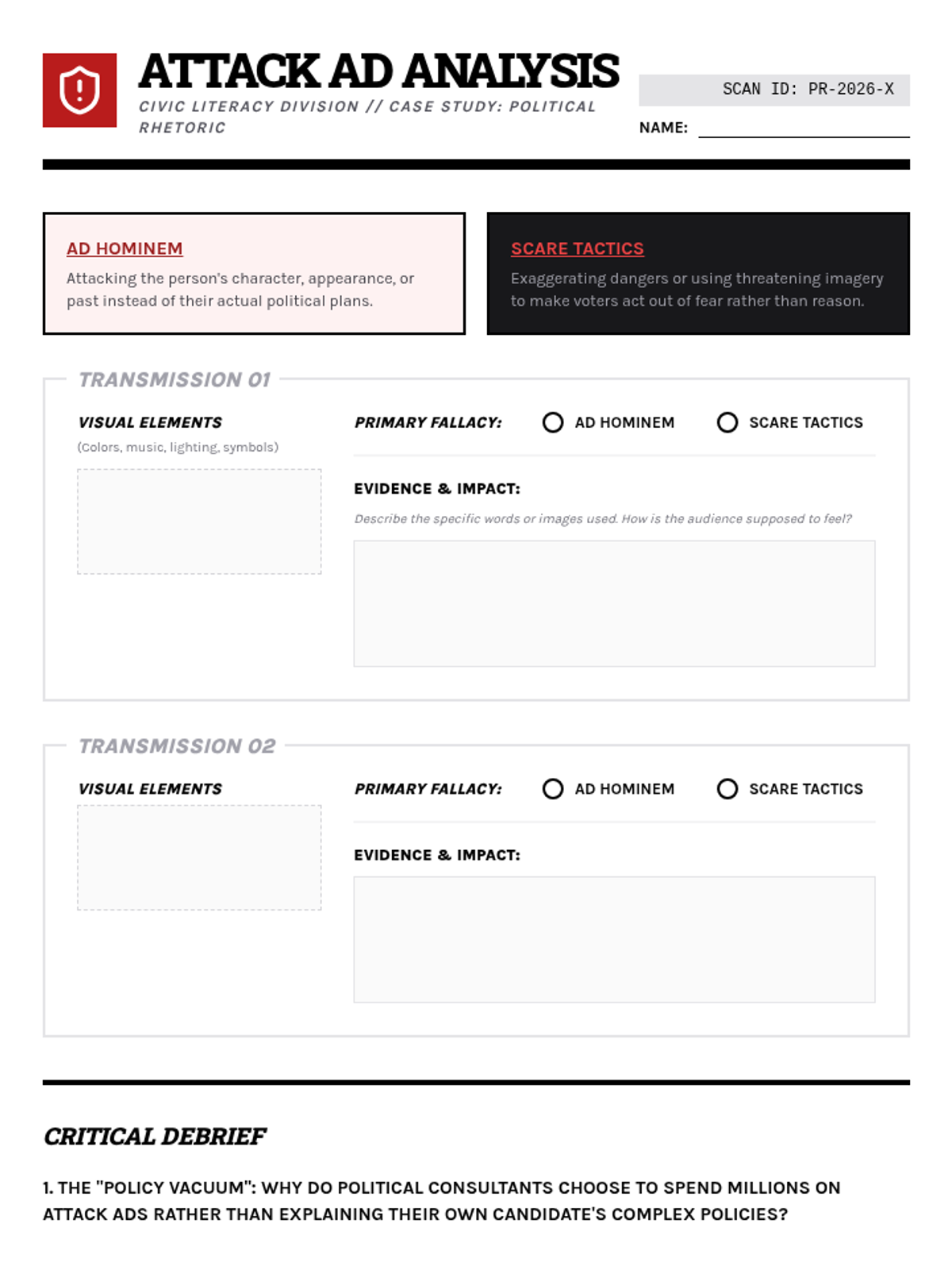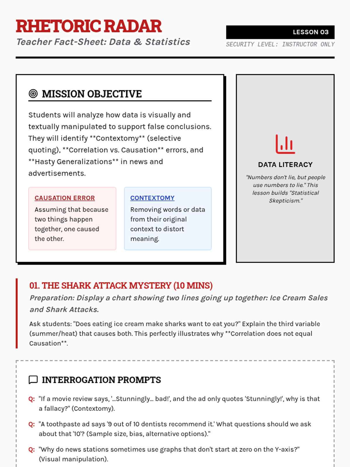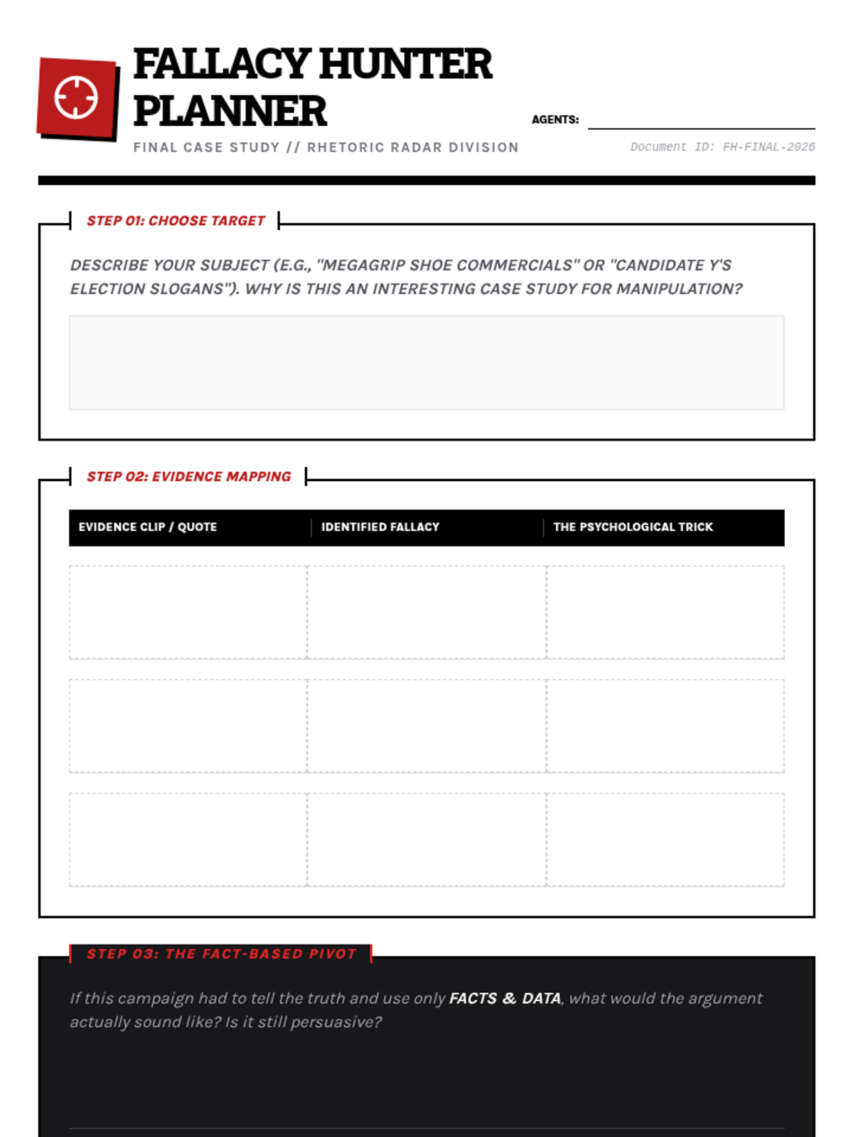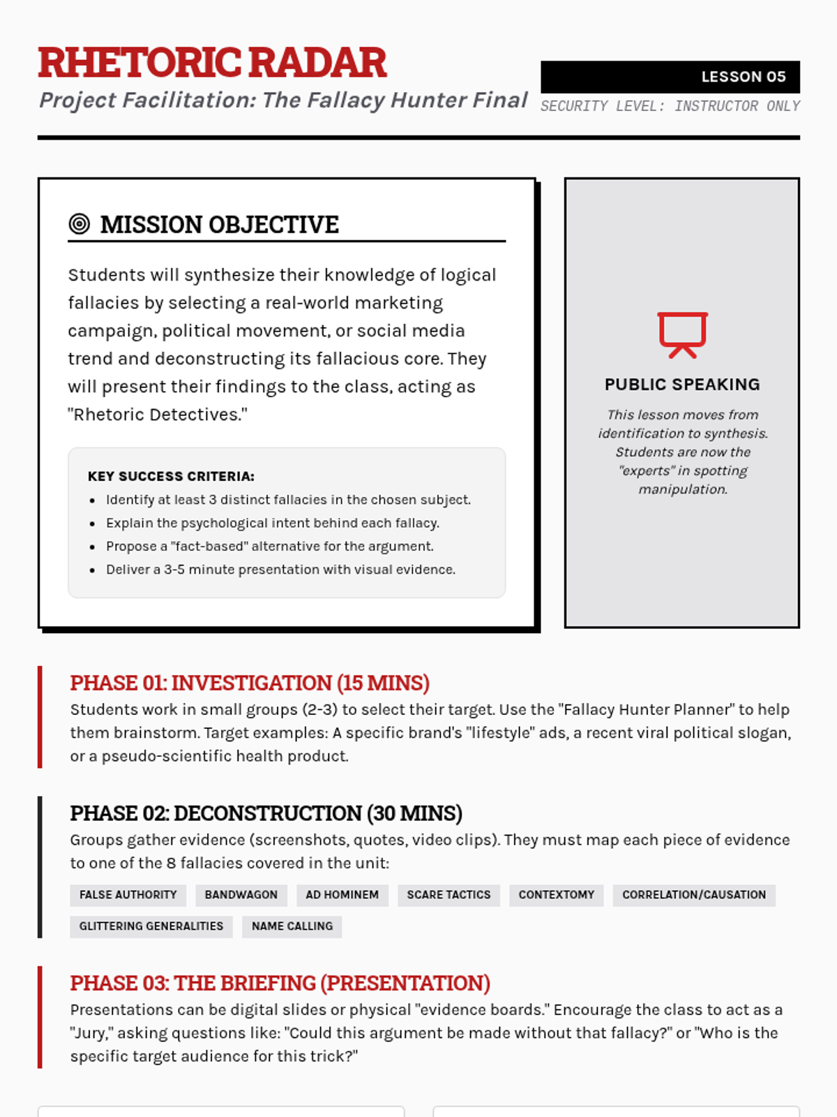 A media-literacy focused unit where 9th-grade students analyze logical fallacies in advertising, political rhetoric, and data presentation. Students move from identifying basic manipulative tactics to presenting a comprehensive critique of real-world persuasion campaigns.