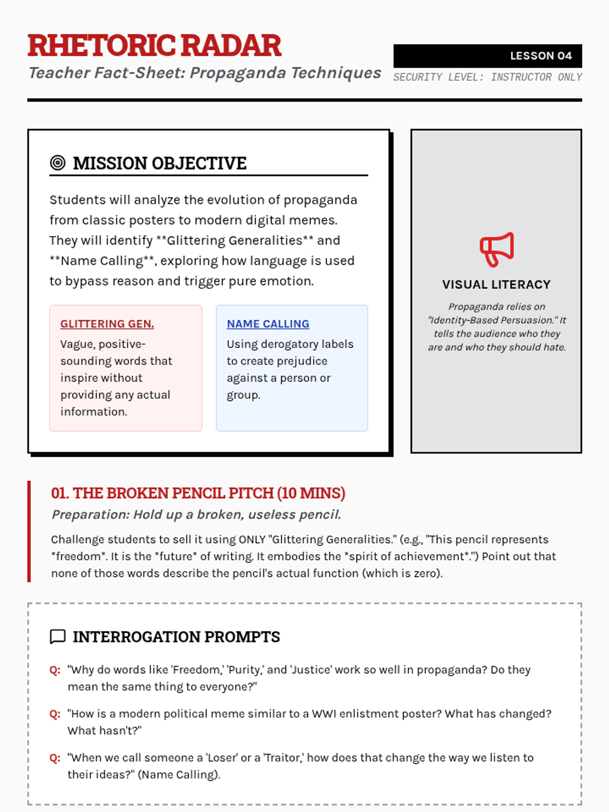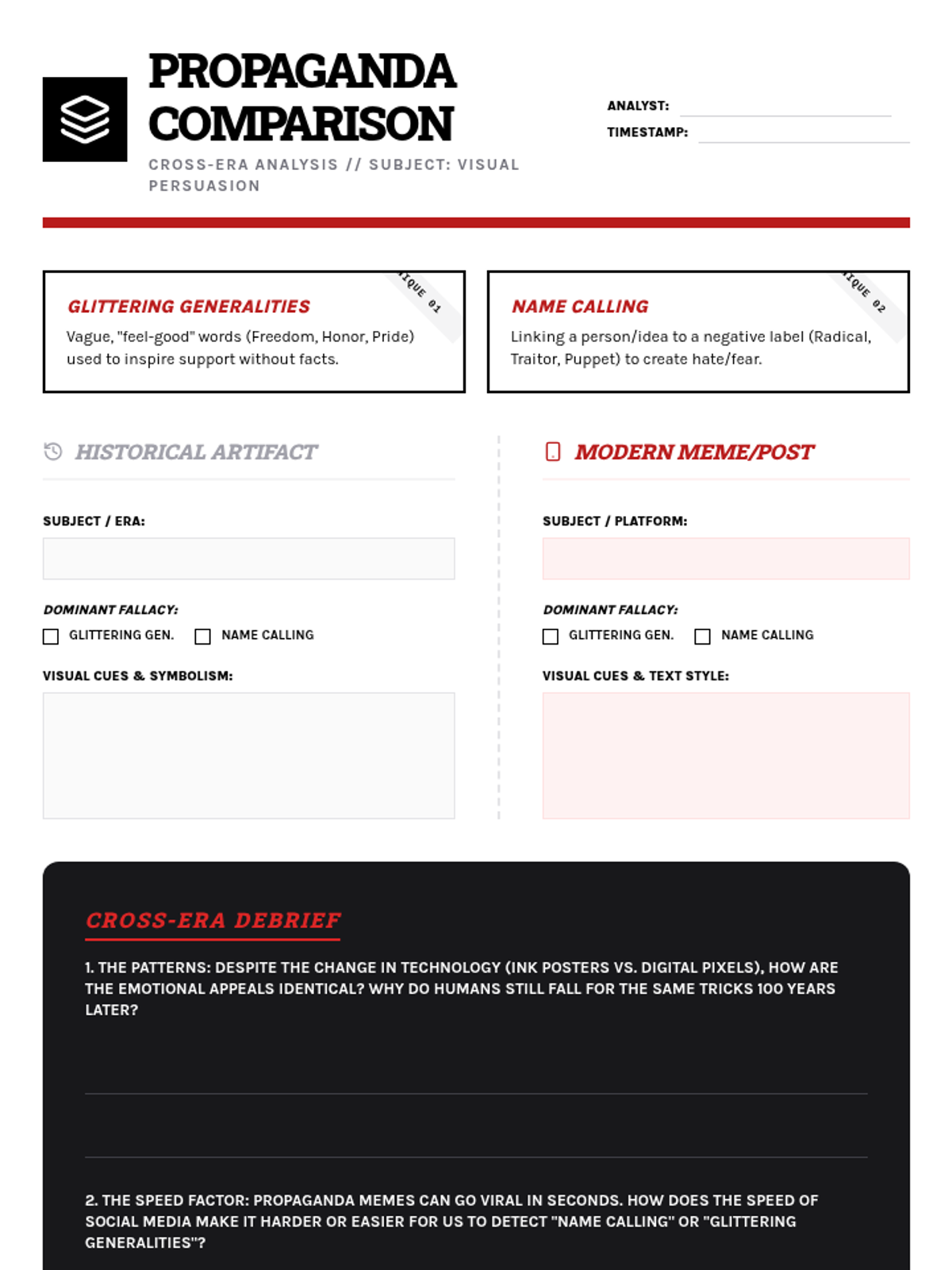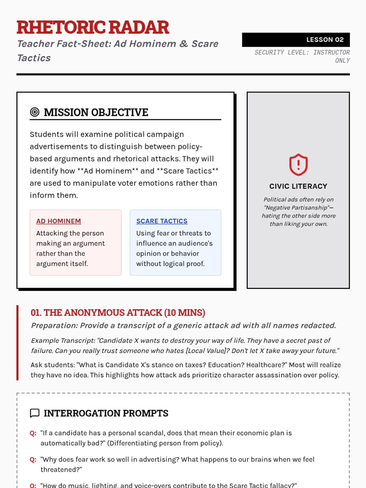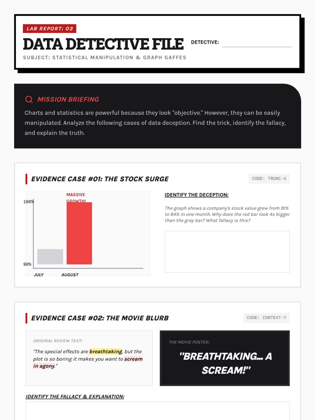 A media-literacy focused unit where 9th-grade students analyze logical fallacies in advertising, political rhetoric, and data presentation. Students move from identifying basic manipulative tactics to presenting a comprehensive critique of real-world persuasion campaigns.