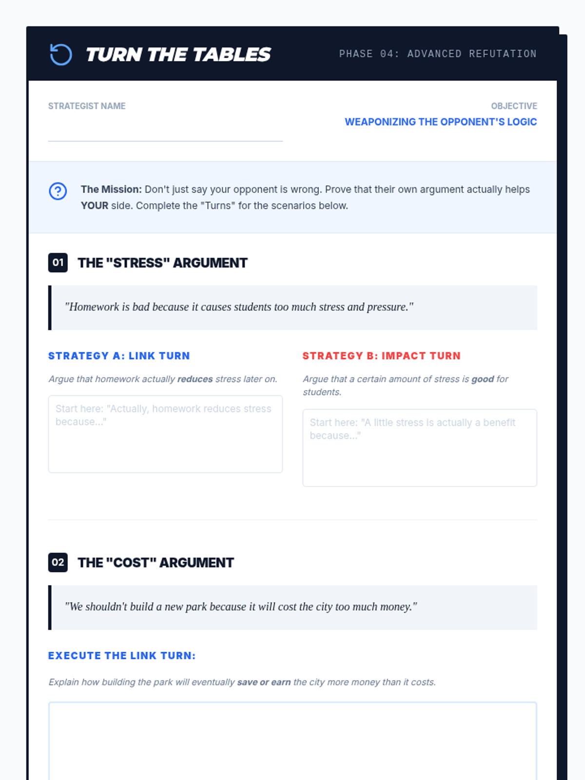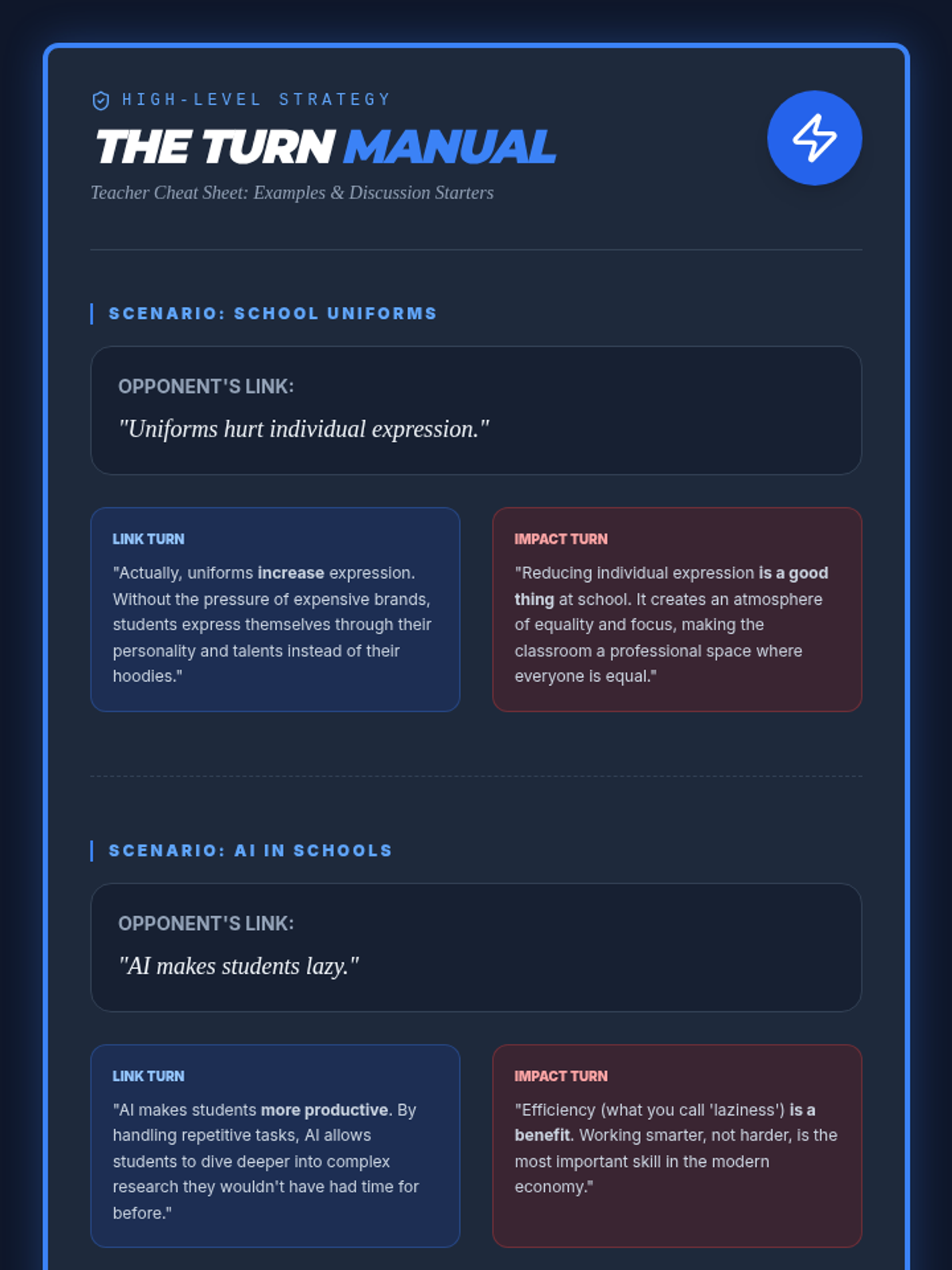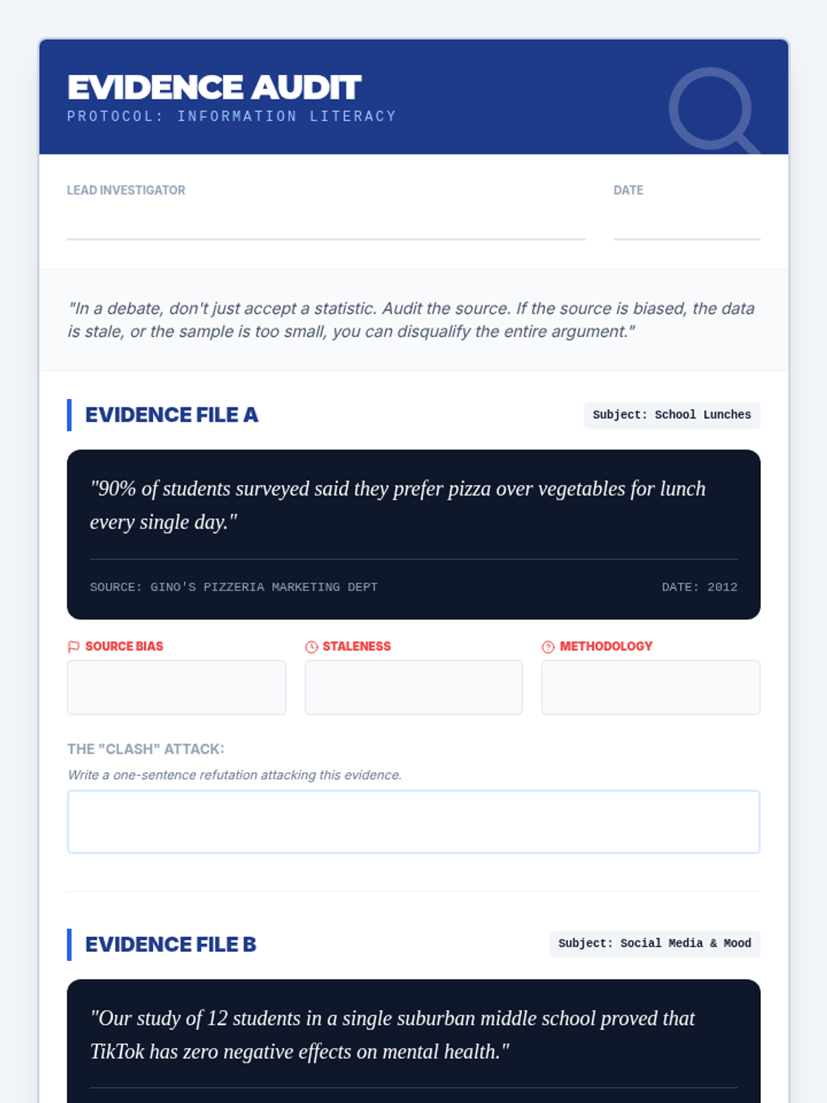 A 5-lesson sequence for 7th-grade students on identifying and challenging logical fallacies in debate. Students move from understanding argument structure (Toulmin) to identifying common fallacies, evaluating evidence, and executing 'turns' to win clashes.