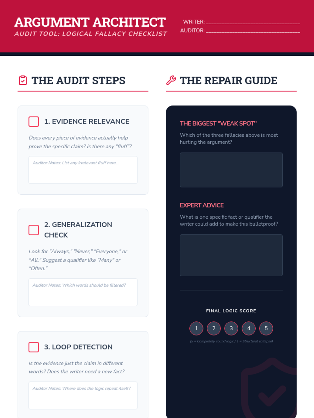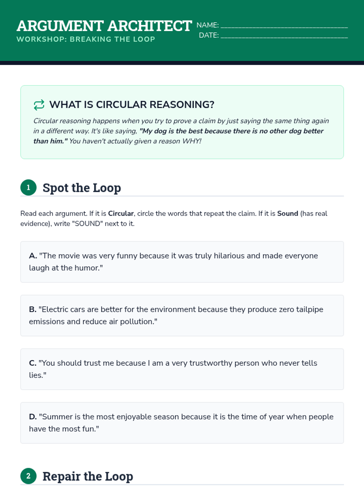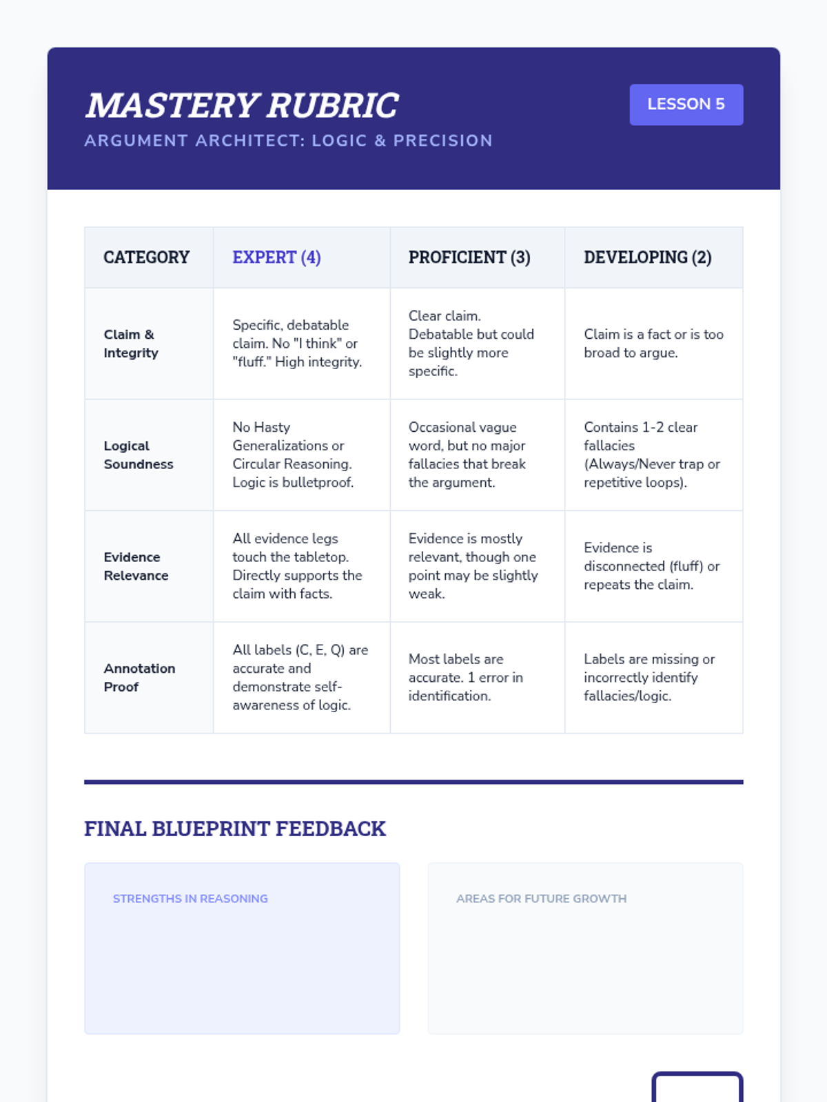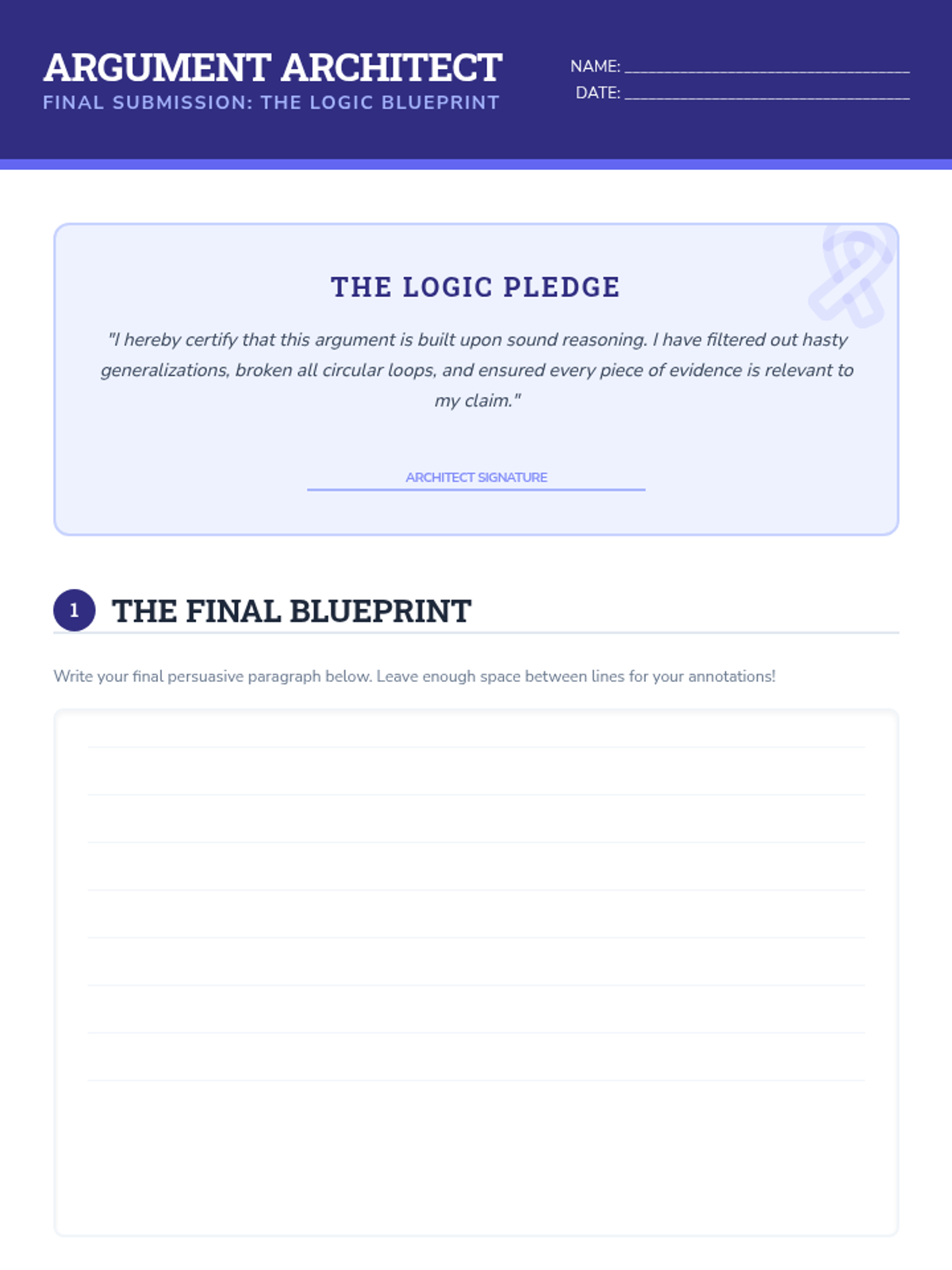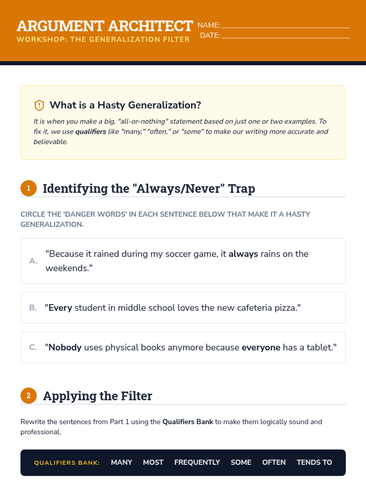 A workshop-style sequence designed for 6th graders to improve their argumentative writing by identifying and eliminating logical fallacies. Students transition from building strong claims to peer-reviewing work for Hasty Generalizations and Circular Reasoning, culminating in a logically sound persuasive paragraph.