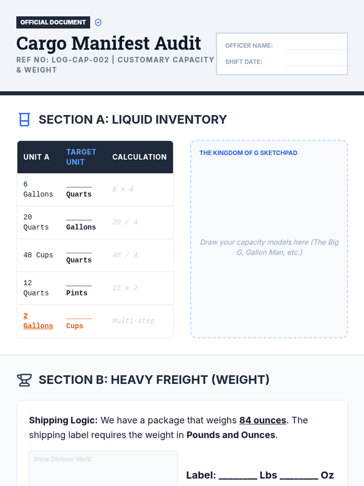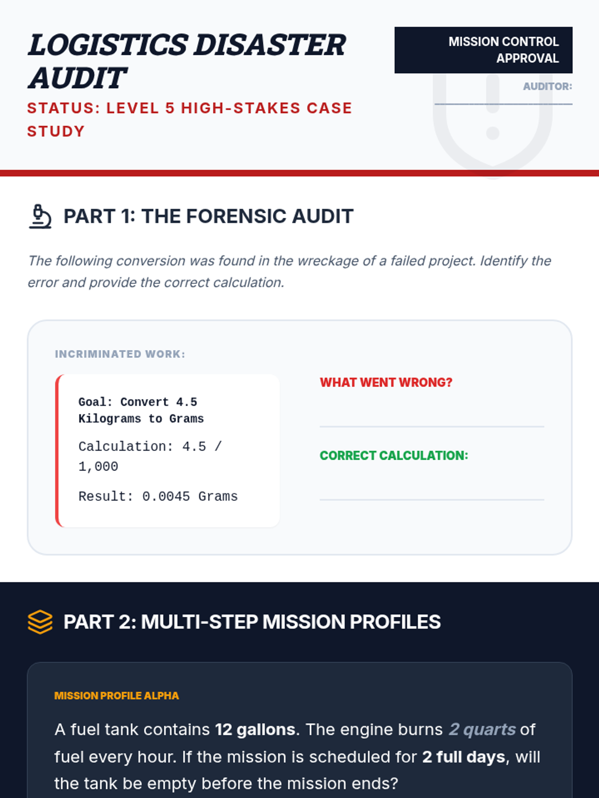 Students step into the role of supply chain coordinators to master unit conversions. They navigate customary and metric systems through the lens of warehouse logistics, international shipping, and multi-step problem solving.