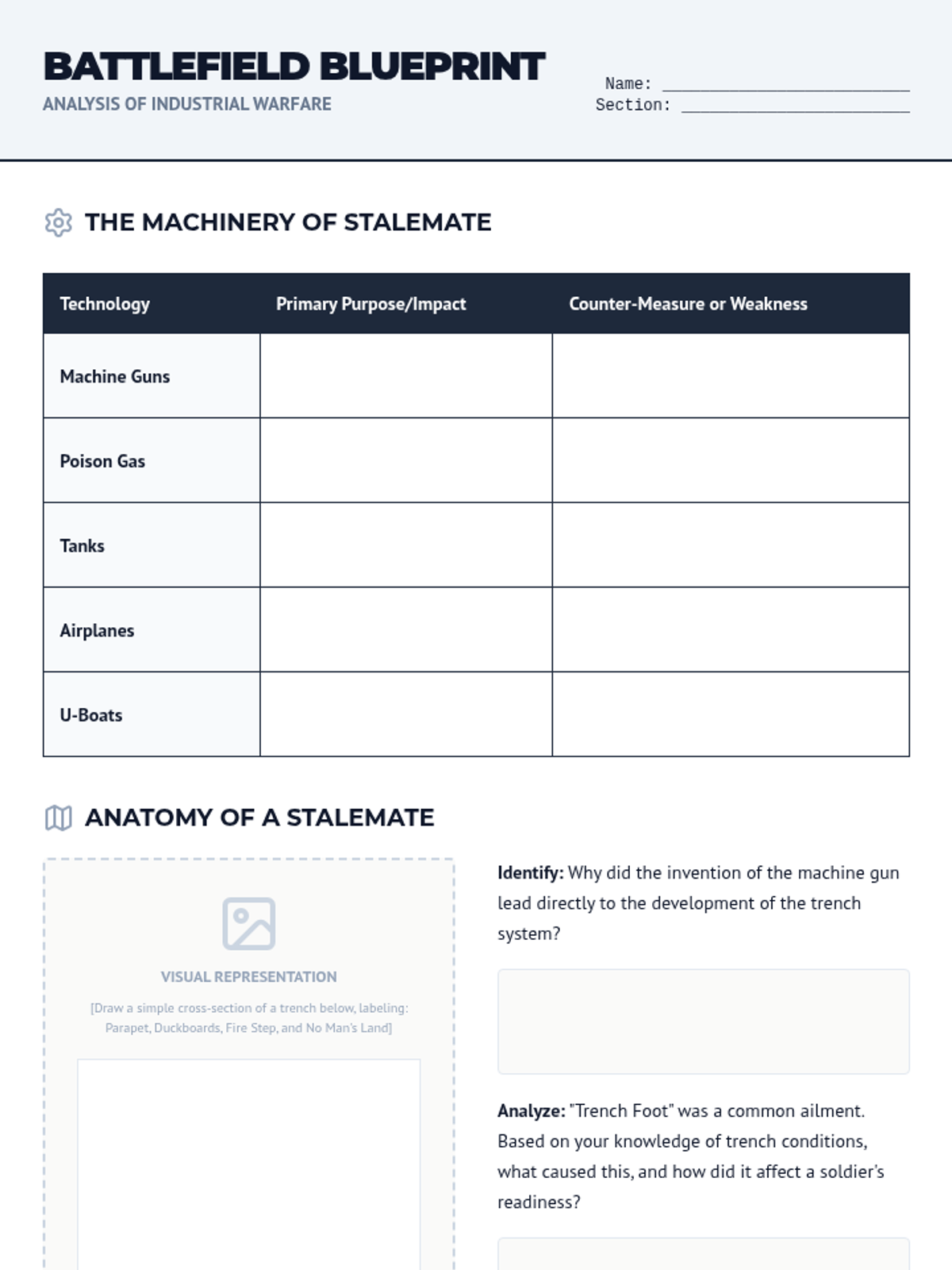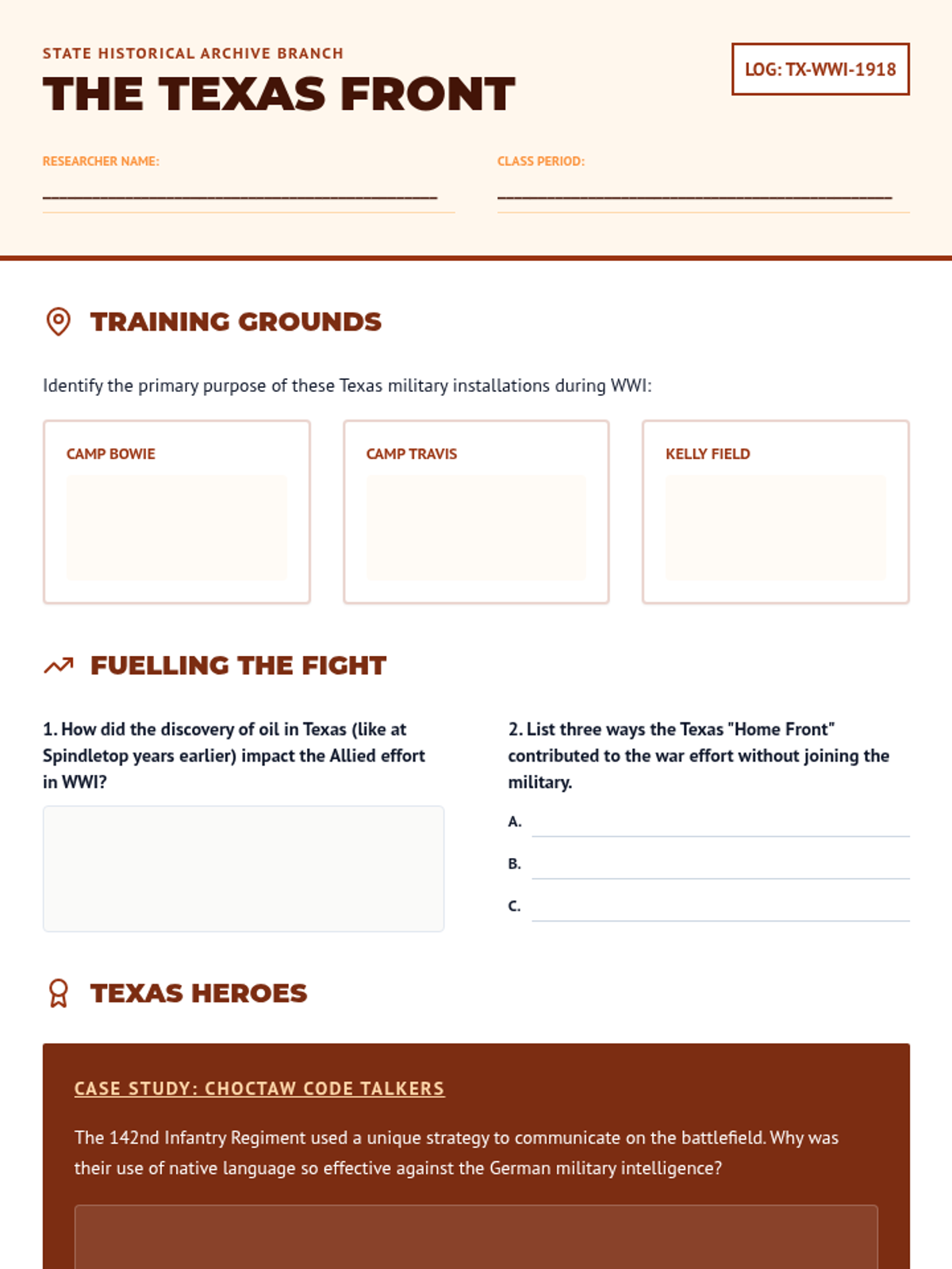 A comprehensive multi-day unit exploring World War I through a Texas lens, covering global causes, revolutionary military technology, the significant contributions of Texans, and the complex aftermath of the war.
