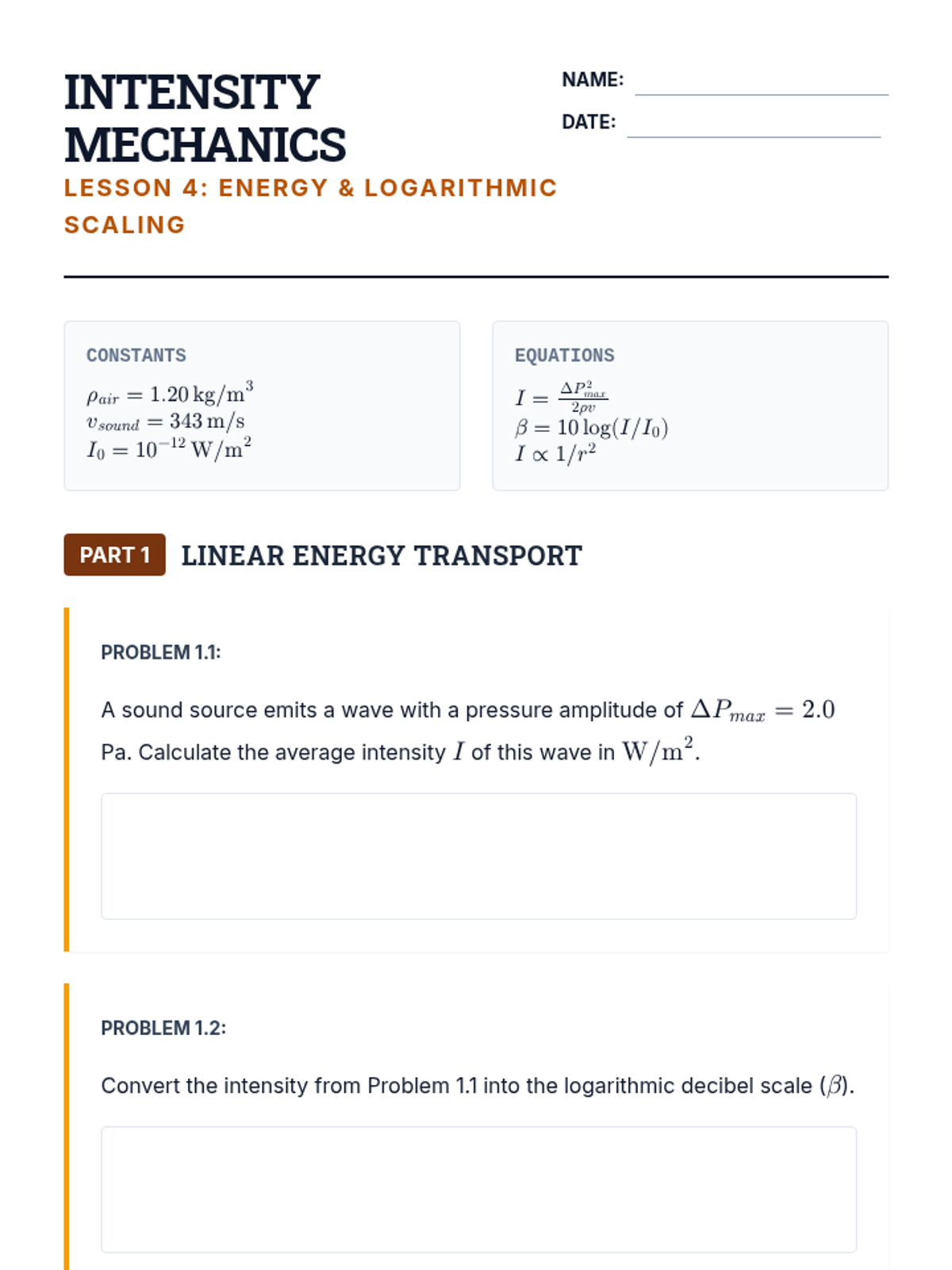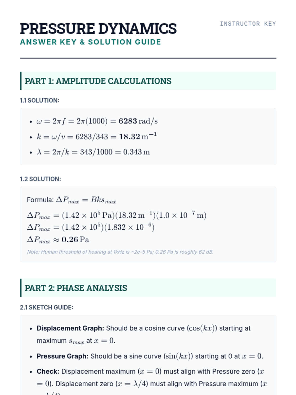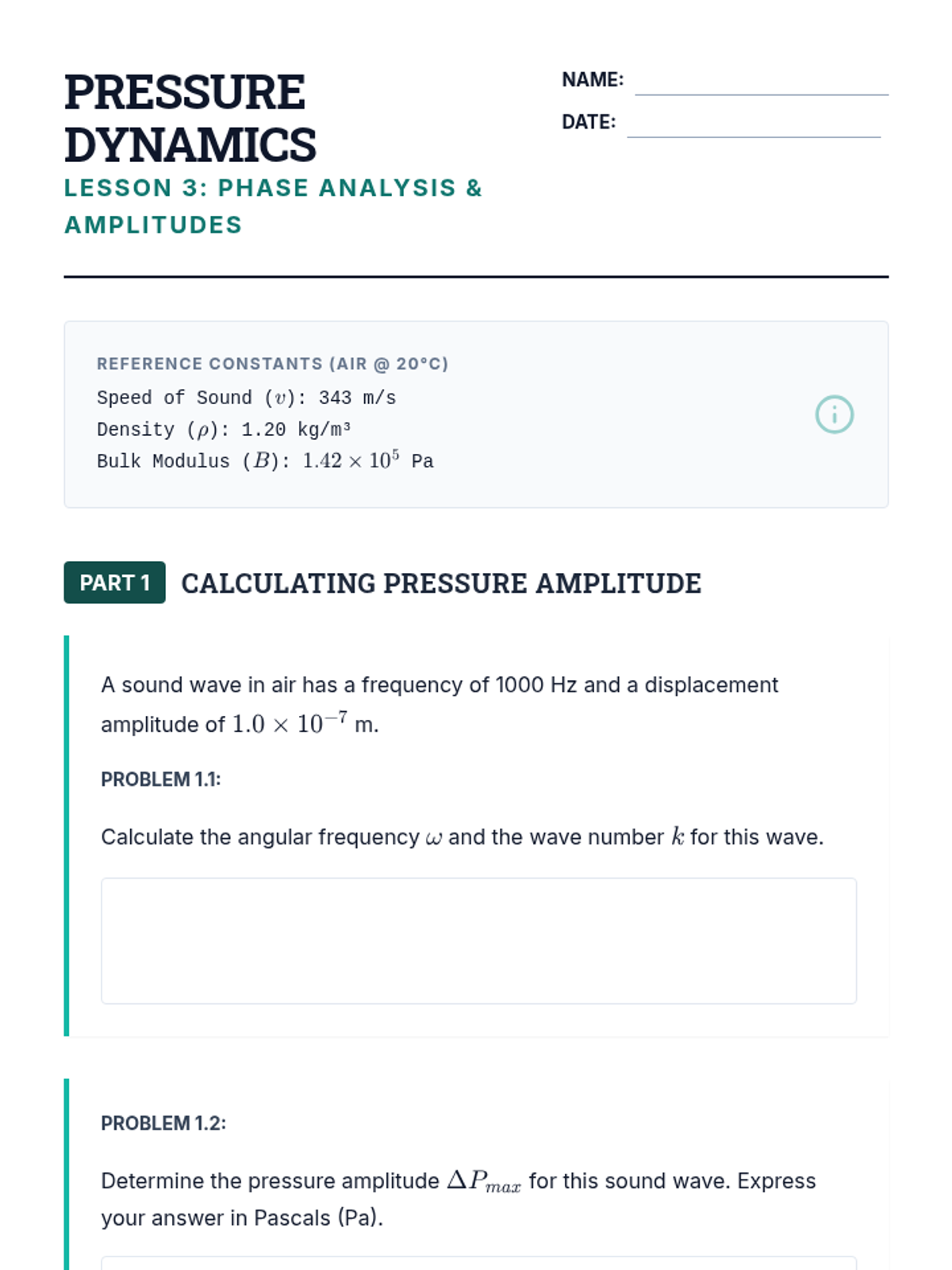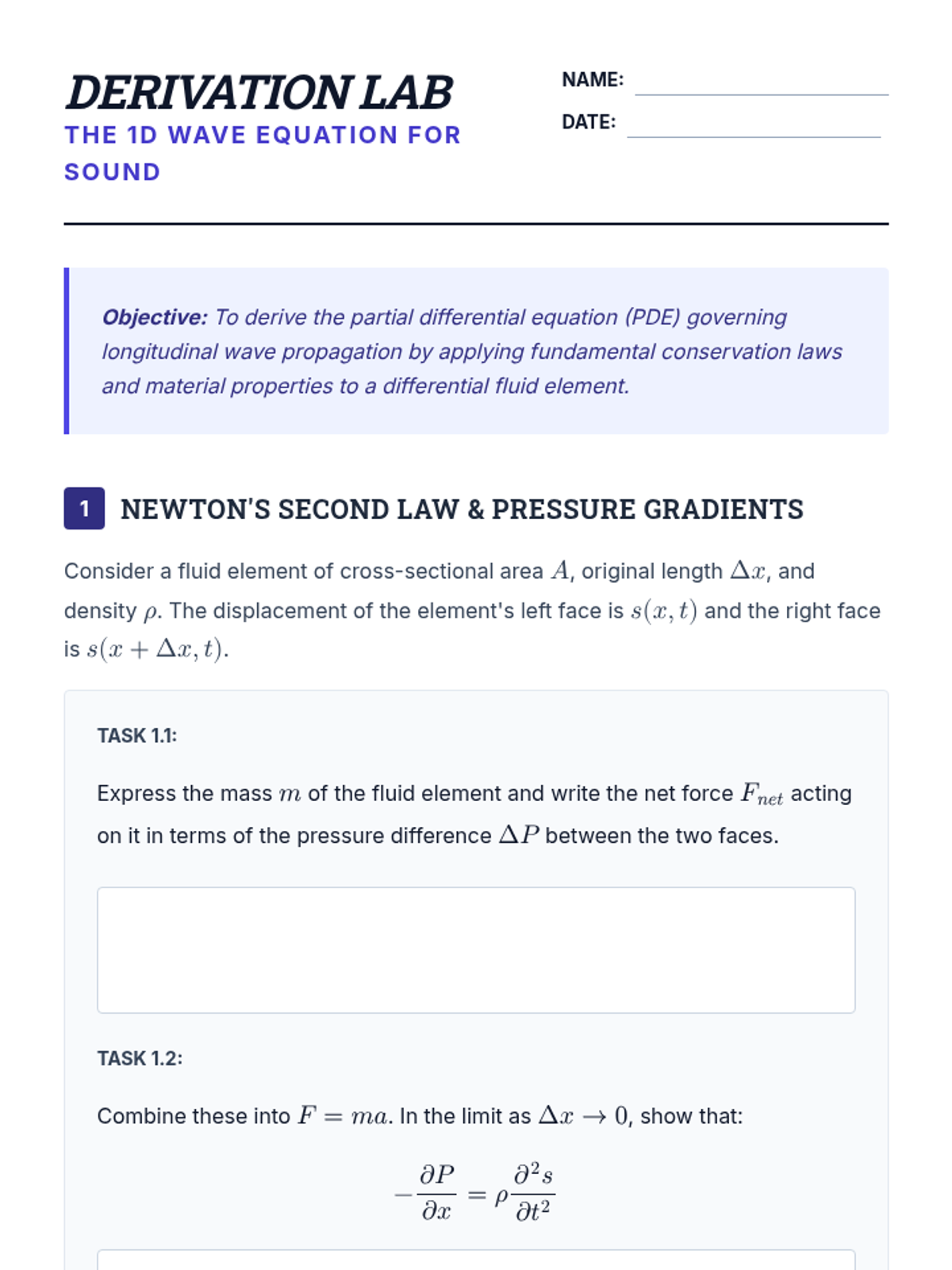 This rigorous undergraduate-level sequence explores the classical mechanics and differential equations governing longitudinal waves. Students will derive the wave equation, analyze phase relationships between pressure and displacement, and mathematically model energy transport and interference in acoustic systems.