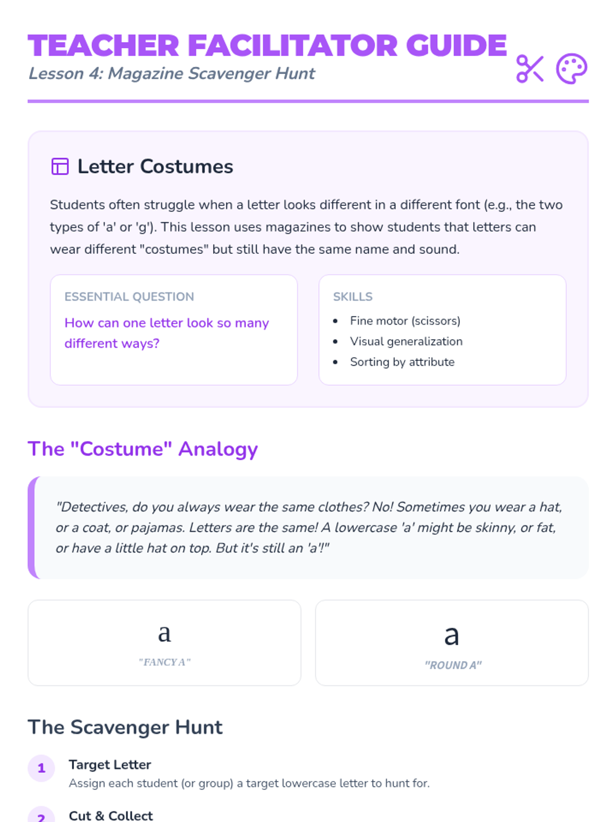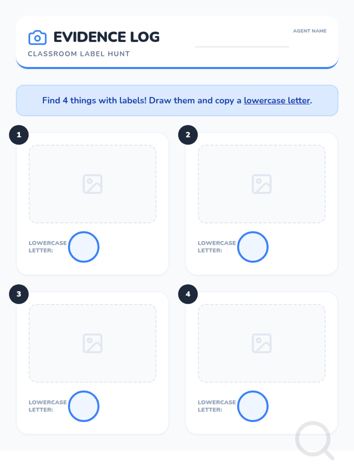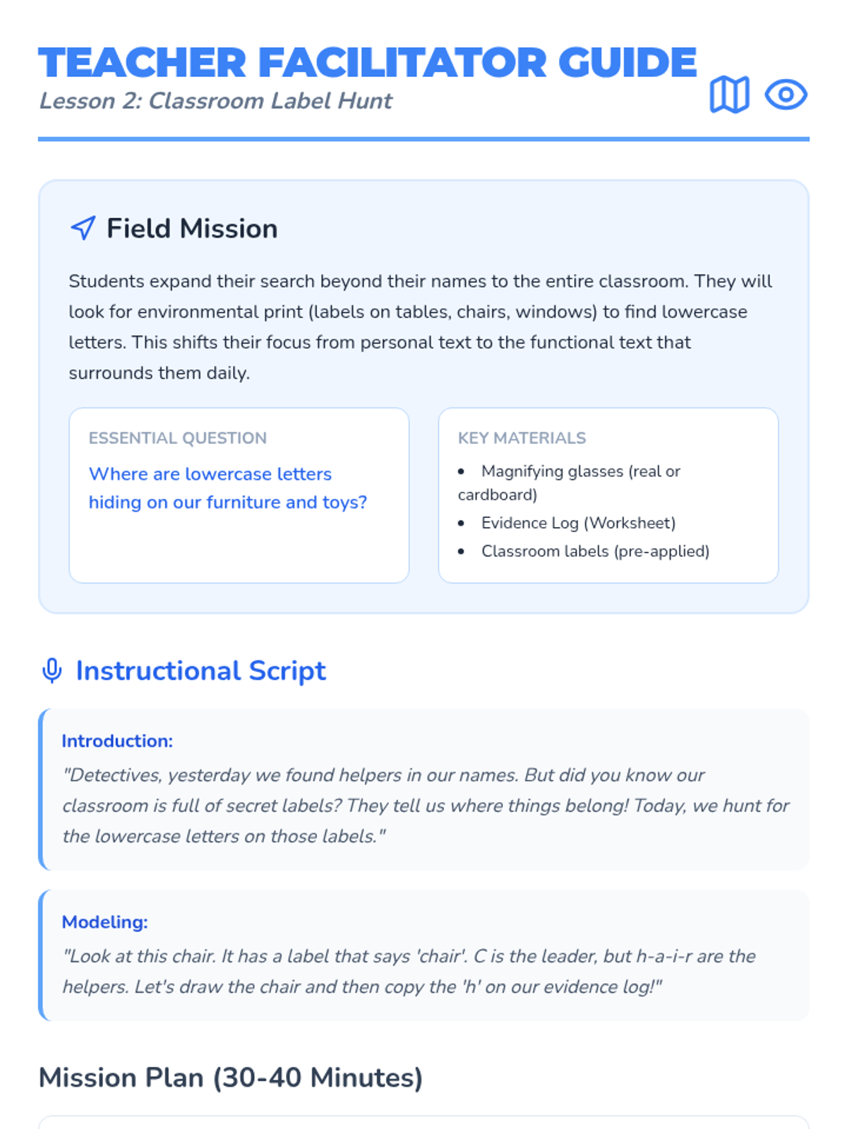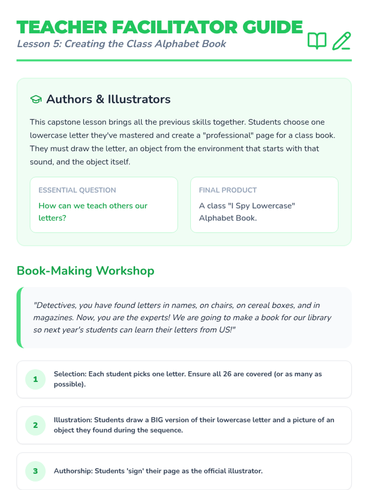 A project-based sequence for Pre-K students to identify lowercase letters in their daily environment, moving from their own names to classroom labels and community signs. Students transition from abstract symbol learning to concrete application, culminating in a class 'I Spy' book.