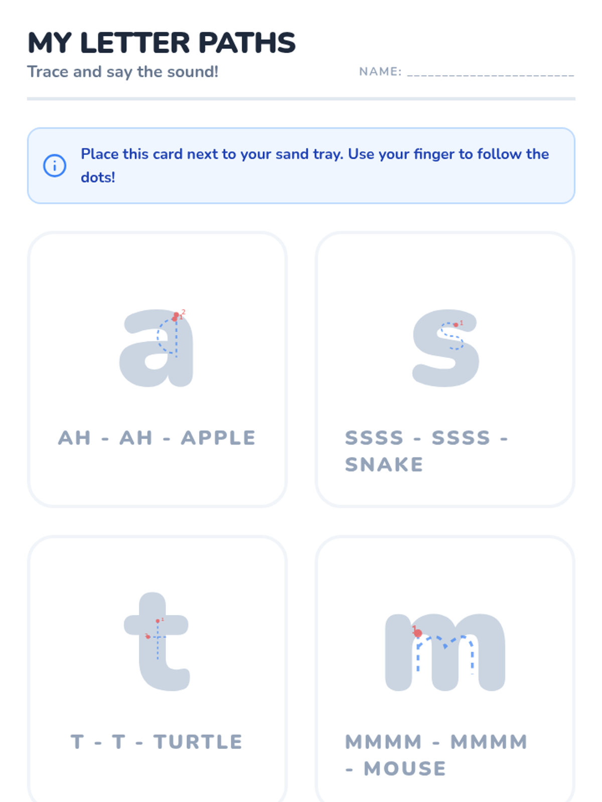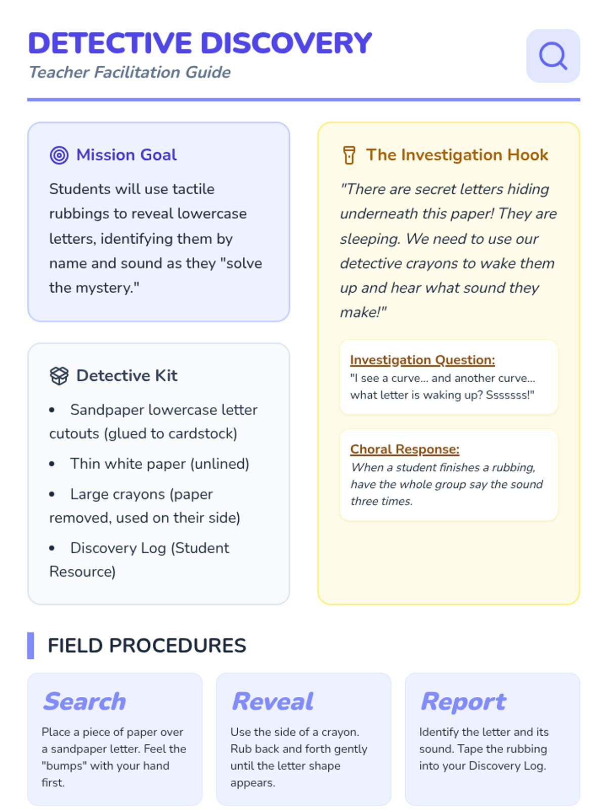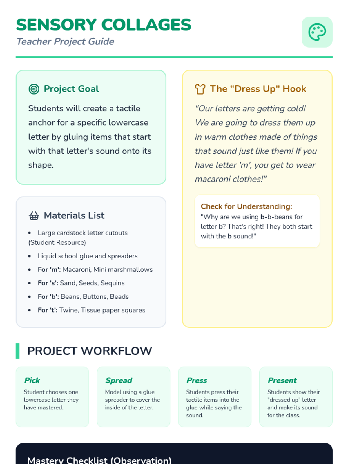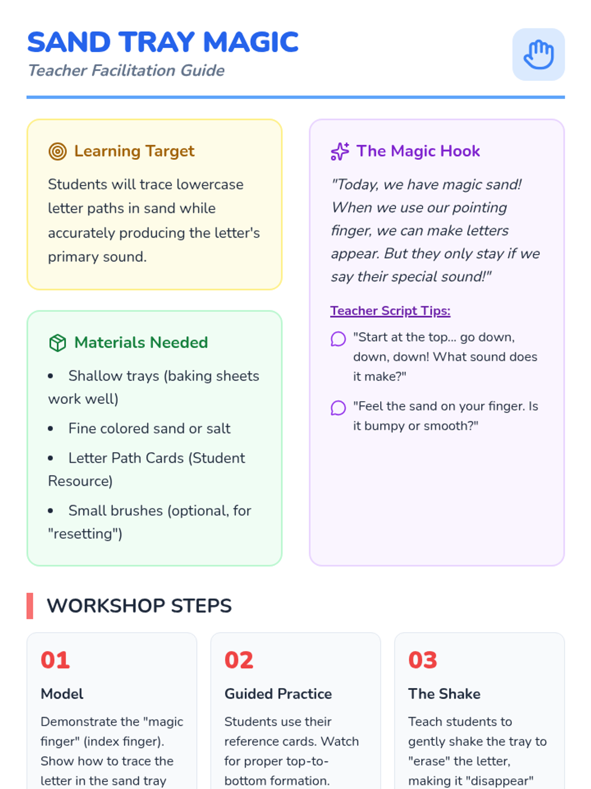 A multisensory workshop sequence for Pre-K students to master lowercase letter forms and sounds through tactile exploration, gross-motor movement, and artistic expression. Students engage with sand, playdough, and textured rubbings to solidify sound-symbol associations.
