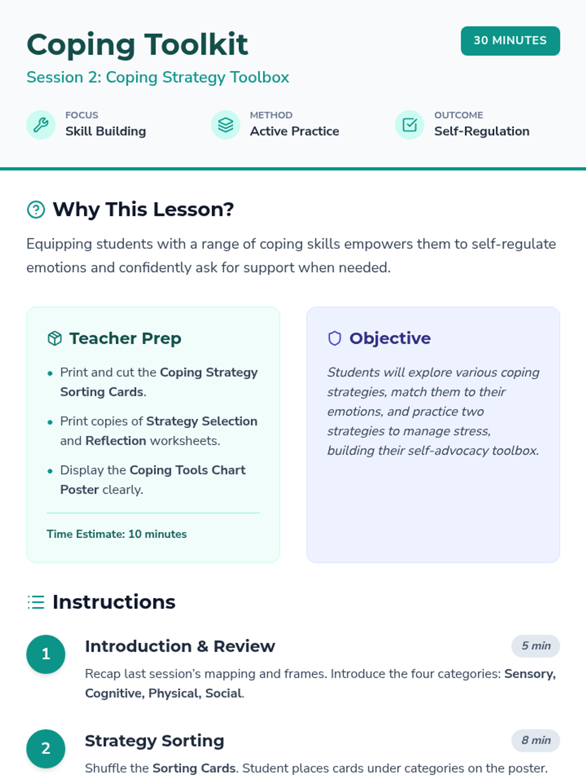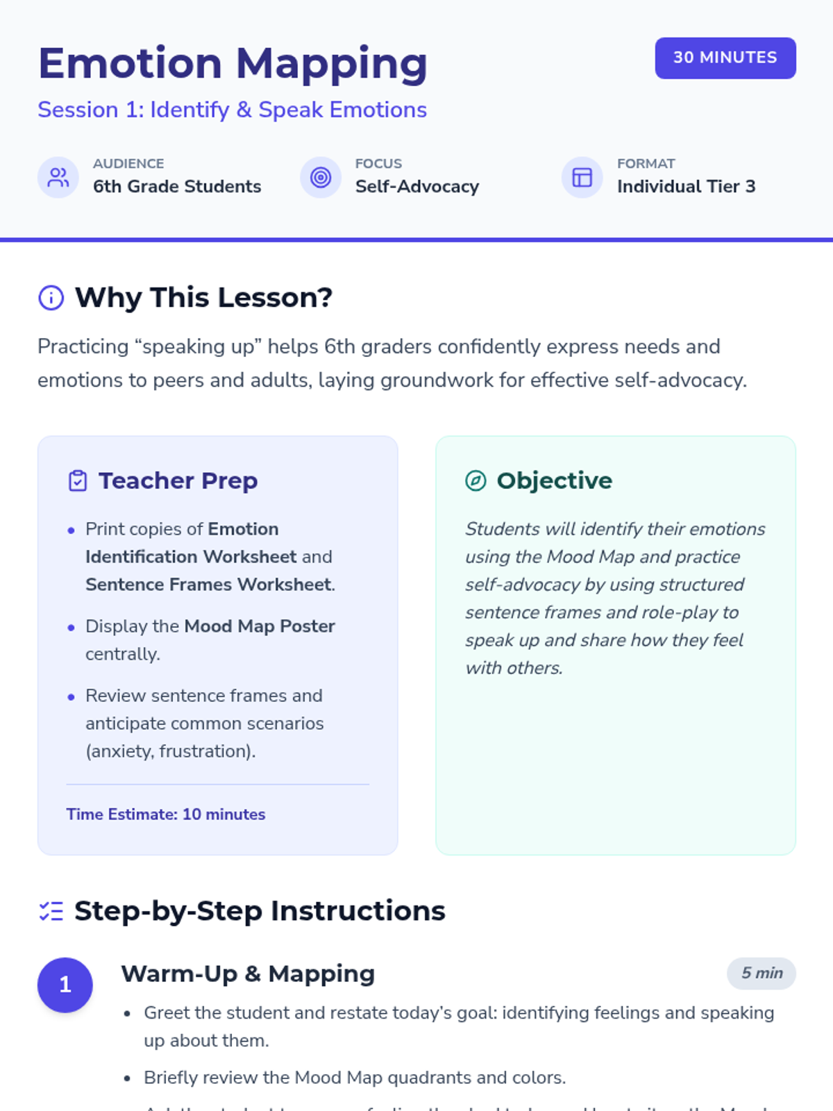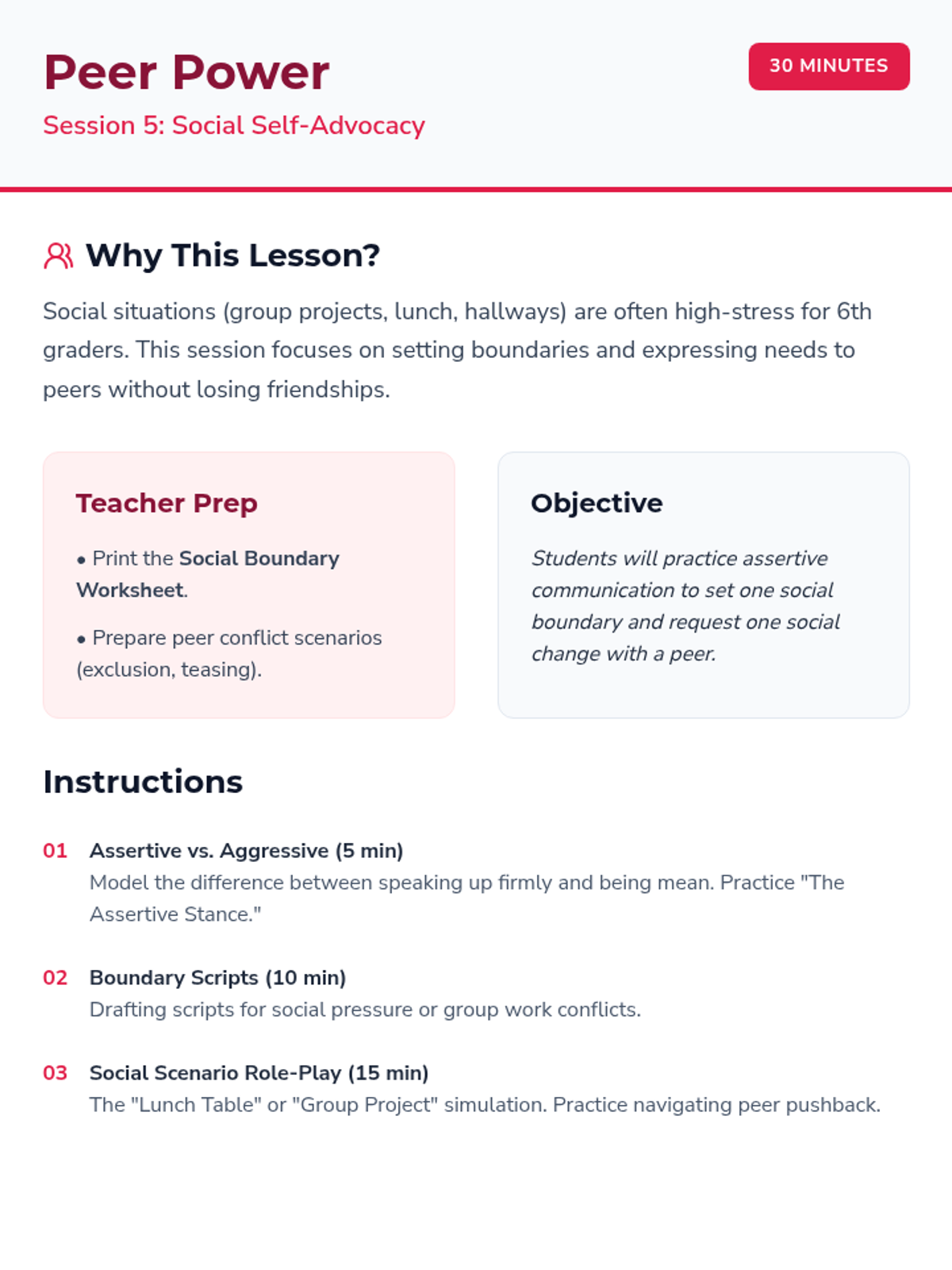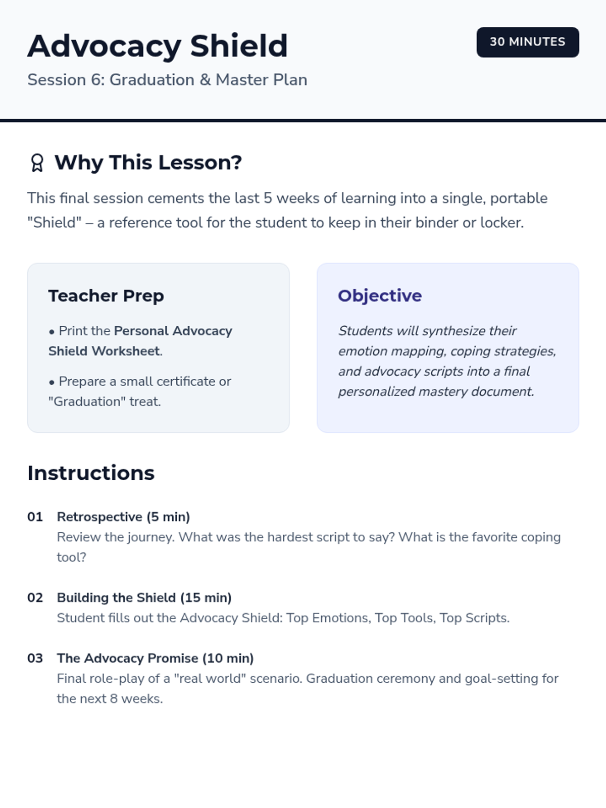 A comprehensive 6-session social work intervention series designed to help 6th-grade students build self-advocacy skills, identify emotions, and apply effective coping strategies.
