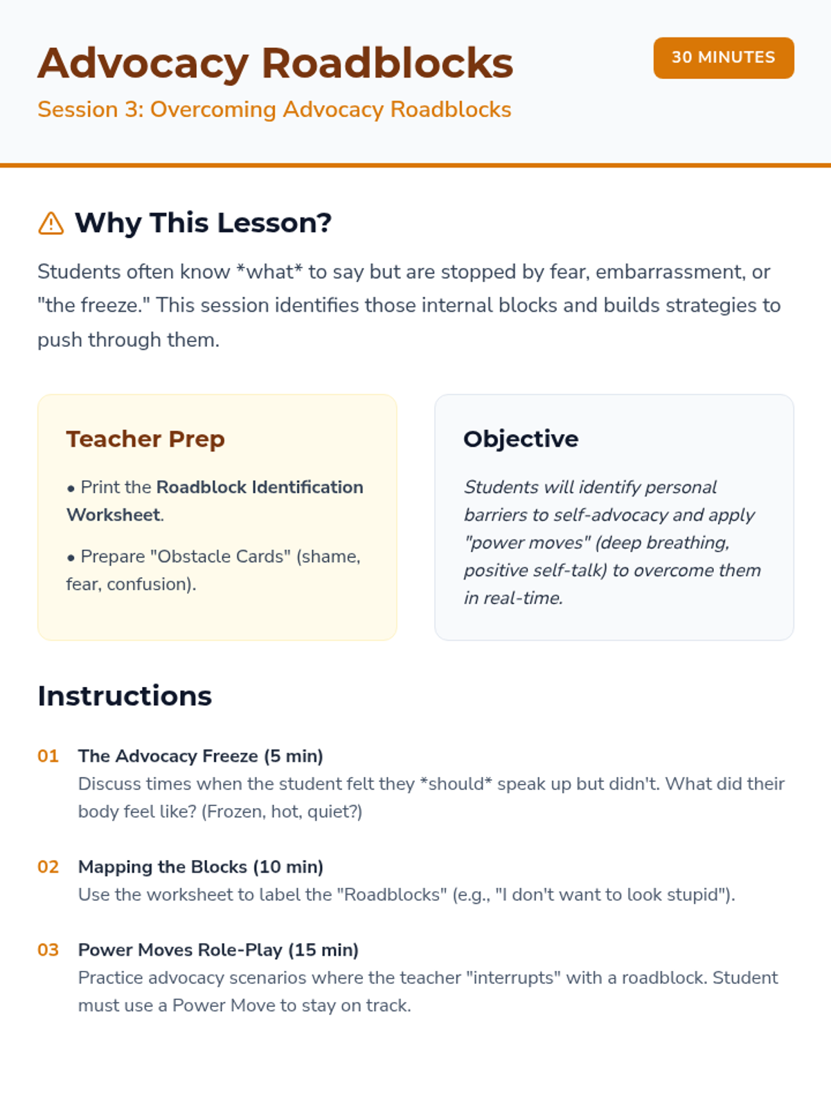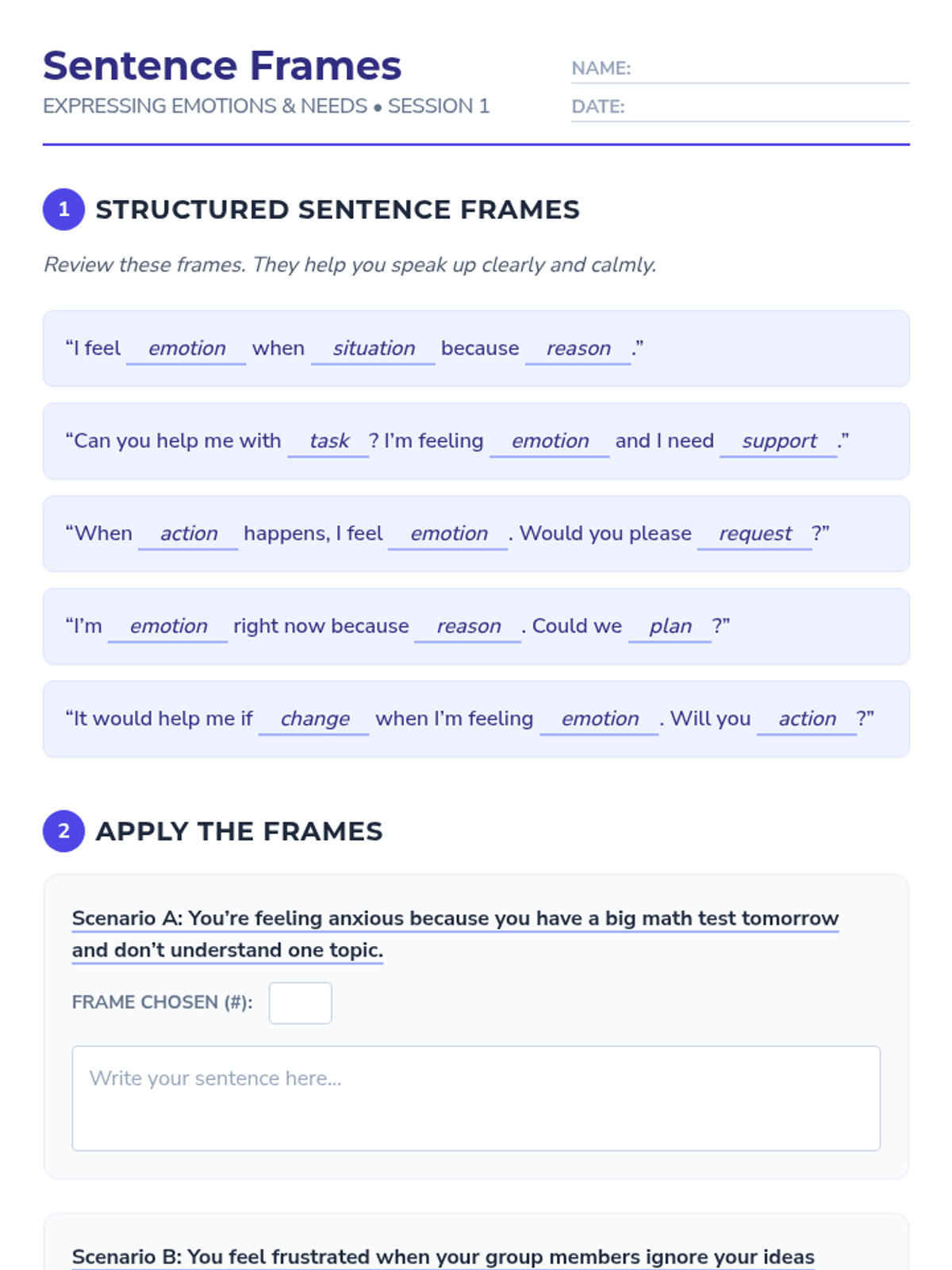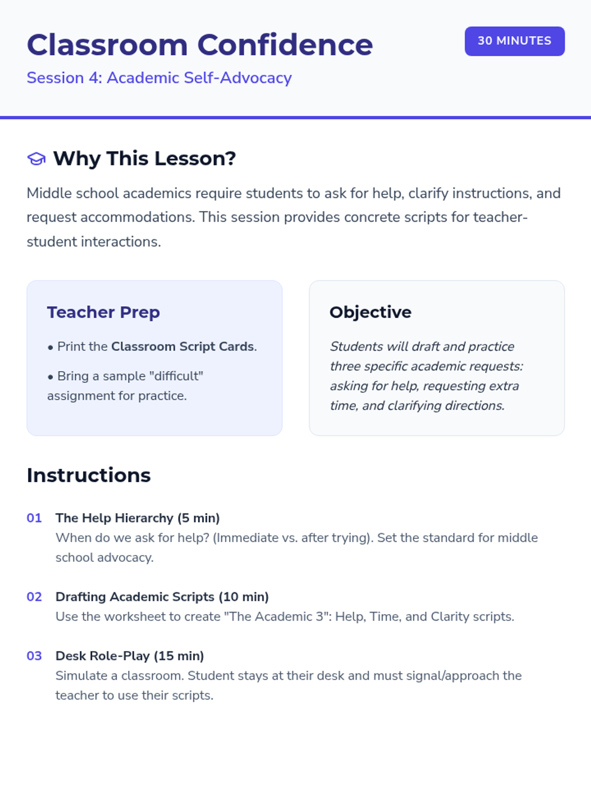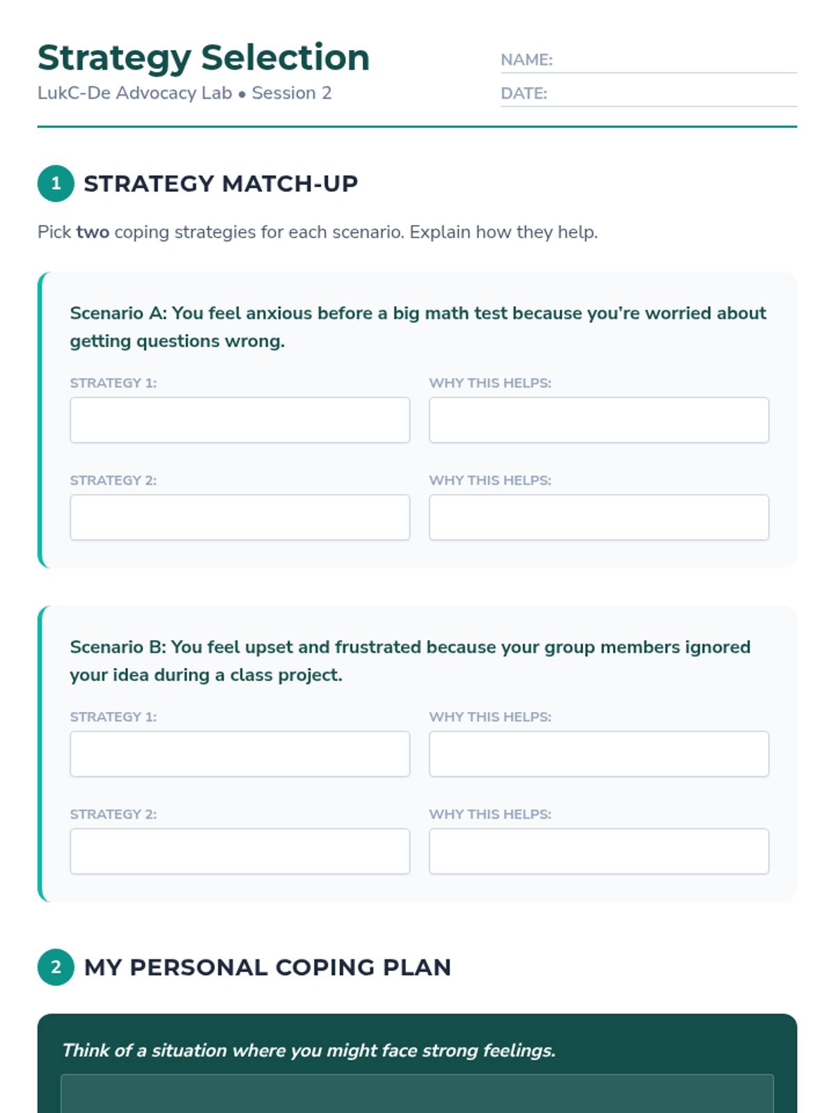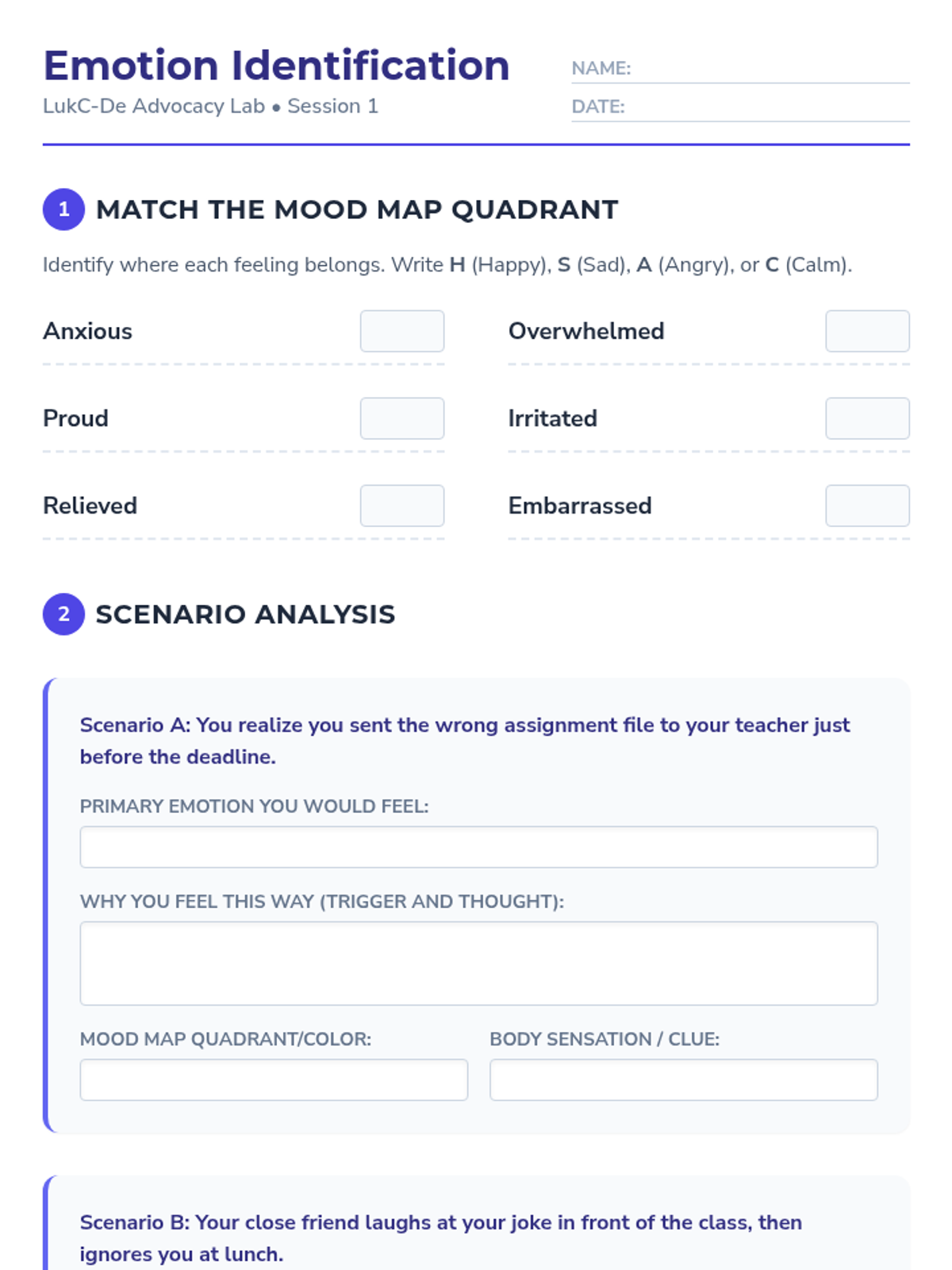 A comprehensive 6-session social work intervention series designed to help 6th-grade students build self-advocacy skills, identify emotions, and apply effective coping strategies.