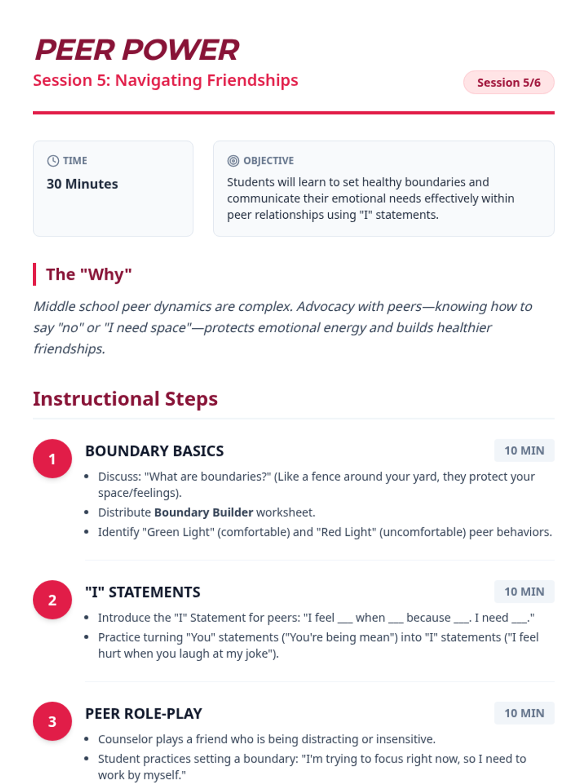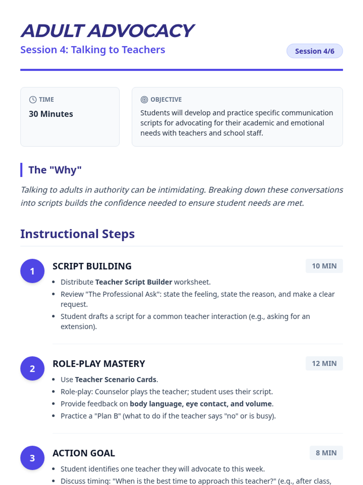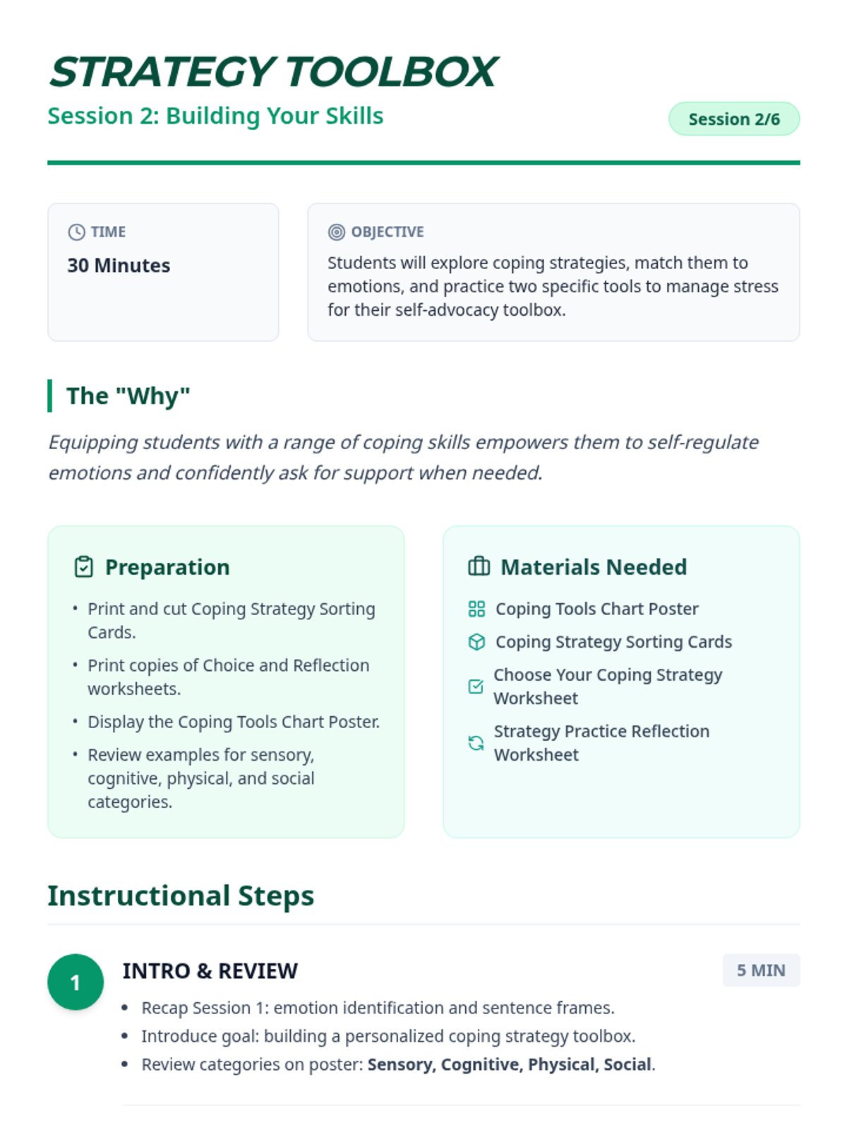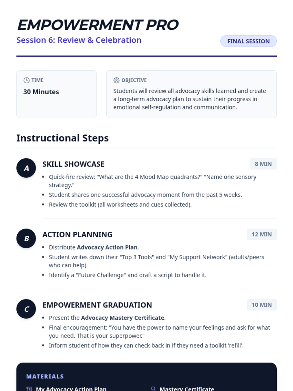 A comprehensive 6-session sequence for 6th-grade students to develop self-advocacy, emotional identification, and coping strategies within an individual social work setting. Each 30-minute session builds confidence through structured practice, role-play, and personalized toolkits.