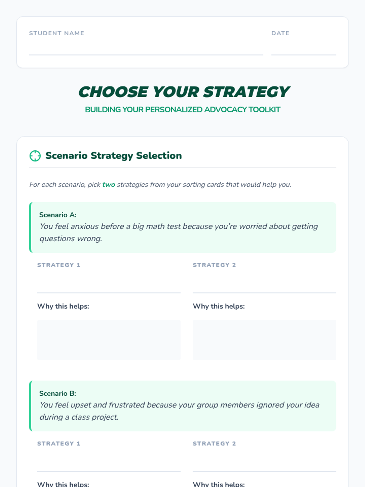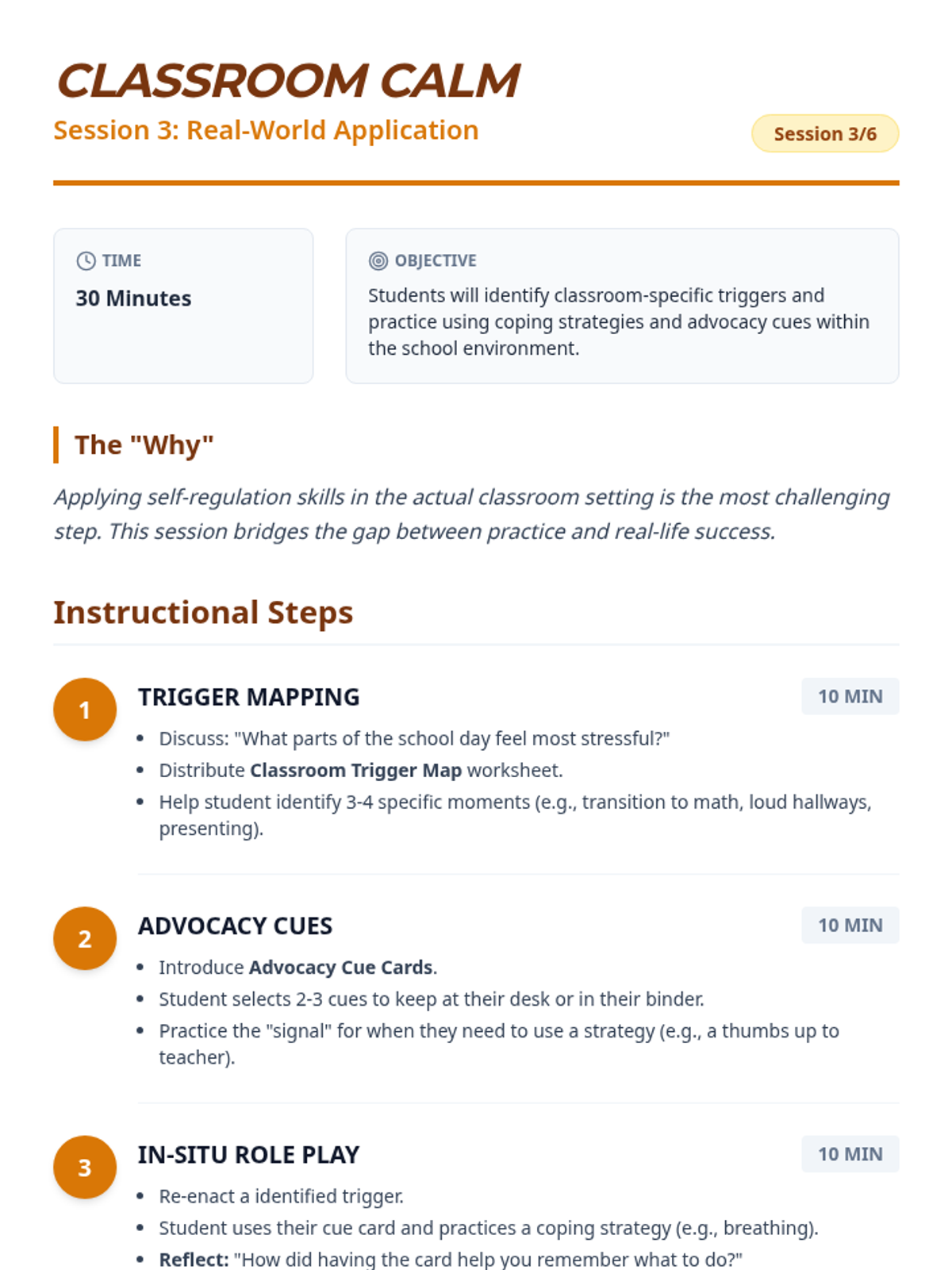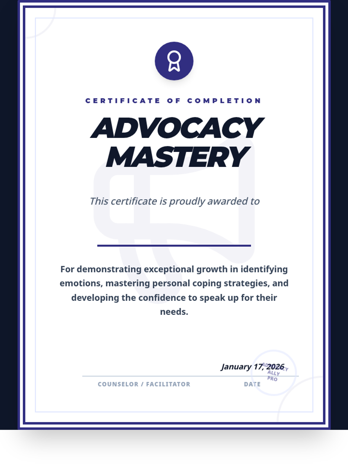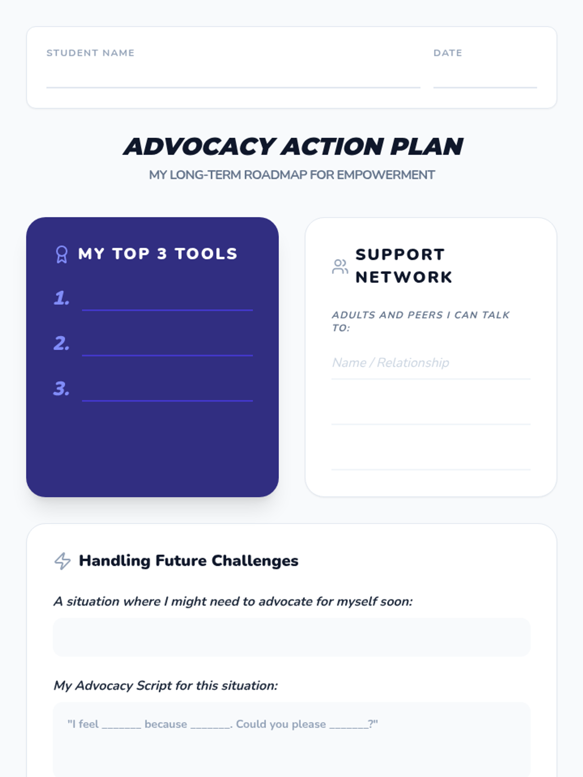 A comprehensive 6-session sequence for 6th-grade students to develop self-advocacy, emotional identification, and coping strategies within an individual social work setting. Each 30-minute session builds confidence through structured practice, role-play, and personalized toolkits.