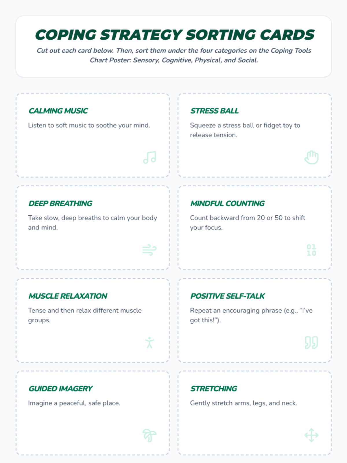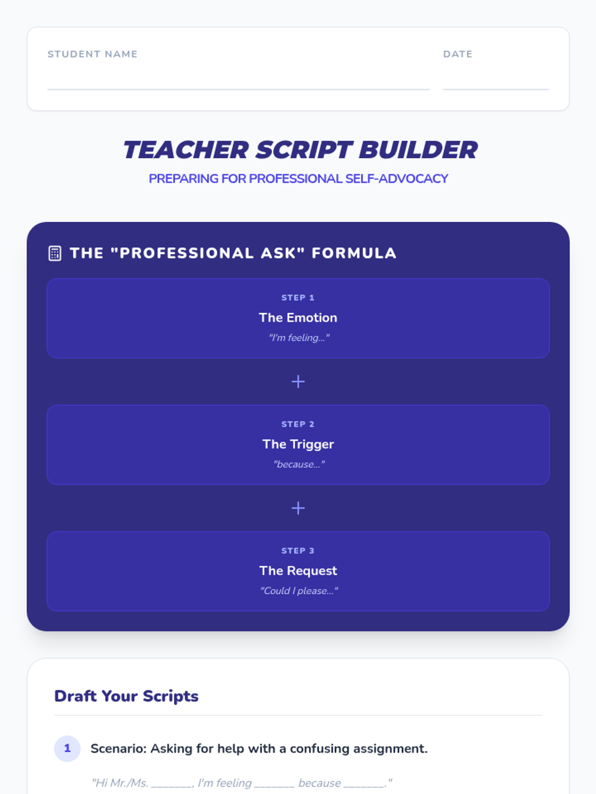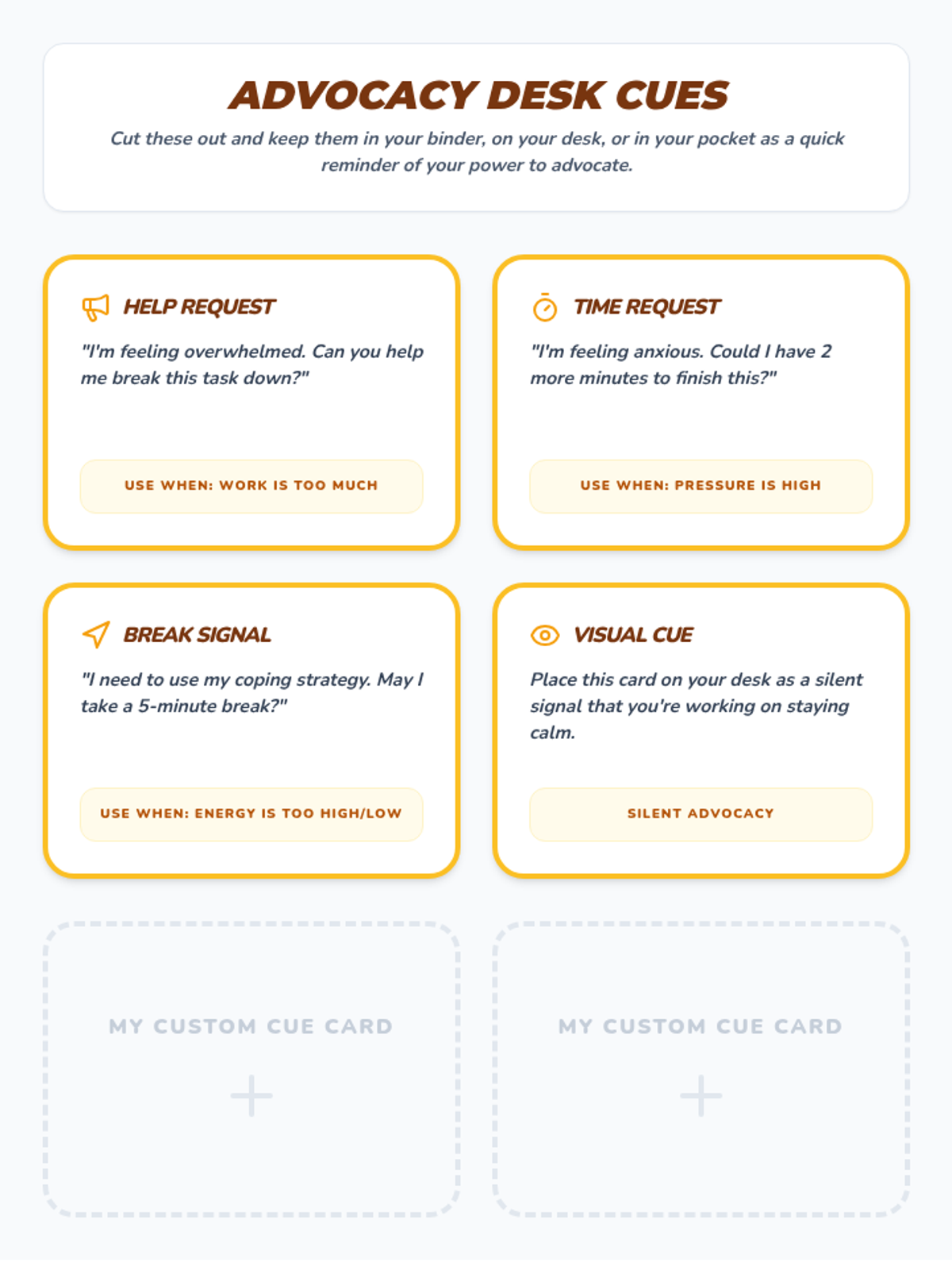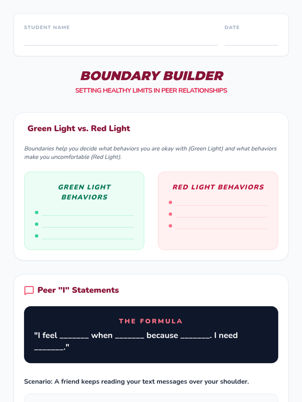 A comprehensive 6-session sequence for 6th-grade students to develop self-advocacy, emotional identification, and coping strategies within an individual social work setting. Each 30-minute session builds confidence through structured practice, role-play, and personalized toolkits.