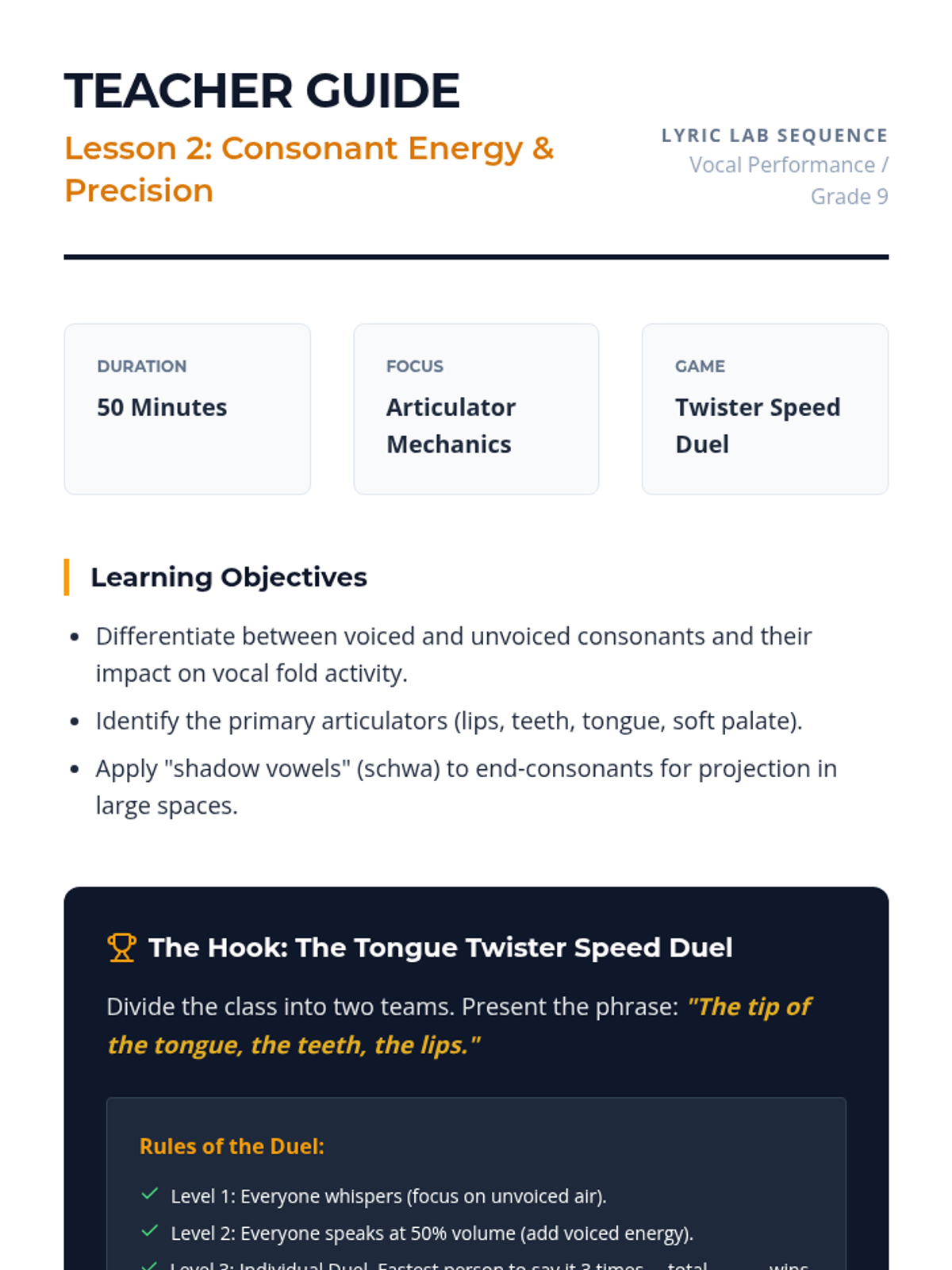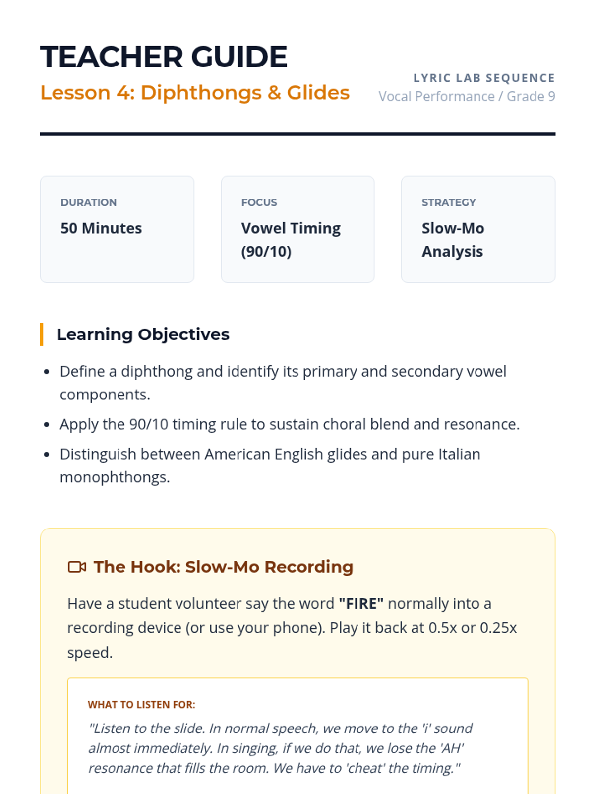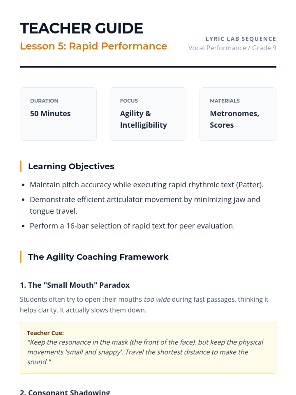 A comprehensive unit for high school vocalists on the mechanics of clear diction, focusing on vowel unification, consonant precision, and the International Phonetic Alphabet (IPA). Students move from fundamental oral shaping to complex rapid text delivery.
