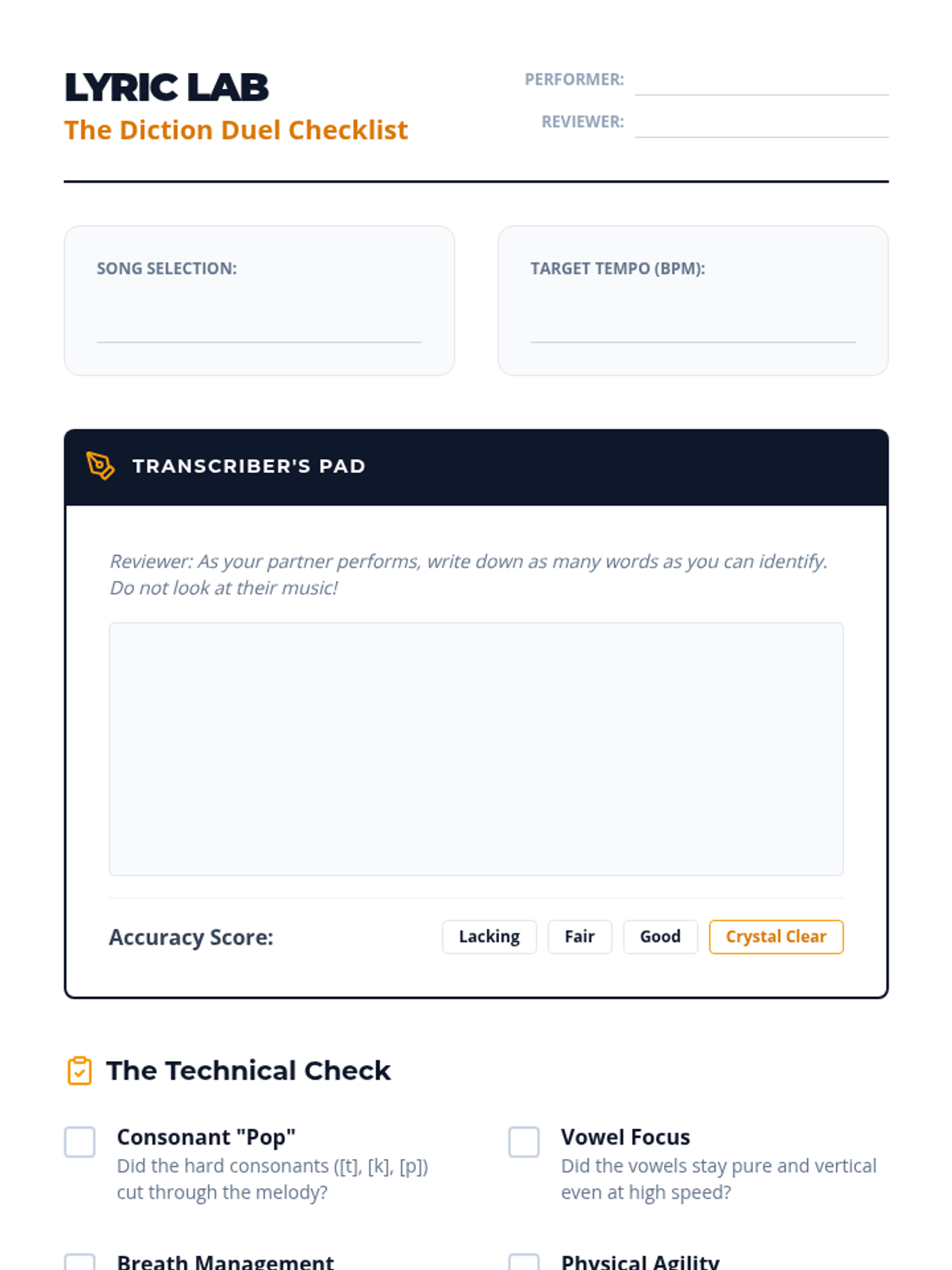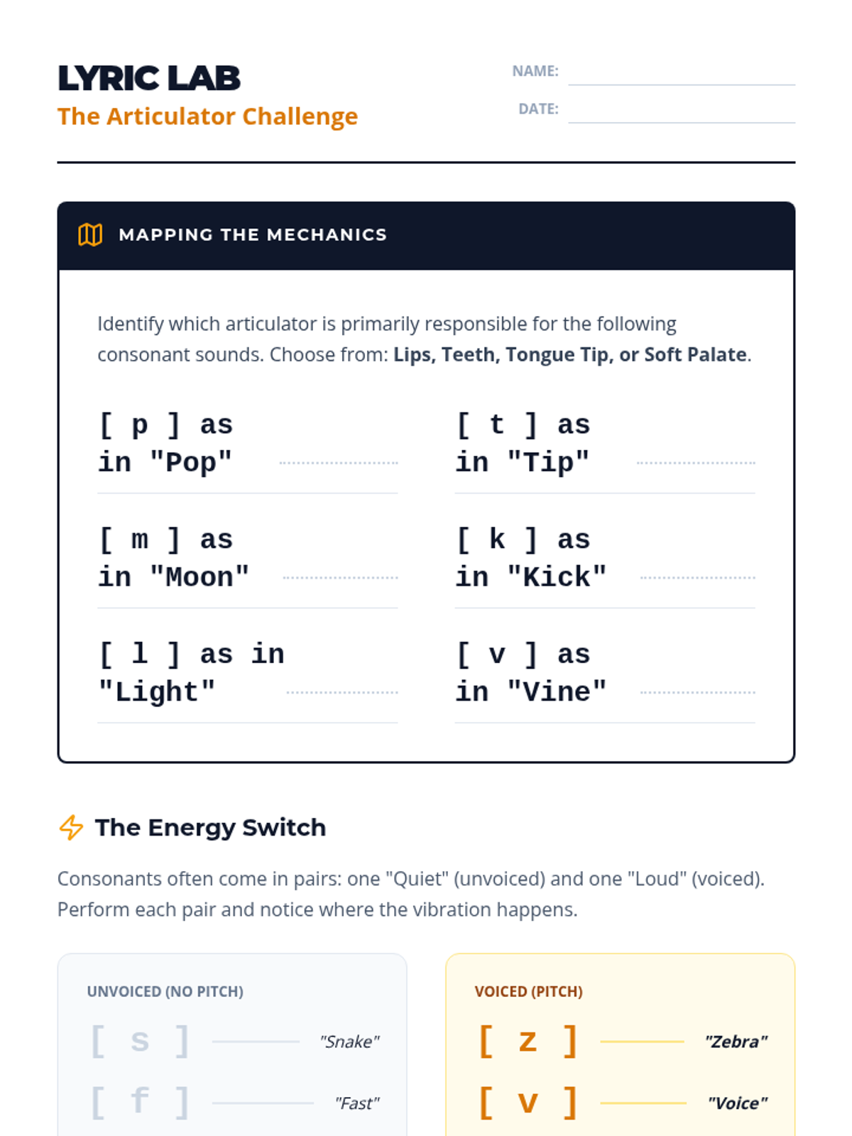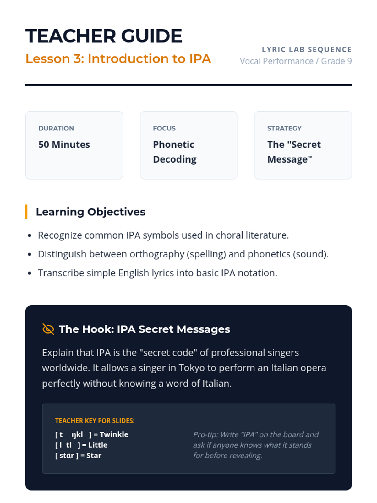 A comprehensive unit for high school vocalists on the mechanics of clear diction, focusing on vowel unification, consonant precision, and the International Phonetic Alphabet (IPA). Students move from fundamental oral shaping to complex rapid text delivery.