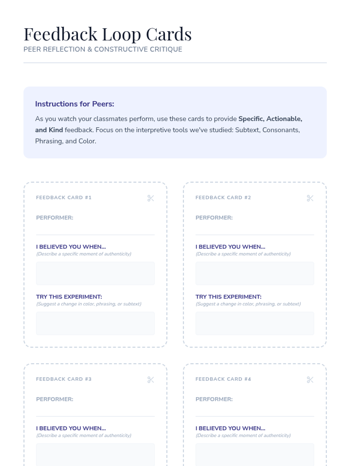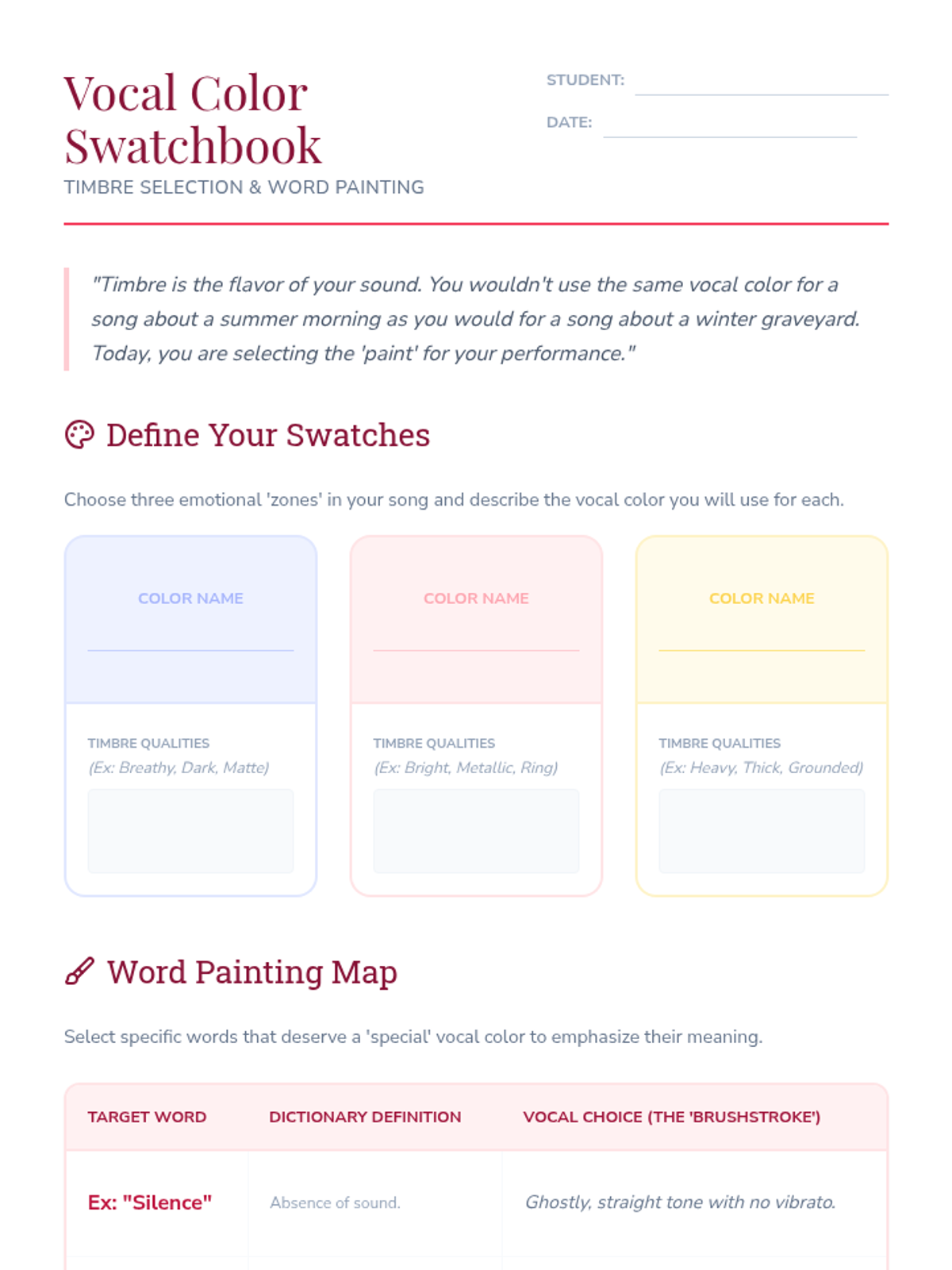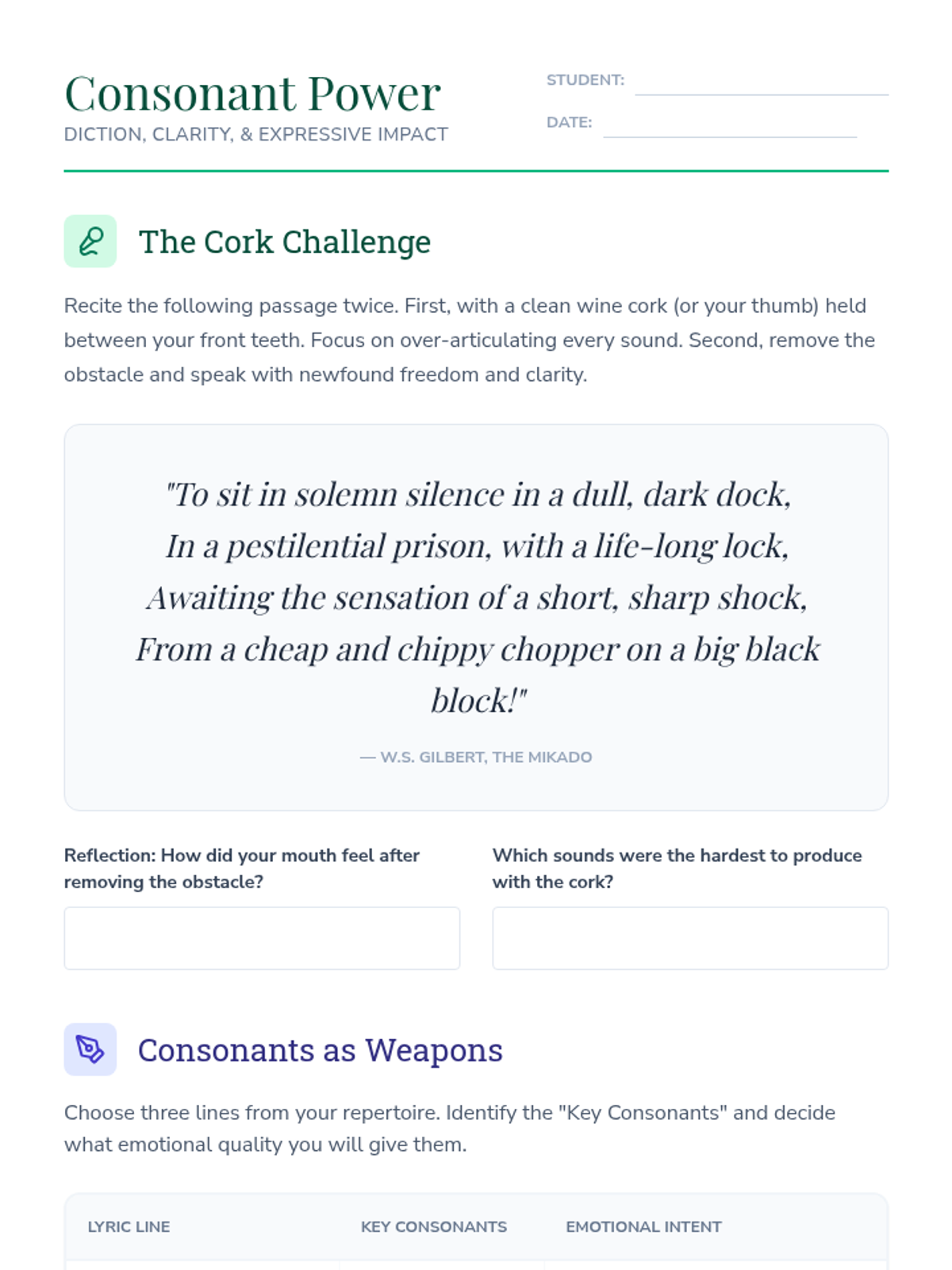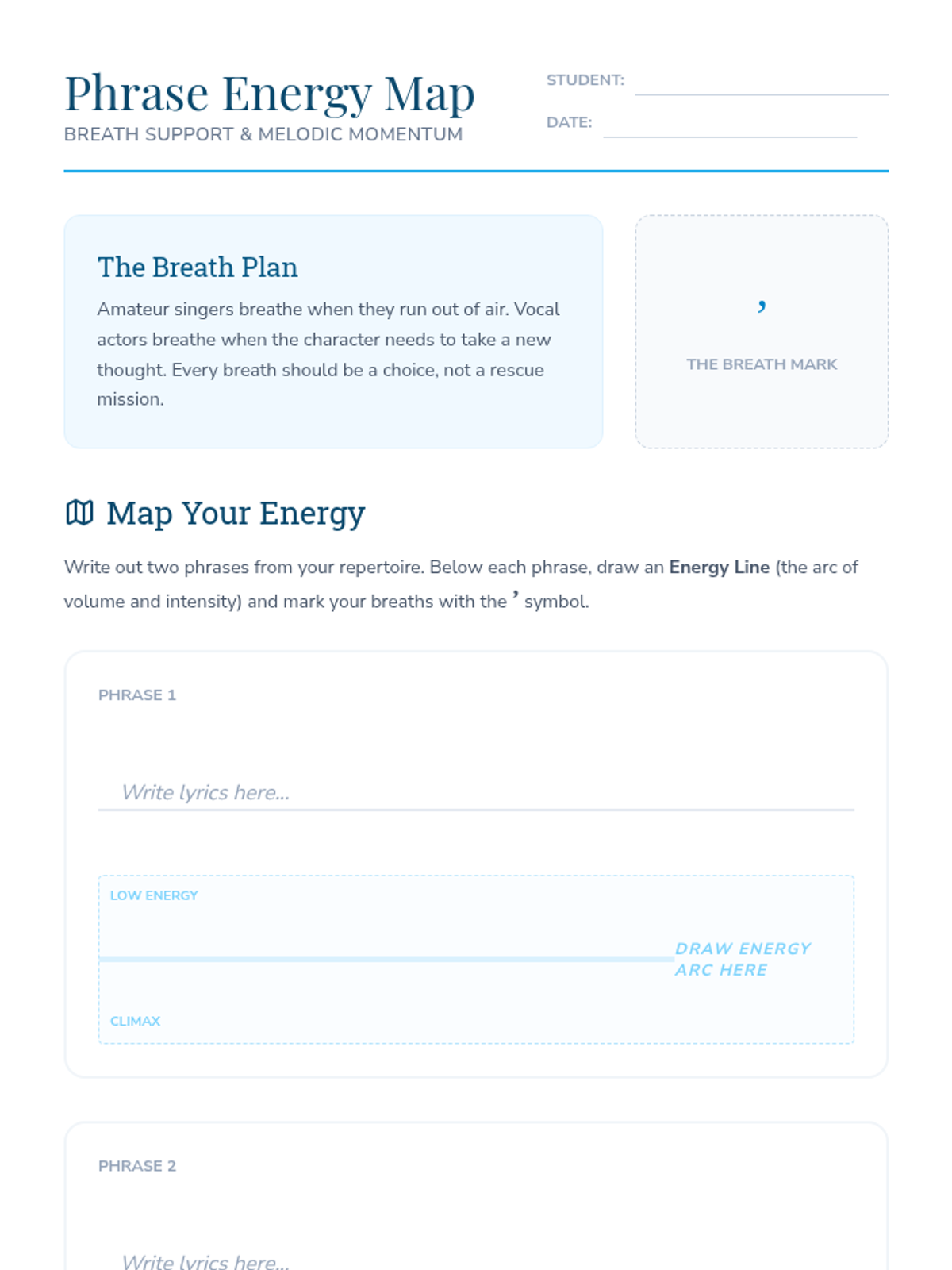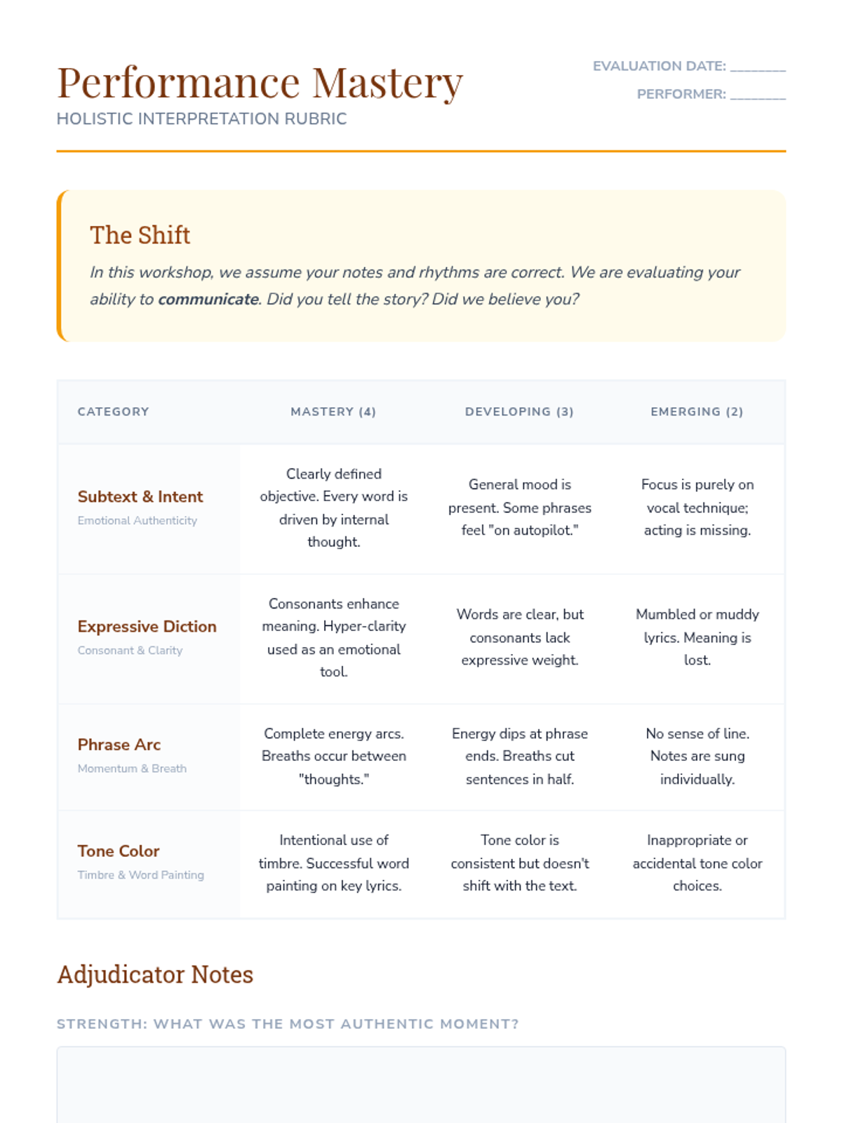 A comprehensive vocal performance sequence that teaches students to move beyond notes and rhythms to become vocal 'actors.' Students analyze subtext, master expressive diction, map musical phrasing, and explore tone color to deliver emotionally authentic performances.
