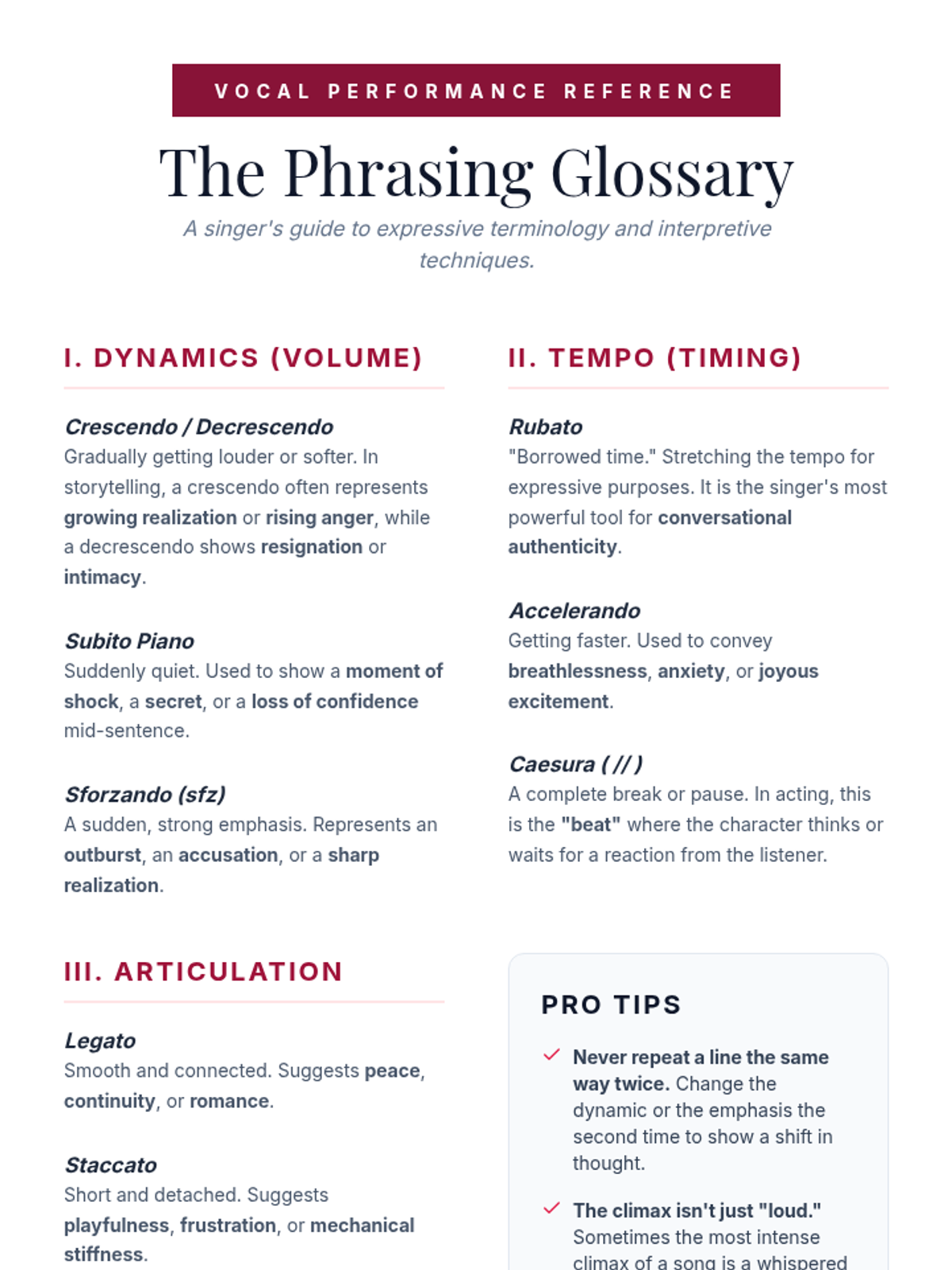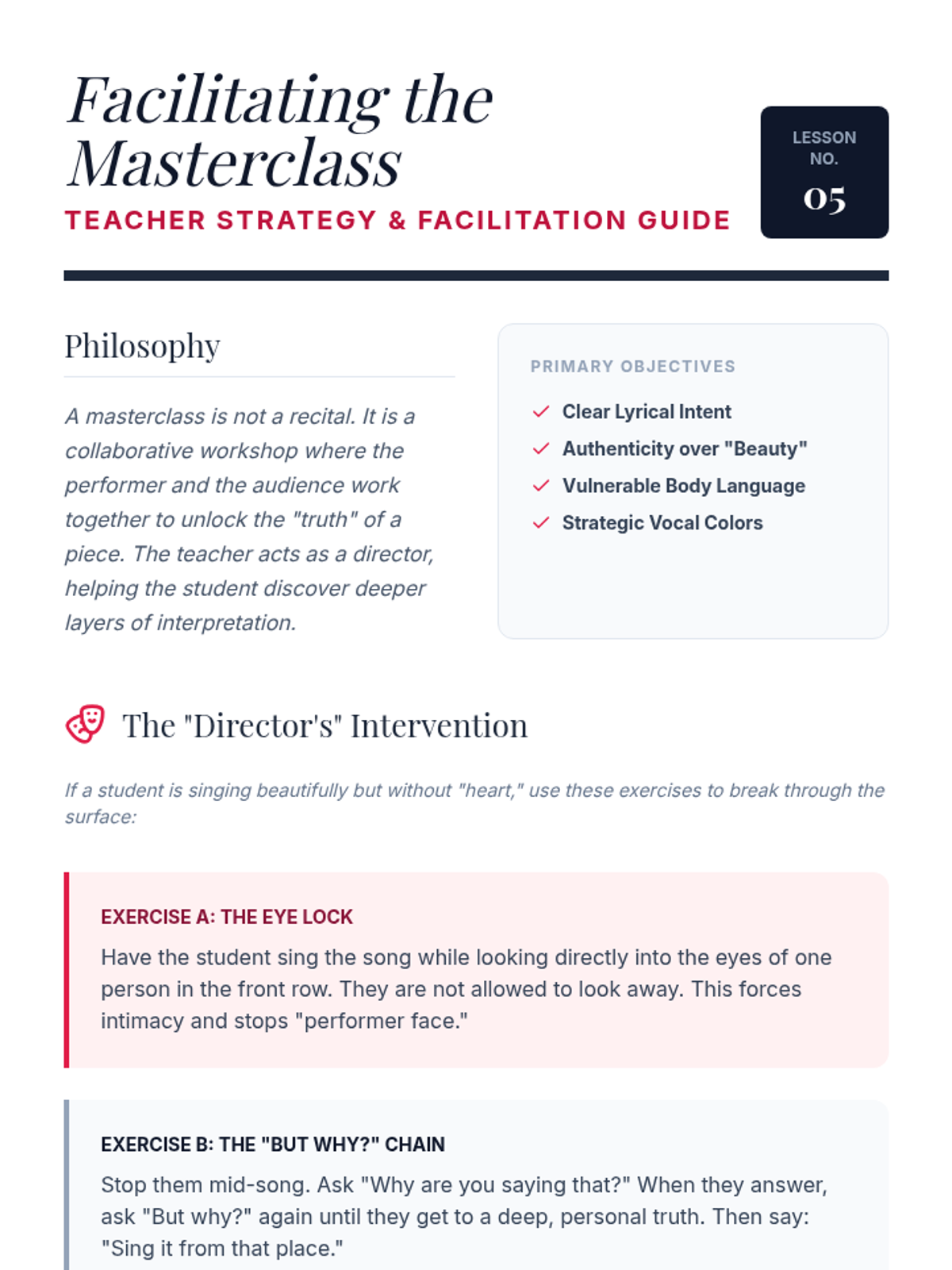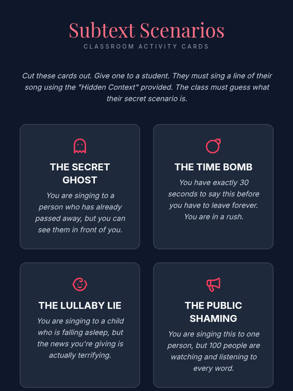 A comprehensive vocal performance sequence for 12th graders focusing on the intersection of acting and singing. Students learn to treat songs as monologues, identify subtext and objectives, map musical arcs, and use vocal timbre as an expressive tool for storytelling.