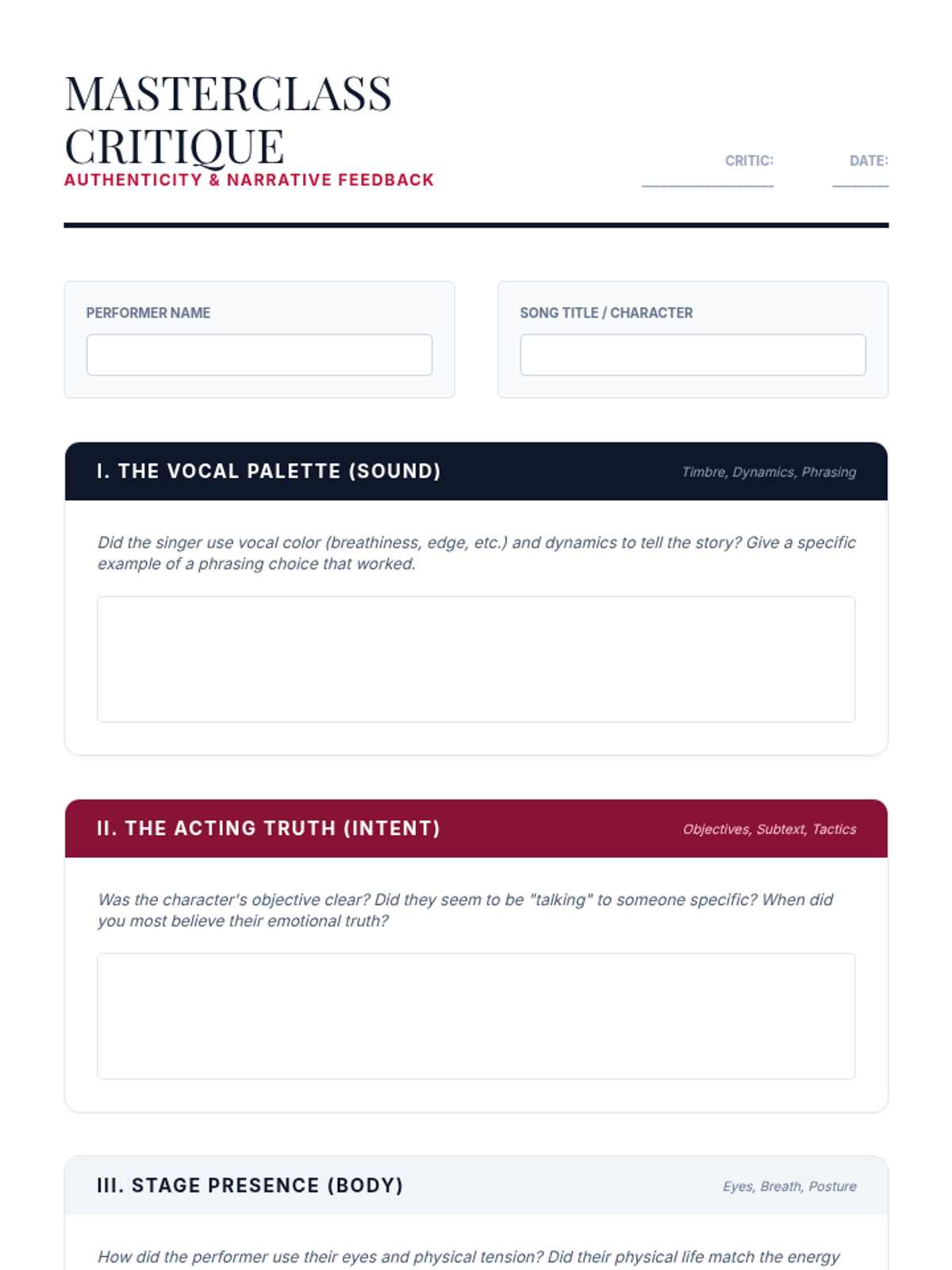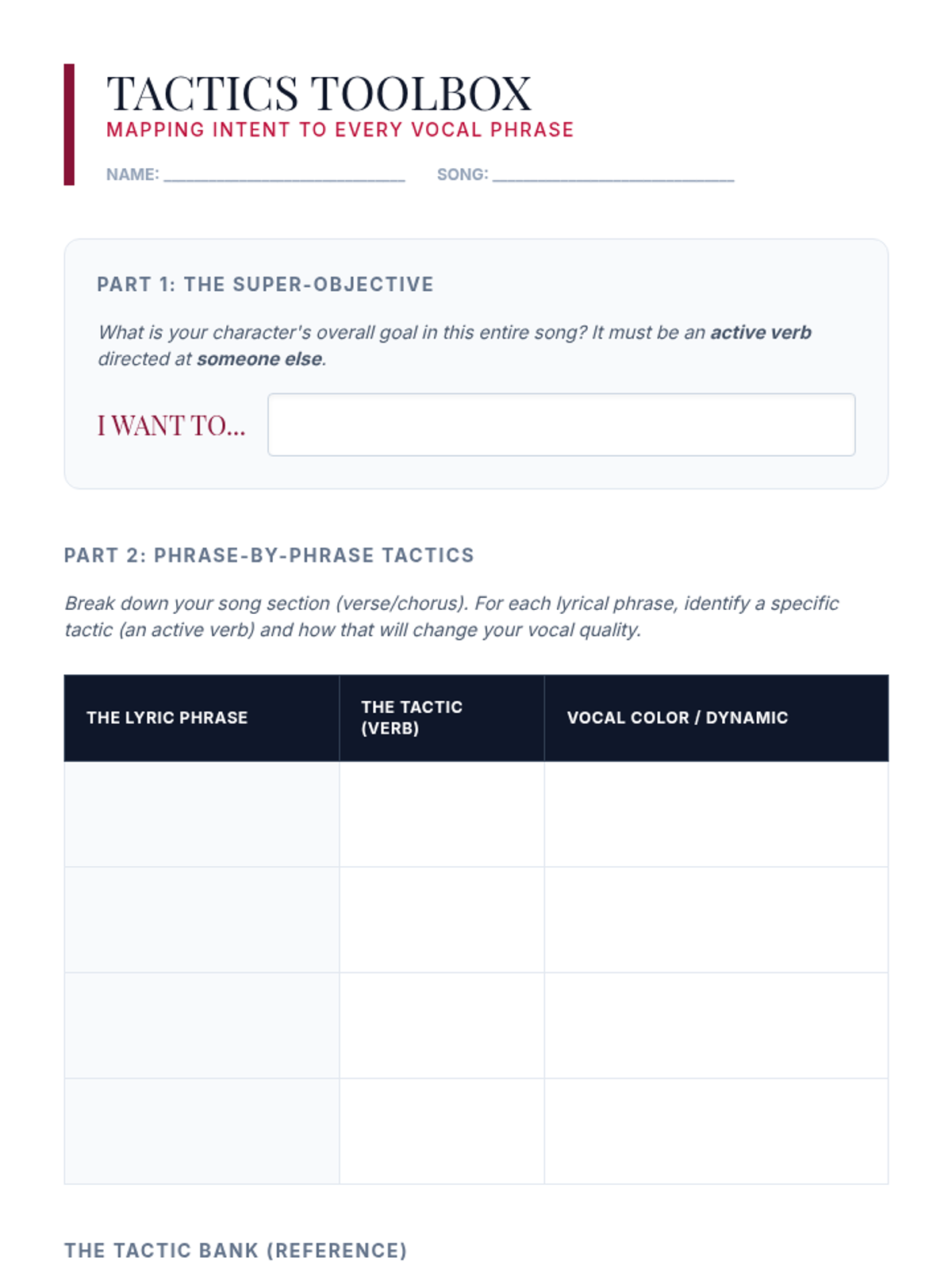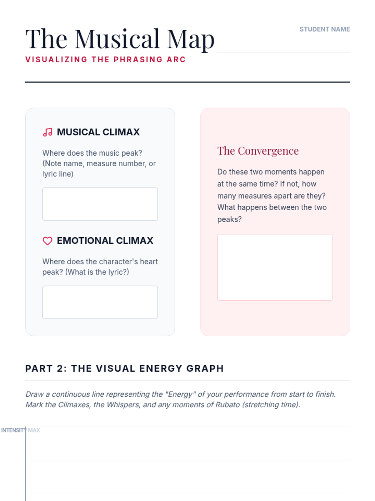 A comprehensive vocal performance sequence for 12th graders focusing on the intersection of acting and singing. Students learn to treat songs as monologues, identify subtext and objectives, map musical arcs, and use vocal timbre as an expressive tool for storytelling.