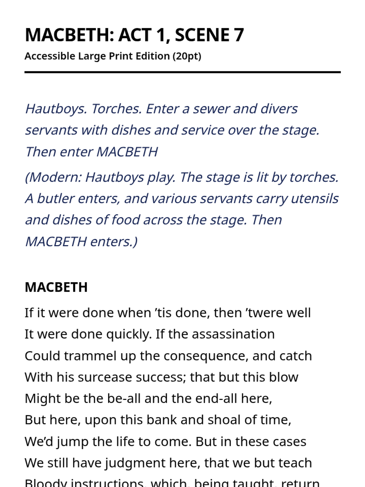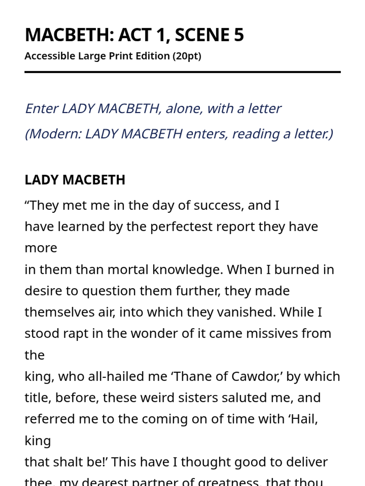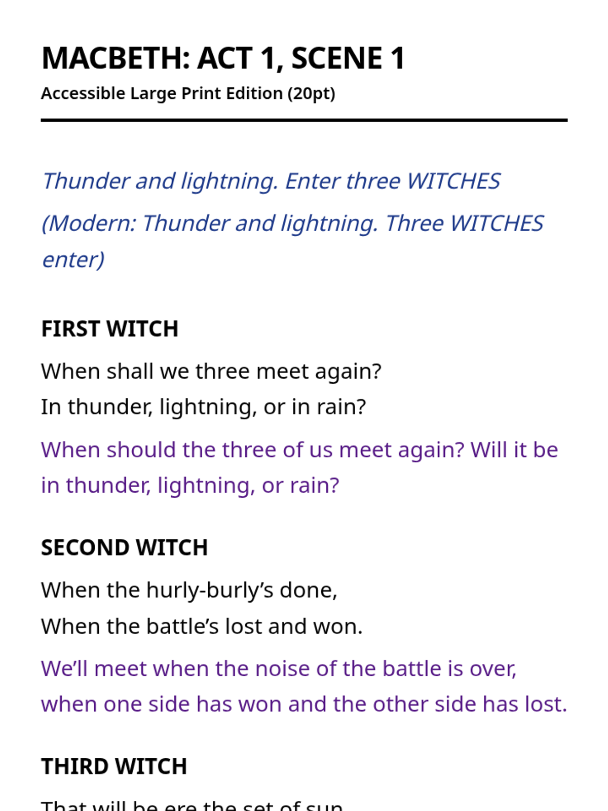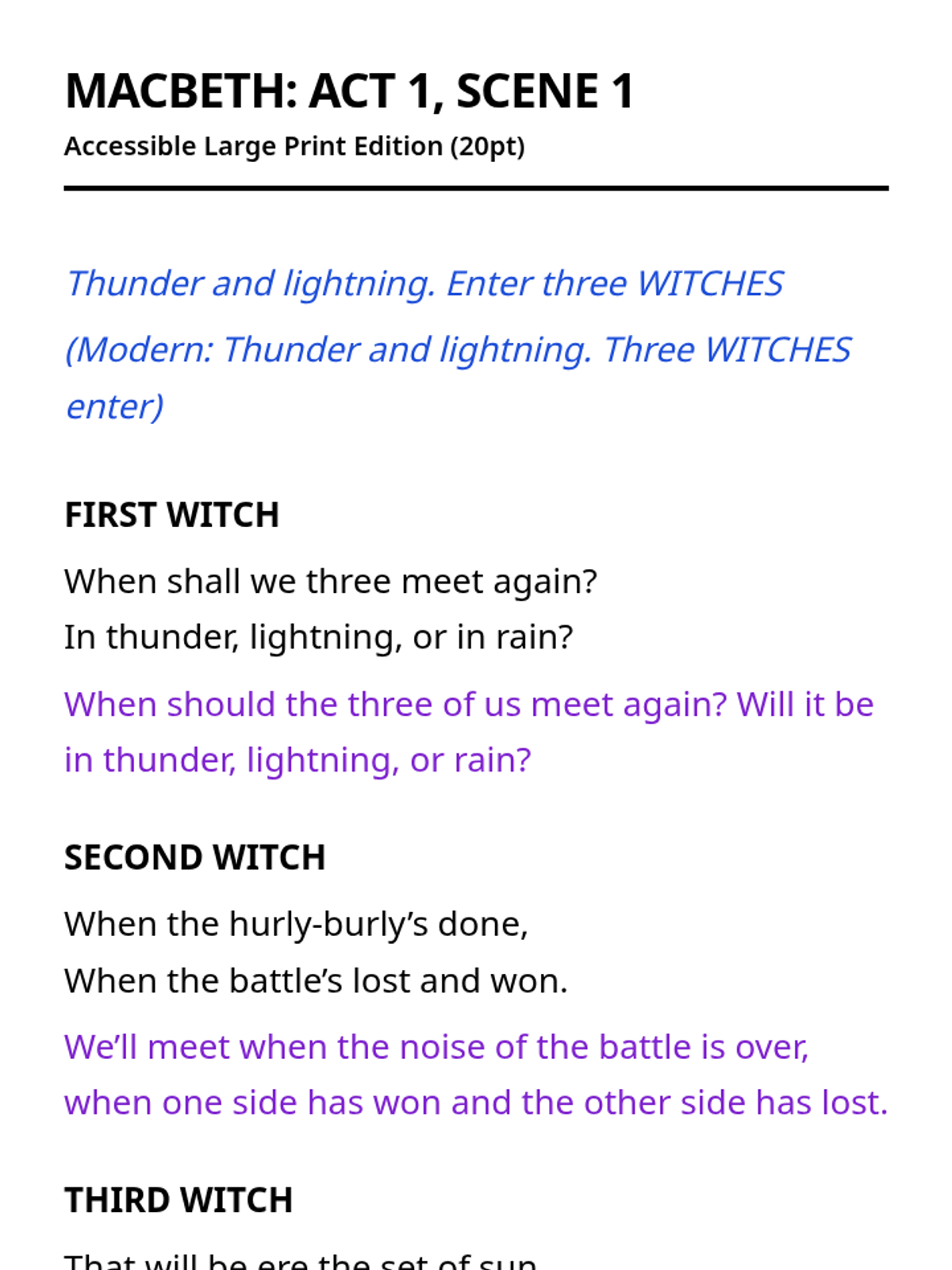 A complete large-print, accessible edition of Shakespeare's Macbeth with interleaved modern translations and high-contrast formatting for visually impaired students.