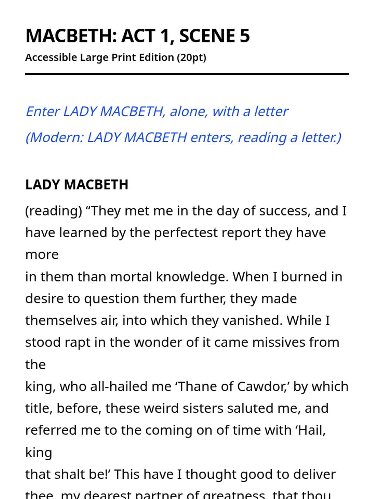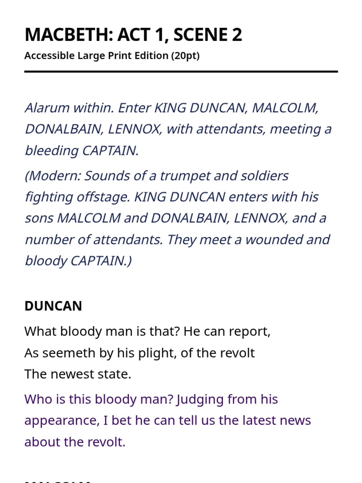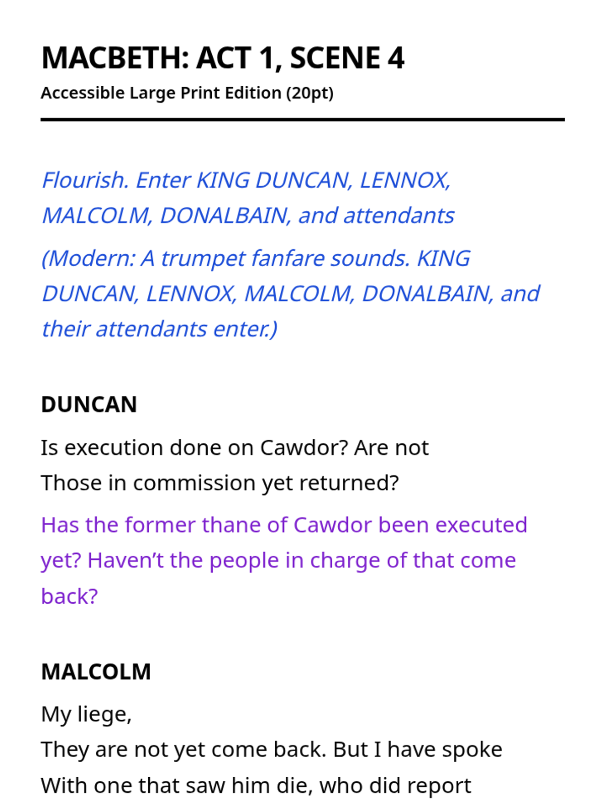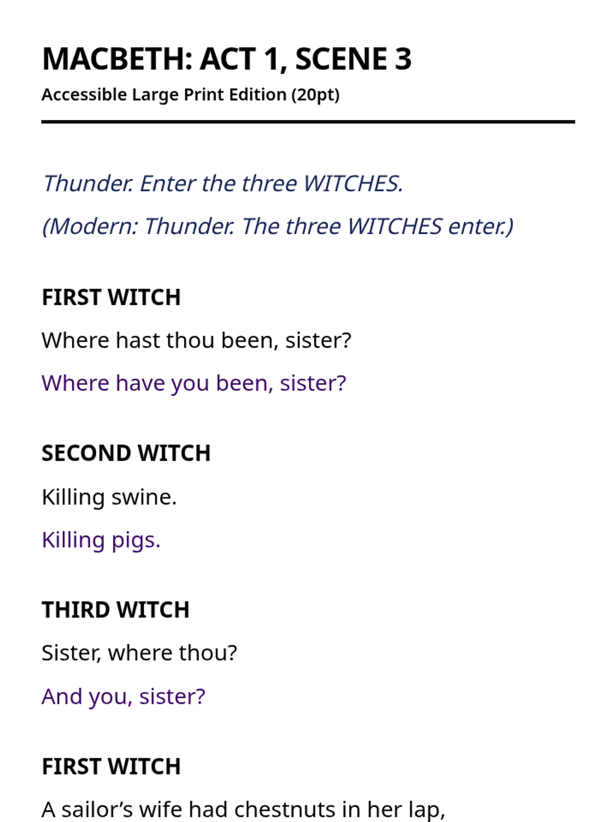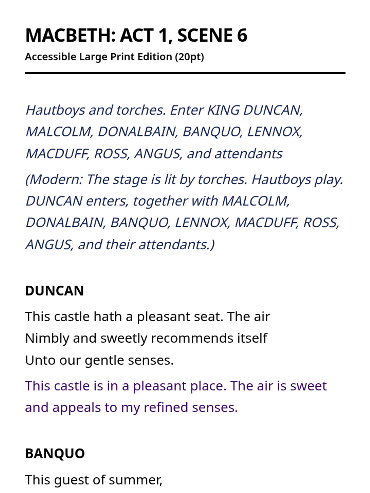 An accessible series of the complete text of Macbeth, formatted specifically for students with visual impairments using large print and color-coded translations.