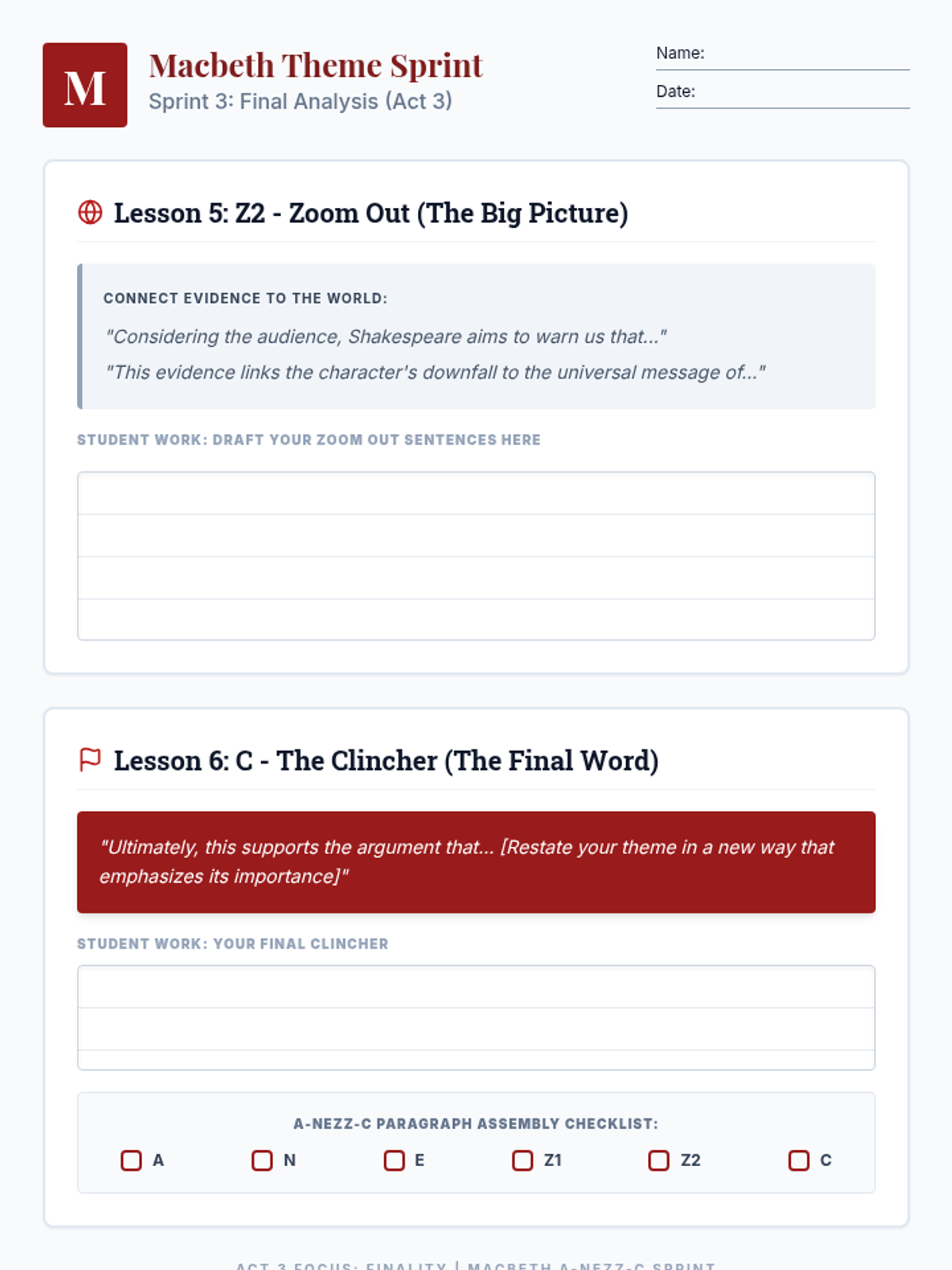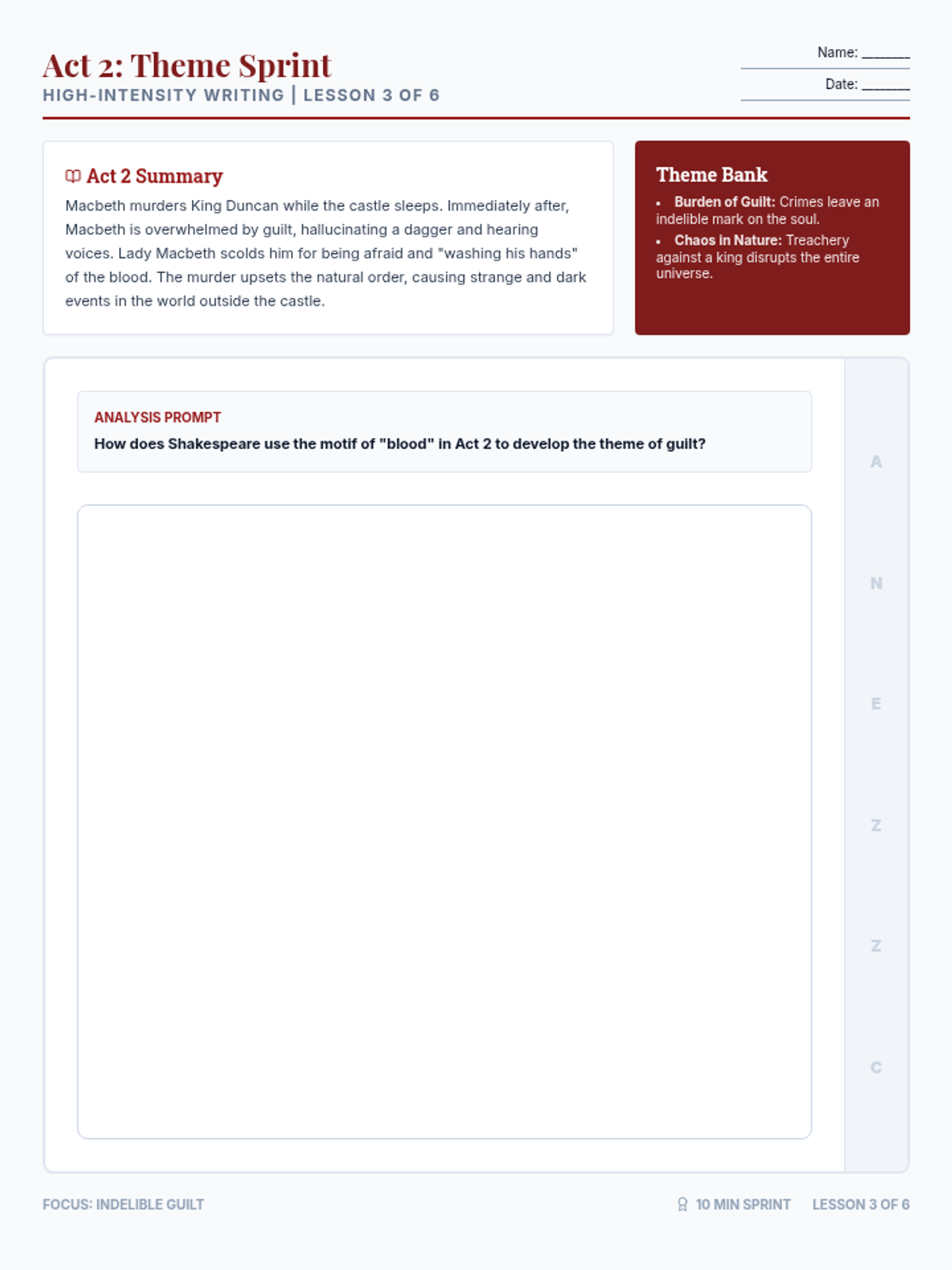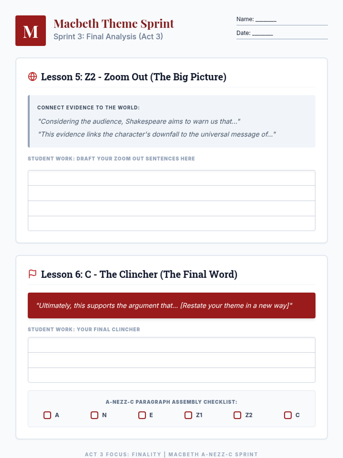 A high-intensity, six-part reteach sequence focusing on theme development in Macbeth using the A-NEZZ-C writing framework for 9th-grade English students.