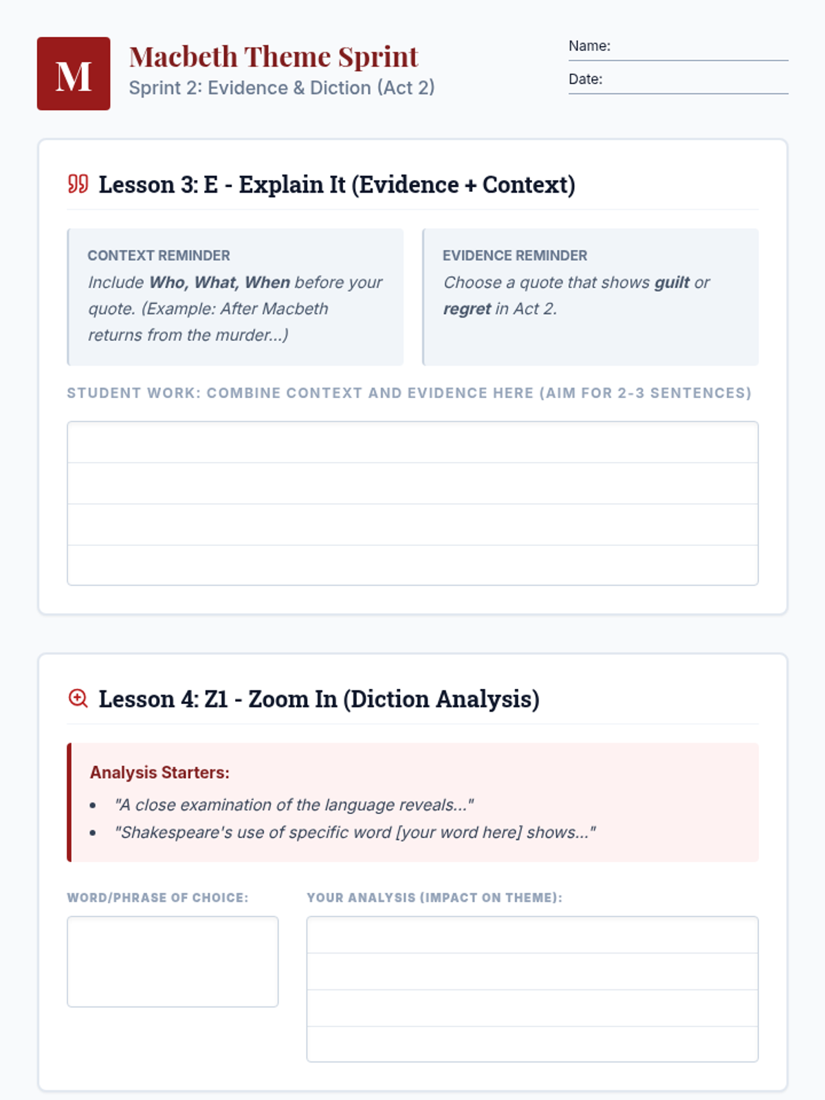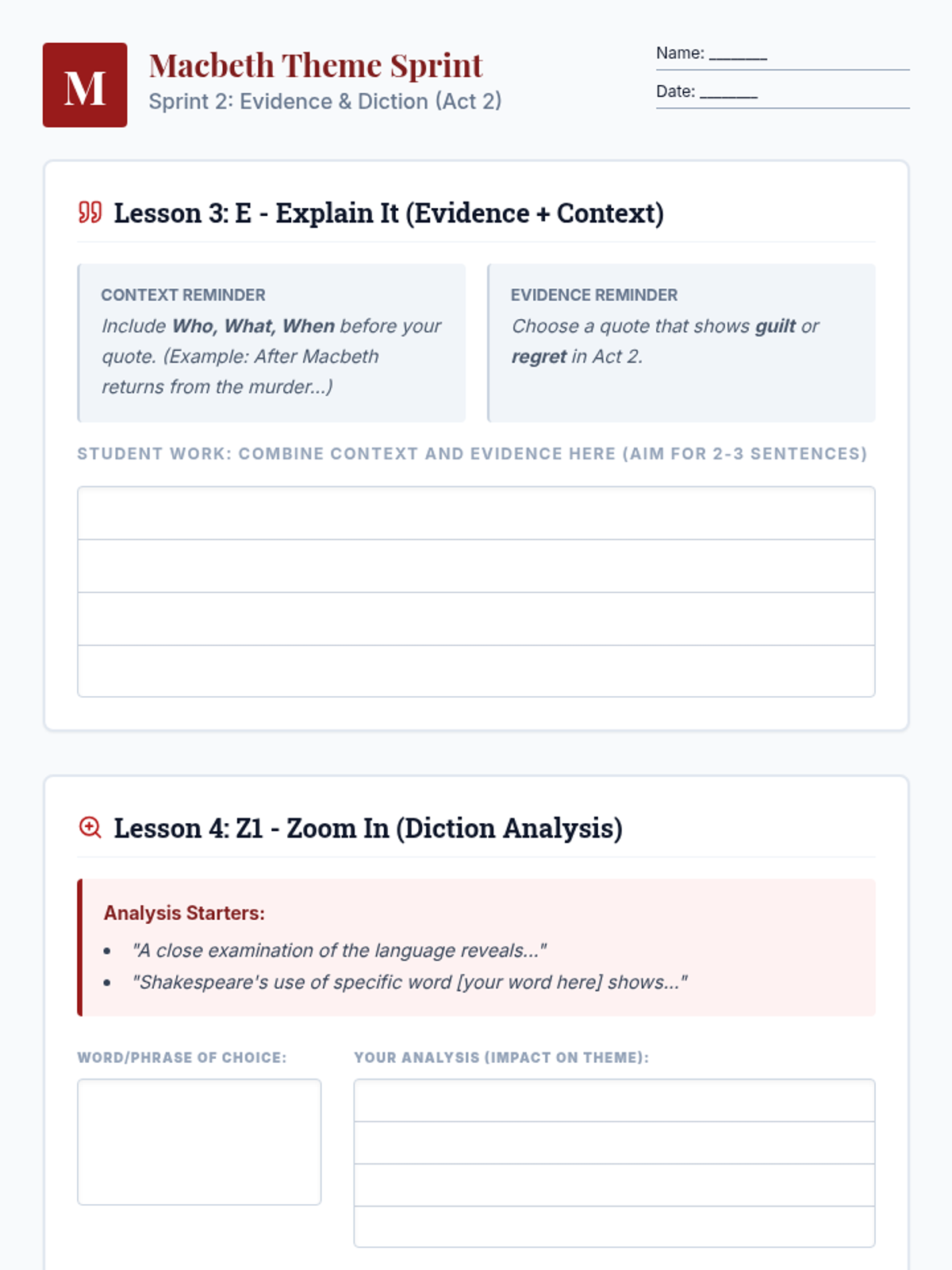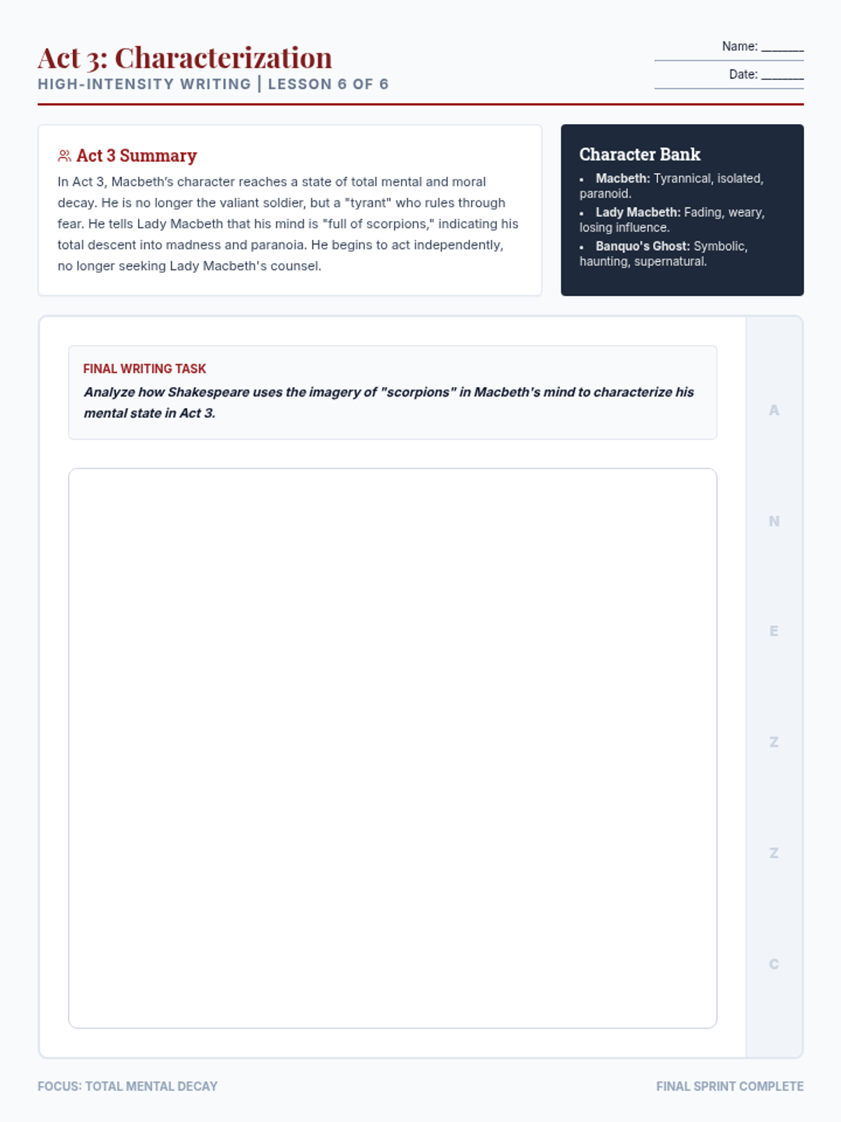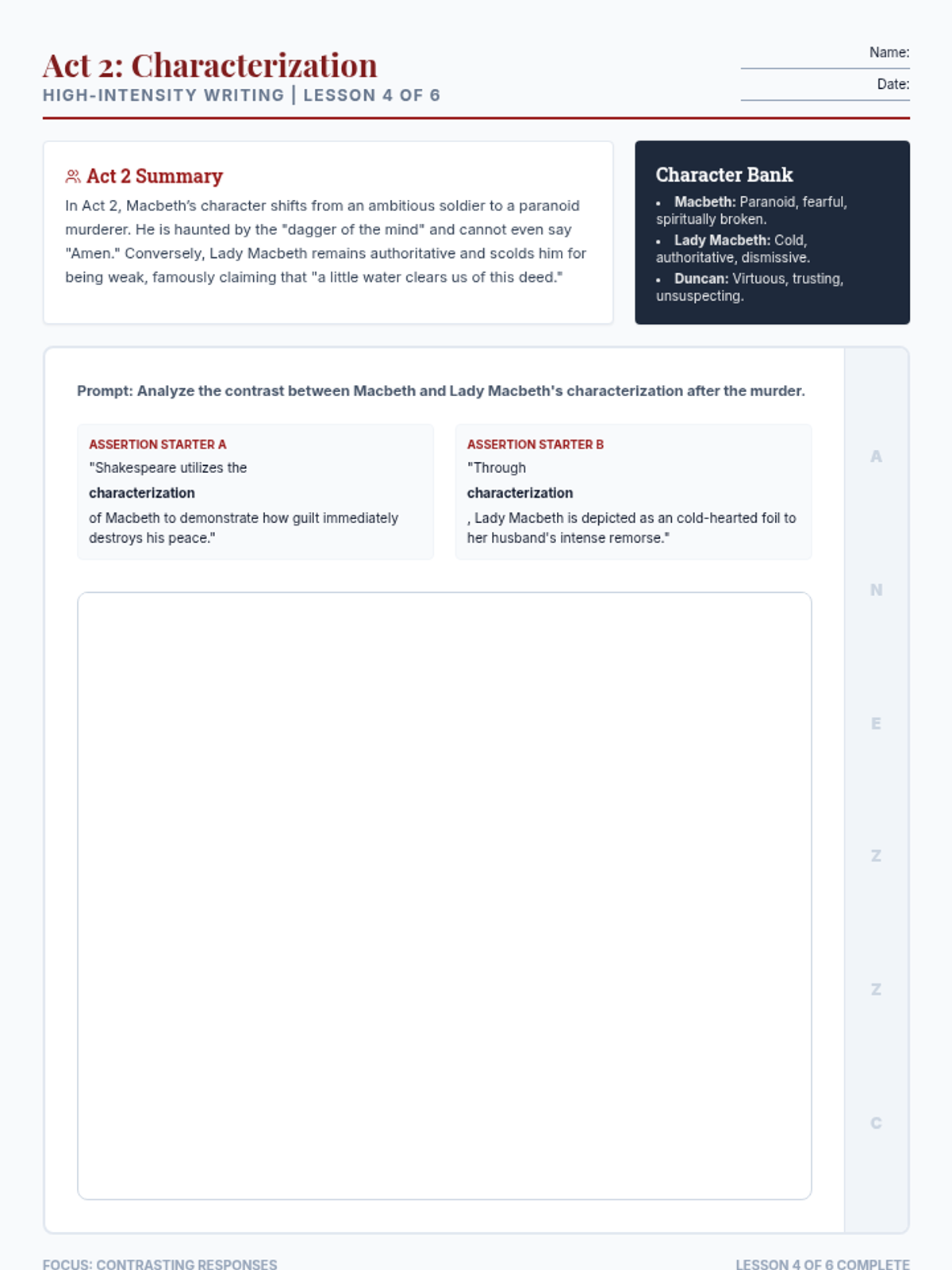 A high-intensity, six-part reteach sequence focusing on theme development in Macbeth using the A-NEZZ-C writing framework for 9th-grade English students.
