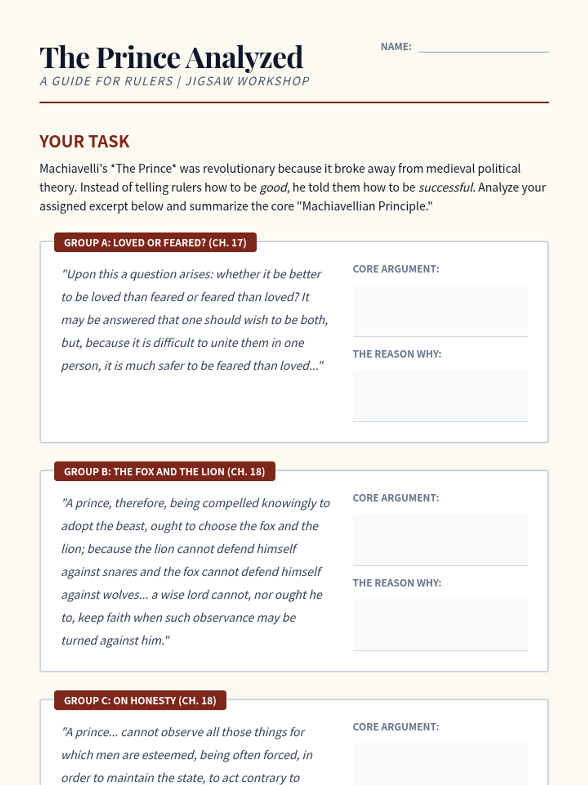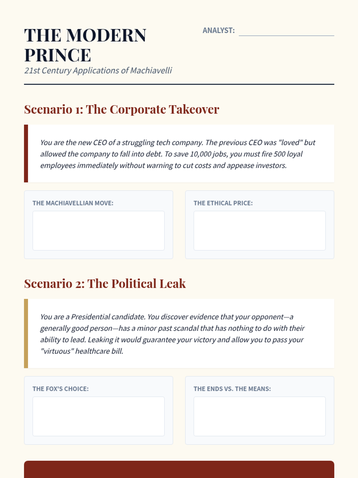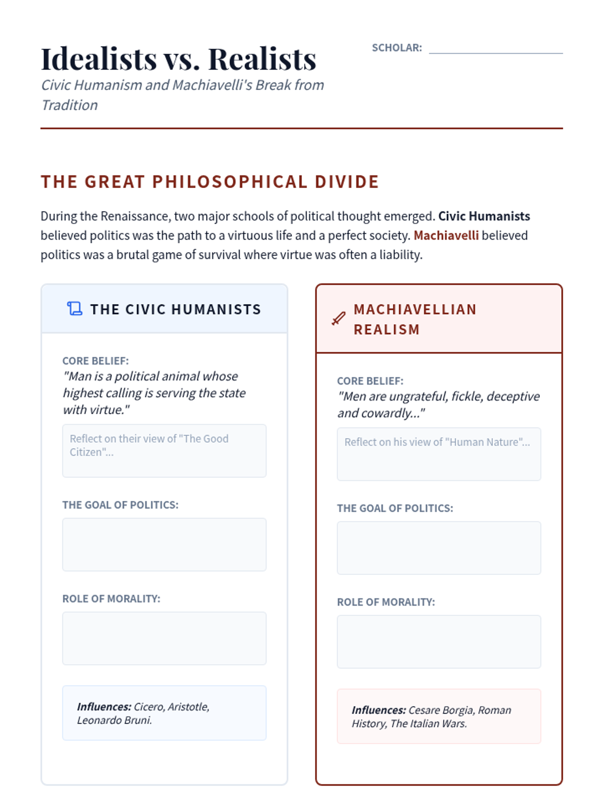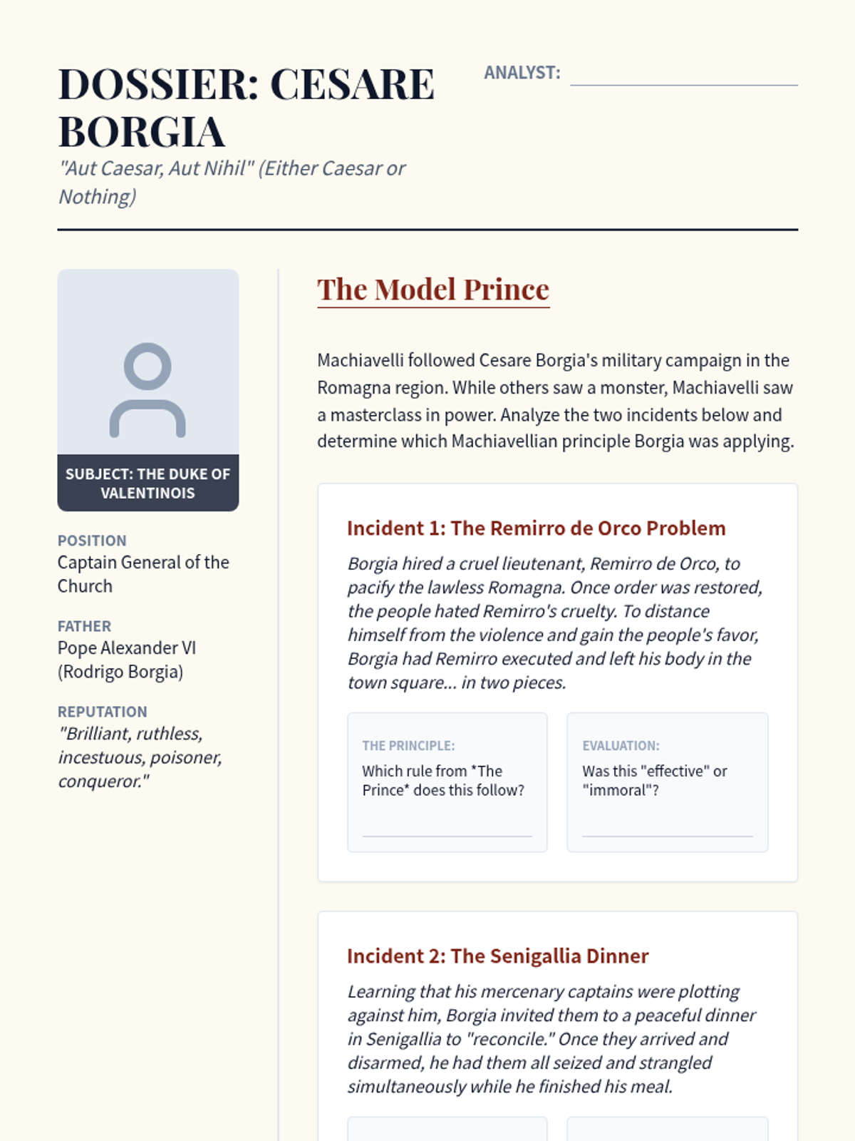 A deep dive into Renaissance political philosophy, focusing on the shift from 'Divine Right' to Machiavellian realism. Students analyze *The Prince*, evaluate historical case studies like Cesare Borgia, and debate the ethics of modern statecraft.
