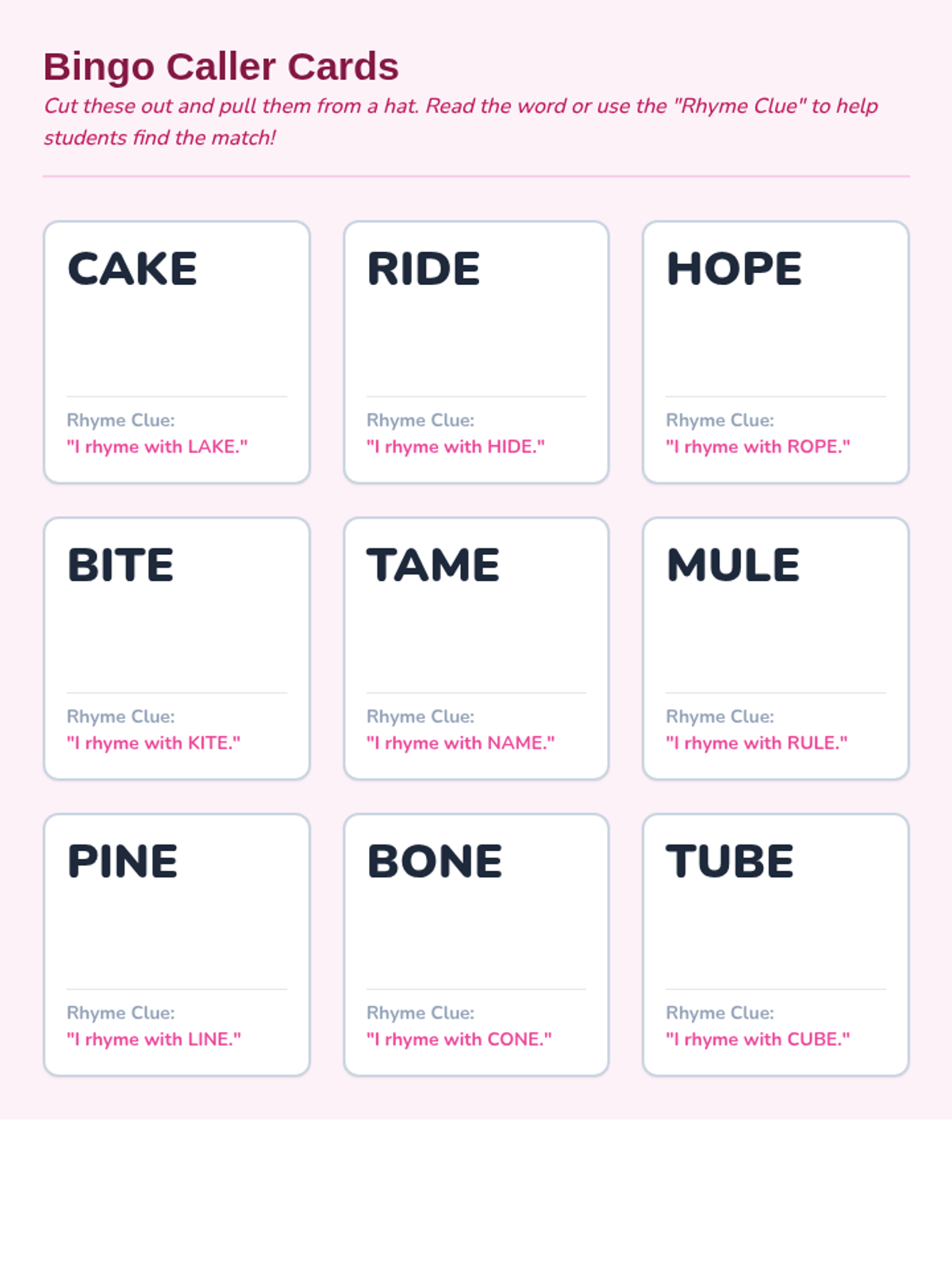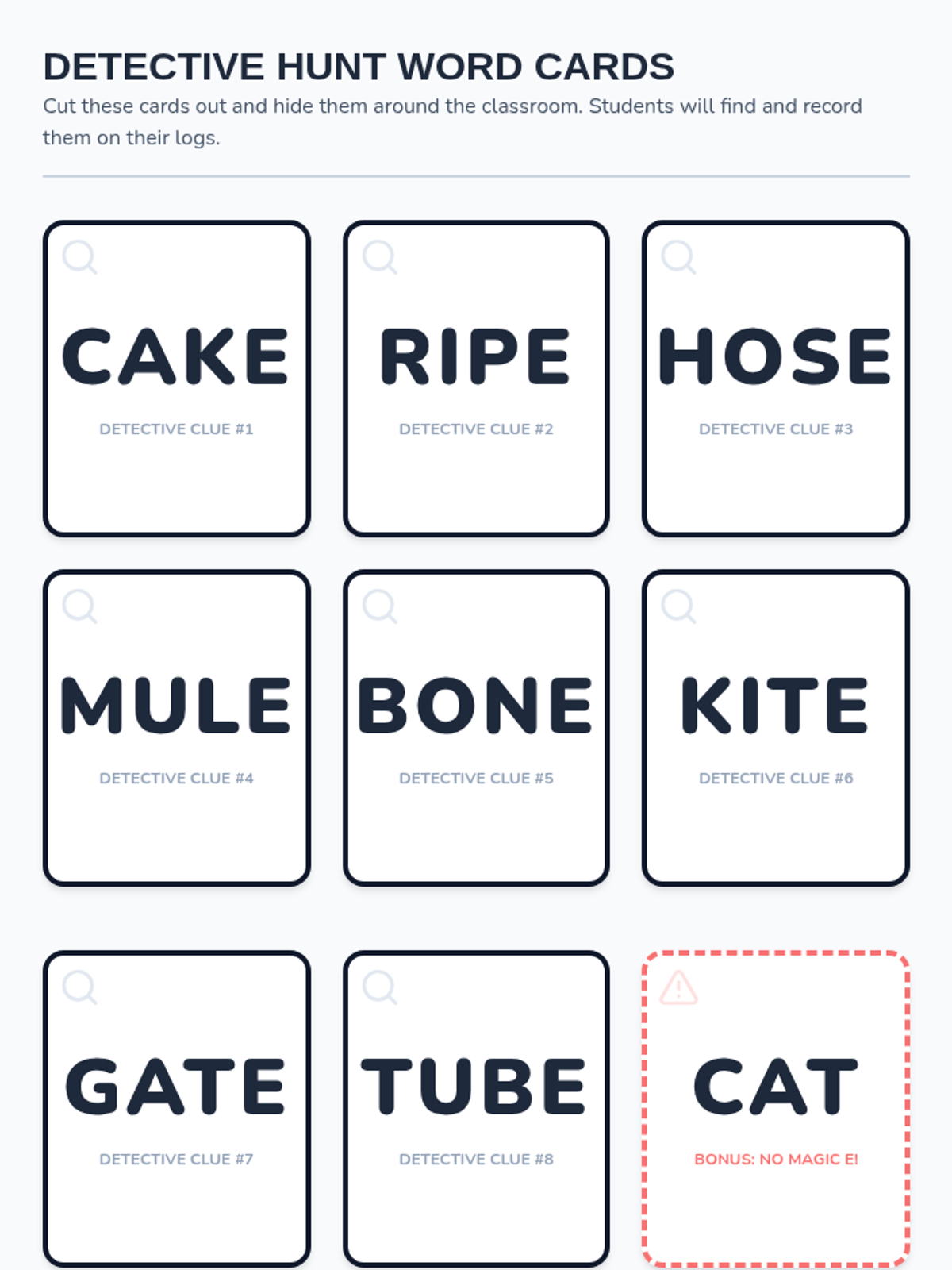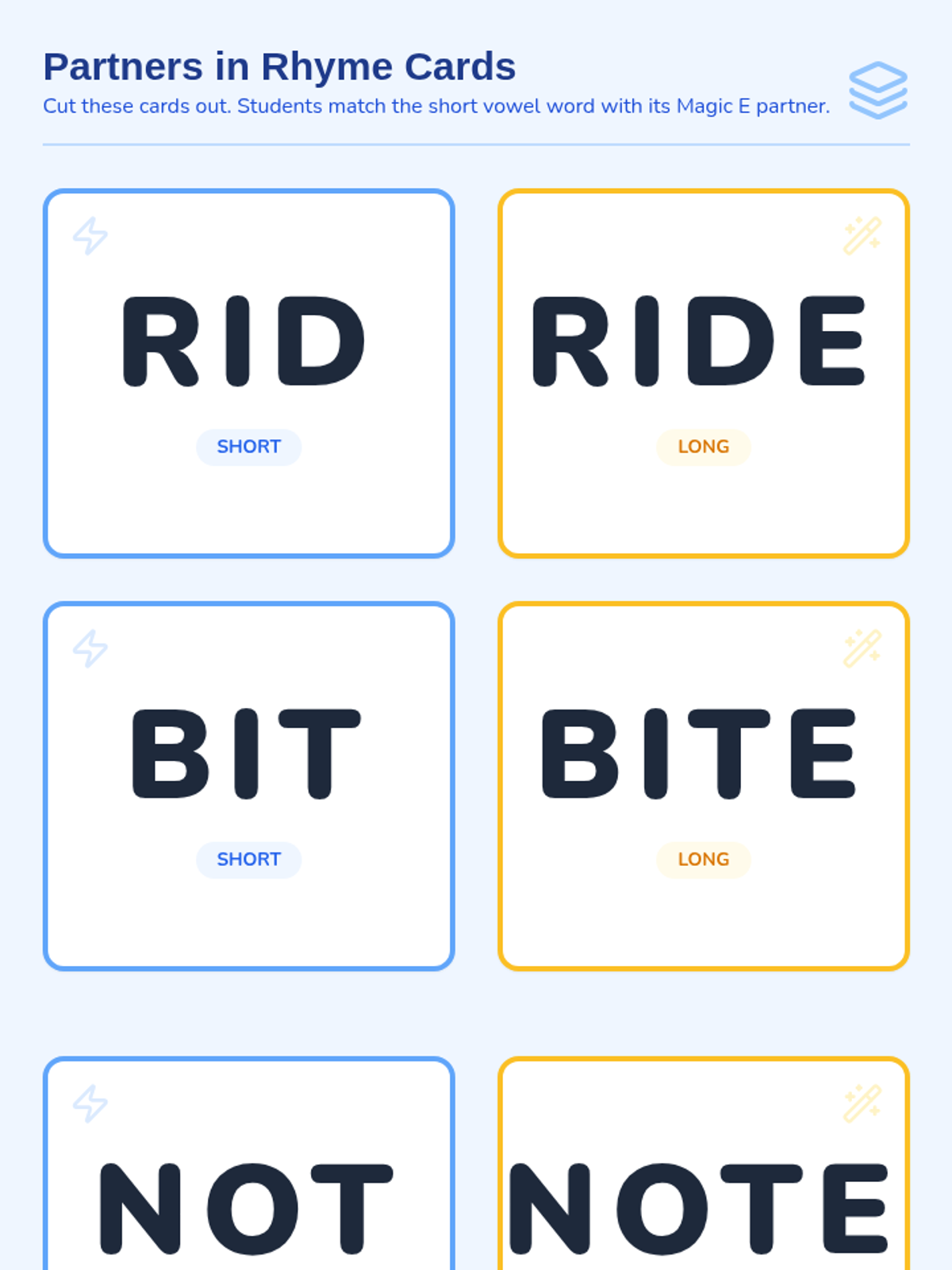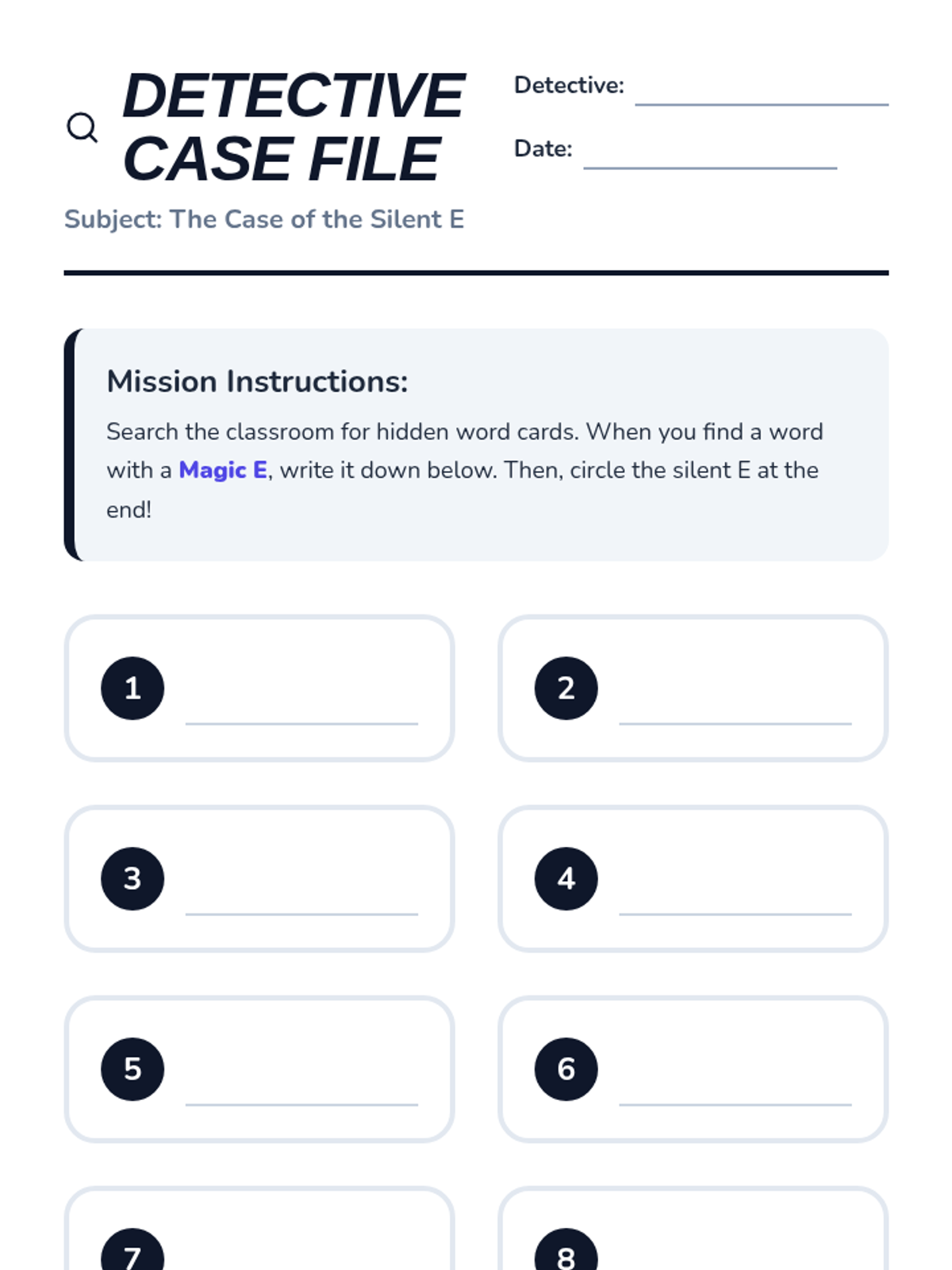A game-based phonics sequence for Kindergarten students focusing on distinguishing short vowel sounds from long vowel sounds created by the 'Magic E'. Students engage in gross motor activities, scavenger hunts, and collaborative games to build decoding fluency.