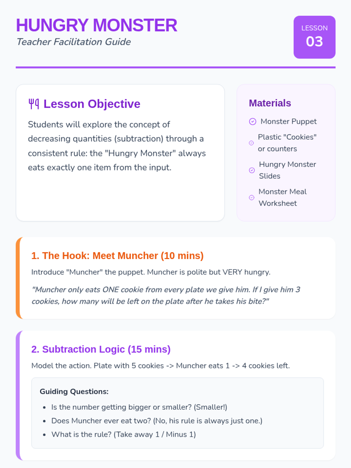 A foundational math sequence for Kindergarten students requiring academic support. This unit uses tactile manipulatives (counters, cubes) to build one-to-one correspondence, cardinality, and number conservation through high-engagement 'Counting Critter' activities.