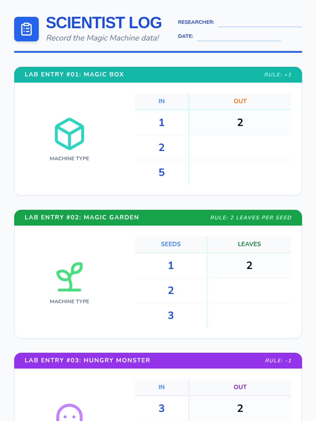 A Kindergarten math sequence exploring early algebraic thinking through the 'Magic Number Machine' metaphor. Students investigate input-output relationships, quantitative growth, and functional rules using concrete manipulatives and simple tables.