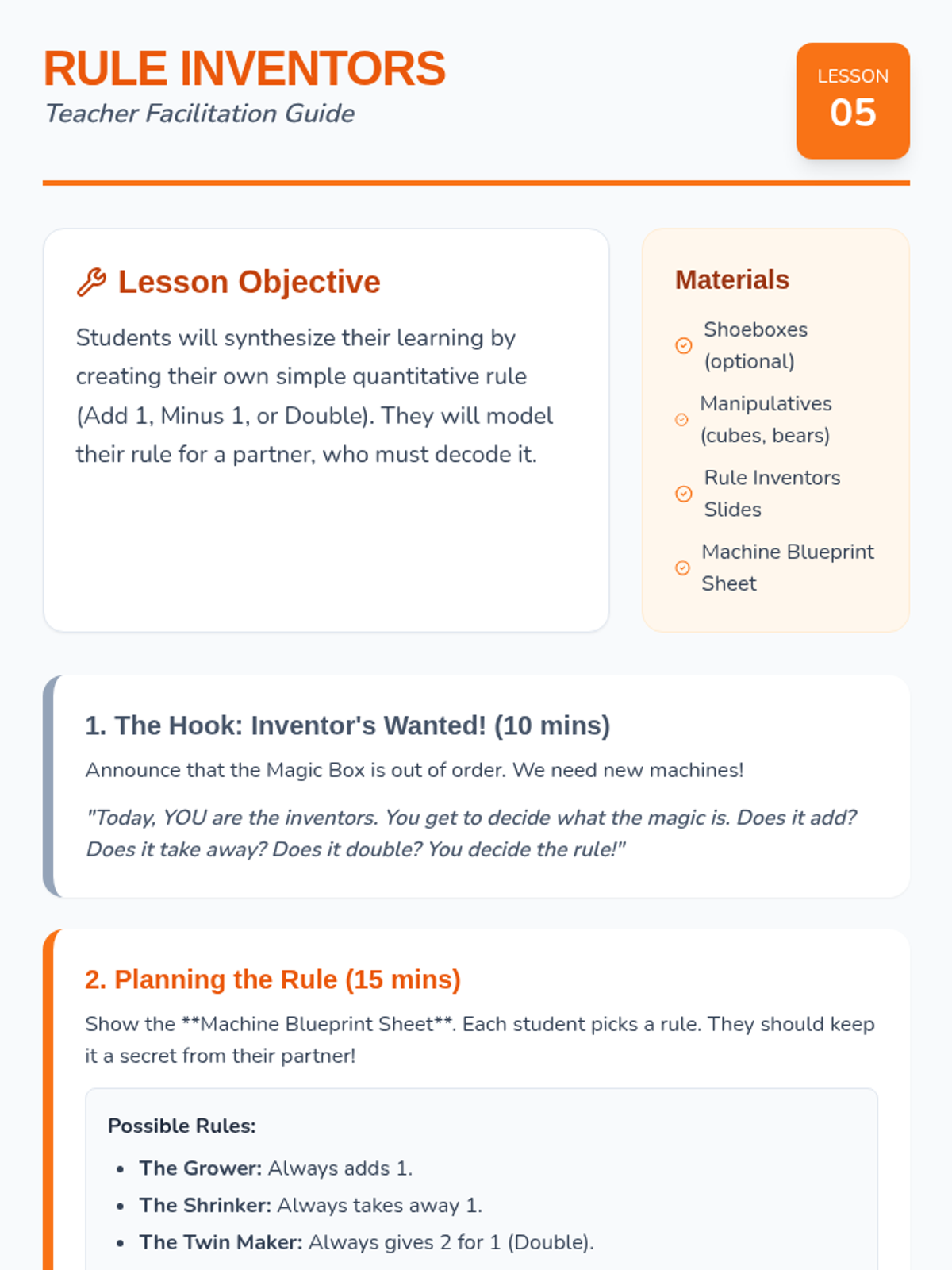 This sequence introduces Kindergarten students to the conceptual framework of part-part-whole relationships using visual number bonds. Through tactile sorting, graphic organizers, and story mapping, students develop the foundational skills necessary for addition and subtraction.